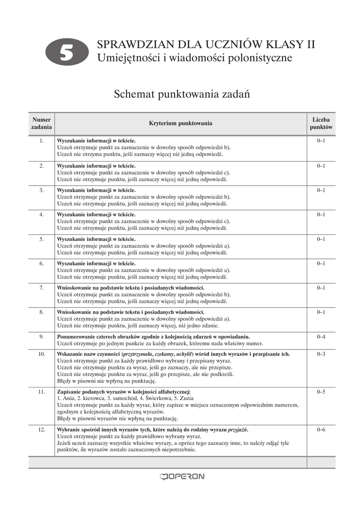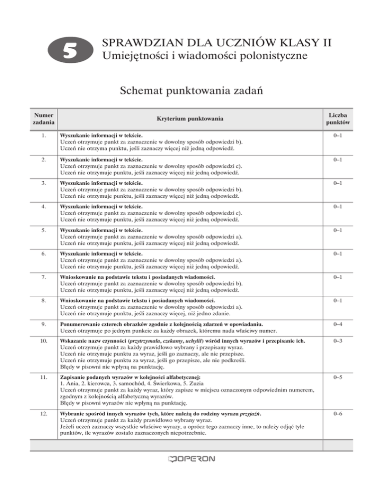 5 SprAwdZiAn dlA UcZniów klASy ii Umiejętności i wiadomości polonistyczne Schemat punktowania zadań Numer zadania Kryterium punktowania Liczba punktów 1. Wyszukanie informacji w tekście. Uczeń otrzymuje punkt za zaznaczenie w dowolny sposób odpowiedzi b). Uczeń nie otrzyma punktu, jeśli zaznaczy więcej niż jedną odpowiedź. 0–1 2. Wyszukanie informacji w tekście. Uczeń otrzymuje punkt za zaznaczenie w dowolny sposób odpowiedzi c). Uczeń nie otrzymuje punktu, jeśli zaznaczy więcej niż jedną odpowiedź. 0–1 3. Wyszukanie informacji w tekście. Uczeń otrzymuje punkt za zaznaczenie w dowolny sposób odpowiedzi b). Uczeń nie otrzymuje punktu, jeśli zaznaczy więcej niż jedną odpowiedź. 0–1 4. Wyszukanie informacji w tekście. Uczeń otrzymuje punkt za zaznaczenie w dowolny sposób odpowiedzi c). Uczeń nie otrzymuje punktu, jeśli zaznaczy więcej niż jedną odpowiedź. 0–1 5. Wyszukanie informacji w tekście. Uczeń otrzymuje punkt za zaznaczenie w dowolny sposób odpowiedzi a). Uczeń nie otrzymuje punktu, jeśli zaznaczy więcej niż jedną odpowiedź. 0–1 6. Wyszukanie informacji w tekście. Uczeń otrzymuje punkt za zaznaczenie w dowolny sposób odpowiedzi a). Uczeń nie otrzymuje punktu, jeśli zaznaczy więcej niż jedną odpowiedź. 0–1 7. Wnioskowanie na podstawie tekstu i posiadanych wiadomości. Uczeń otrzymuje punkt za zaznaczenie w dowolny sposób odpowiedzi b). Uczeń nie otrzymuje punktu, jeśli zaznaczy więcej niż jedną odpowiedź. 0–1 8. Wnioskowanie na podstawie tekstu i posiadanych wiadomości. Uczeń otrzymuje punkt za zaznaczenie w dowolny sposób odpowiedzi a). Uczeń nie otrzymuje punktu, jeśli zaznaczy więcej, niż jedno zdanie. 0–1 9. Ponumerowanie czterech obrazków zgodnie z kolejnością zdarzeń w opowiadaniu. Uczeń otrzymuje po jednym punkcie za każdy obrazek, któremu nada właściwy numer. 0–4 10. Wskazanie nazw czynności (przytrzymała, czekamy, uchylił) wśród innych wyrazów i przepisanie ich. Uczeń otrzymuje punkt za każdy prawidłowo wybrany i przepisany wyraz. Uczeń nie otrzymuje punktu za wyraz, jeśli go zaznaczy, ale nie przepisze. Uczeń nie otrzymuje punktu za wyraz, jeśli go przepisze, ale nie podkreśli. Błędy w pisowni nie wpłyną na punktację. 0–3 11. Zapisanie podanych wyrazów w kolejności alfabetycznej: 1. Ania, 2. kierowca, 3. samochód, 4. Świerkowa, 5. Zuzia Uczeń otrzymuje punkt za każdy wyraz, który zapisze w miejscu oznaczonym odpowiednim numerem, zgodnym z kolejnością alfabetyczną wyrazów. Błędy w pisowni wyrazów nie wpłyną na punktację. 0–5 12. Wybranie spośród innych wyrazów tych, które należą do rodziny wyrazu przyjaźń. Uczeń otrzymuje punkt za każdy prawidłowo wybrany wyraz. Jeżeli uczeń zaznaczy wszystkie właściwe wyrazy, a oprócz tego zaznaczy inne, to należy odjąć tyle punktów, ile wyrazów zostało zaznaczonych niepotrzebnie. 0–6 Numer zadania Liczba punktów Kryterium punktowania 13. Uzupełnienie zdań czasownikami z końcówką -ują, -uje. Uczeń otrzymuje punkt za każdy odpowiednio dobrany i poprawnie zapisany czasownik. Jeżeli uczeń zastosuje czasownik niemający końcówki -ują, -uje, ale pasujący do zdania i prawidłowo go zapisze, to otrzymuje punkt. 0–4 14. Uzupełnienie zdań dotyczących bezpiecznego zachowania się czasownikami z przeczeniem nie podanymi do wyboru. Uczeń otrzymuje po jednym punkcie za uzupełnienie każdego zdania odpowiednim czasownikiem, pod warunkiem, że dany czasownik zostanie prawidłowo zapisany. czasowniki, które występują na początku zdania, powinny zostać zapisane wielką literą. 0–4 15. Ułożenie i zapisanie przynajmniej czterech zdań mówiących o tym, jak należy zareagować na propozycję nieznajomego. Uczeń otrzymuje po jednym punkcie za spełnienie następujących kryteriów: – napisanie pracy zgodnej z podanym tematem; – uzasadnienie, dlaczego nie wolno skorzystać z propozycji obcego; – napisanie przynajmniej czterech zdań; – napisanie wielkiej litery na początku zdań; – zakończenie zdań kropką; – zapisanie pracy czytelnie i z dbałością o estetykę. w kryteriach czwartym i piątym jeden błąd nie wpłynie na punktację. 0–6 Suma punktów do zdobycia: 40