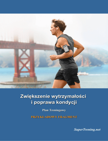 Zwiększenie wytrzymałości i poprawa kondycji Plan Treningowy PRZYKŁADOWY FRAGMENT SuperTrening.net Spis treści Wstęp....................................................................................................................................................2 Rola diety..............................................................................................................................................3 Plan Treningowy...................................................................................................................................6 DZIEŃ I: DŁUGI BIEG: 40 – 80 minut..........................................................................................6 DZIEŃ II: Trening Siłowy..............................................................................................................7 DZIEŃ III: Trening Interwałowy.....................................................................................................7 Trening Interwałowy #2 (do wyboru)..............................................................................................8 DZIEŃ IV: Odpoczynek lub Inny Sport..........................................................................................8 DZIEŃ V: Trening Siłowy...............................................................................................................8 DZIEŃ VI: Bieg Tempowy..............................................................................................................9 DZIEŃ VII: Odpoczynek.................................................................................................................9 Dodatek A: Rozgrzewka przed bieganiem.........................................................................................10 Dodatek B: Ćwiczenia rozciągające...................................................................................................13 Dodatek C: Trening siłowy biegaczy.................................................................................................16 Plan pochodzi z serwisu SuperTrening.net 2 Wstęp Wstęp Czy uprawiasz sport, podczas którego musisz dużo biegać, czy jesteś biegaczem, który chce poprawić swoje wyniki – ten program jest właśnie dla Ciebie. Poradnik zawiera plan rozłożony na każdy dzień tygodnia uwzględniający 3 treningi biegowe o różnej długości i intensywności. Poza tym składa się z przykładowych ćwiczeń rozgrzewających, rozciągających oraz ćwiczeń siłowych. Dodatkowo poradnik wzbogacony jest o zasady zdrowej diety, która jest nieodłączną częścią aktywnego trybu życia. Plan pochodzi z serwisu SuperTrening.net 3 Rola diety Rola diety Odżywianie jest istotną częścią treningu fizycznego. Prawidłowa, zdrowa dieta dodaje dużo energii każdego dnia oraz dostarcza Twojemu organizmowi niezbędnych składników odżywczych potrzebnych do regeneracji mięśni po wysiłku fizycznym. Oto kilka ważnych wskazówek zdrowego odżywiania: 1. Jedz regularnie 5 -6 razy dziennie. 2. Śpij nie mniej niż 7- 8 godzin. 3. Pij co najmniej 8 szklanek wody dziennie. 4. Dbaj o odpowiedni skład diety. Twoja codzienna dieta powinna składać się z: • 10 - 35% białek • 45 - 60% węglowodanów Ciąg dalszy Poradnika dostępny jest w pełnej wersji planu treningowego dostępnego w serwisie SuperTrening.net Plan pochodzi z serwisu SuperTrening.net 4 Plan Treningowy Plan Treningowy DZIEŃ I: DŁUGI BIEG: 40 – 80 minut 1. Czas trwania długiego biegu zależy od Twojego zaawansowania, staraj się, żeby trwał on od 40 minut do nawet 80 minut. 2. Stopień intensywności spokojnego biegu wynosi 60%- 70% Twojego maksymalnego tętna (maxHR) - swoje maksymalne tętno możesz sprawdzić w Kalkulatorze Stref Treningowych. Jak ją sprawdzić? Kontrolując swoje tętno podczas treningu biegowego, możesz zwiększyć spalanie tkanki tłuszczowej lub/i zwiększyć swoją kondycję. W celu ustalenia rzeczywistego tętna maksymalnego musisz przejść specjalistyczny test wysiłkowy ustalający indywidualne tętno maksymalne albo możesz sprawdzić swoje przybliżone tętno maksymalne w naszym Kalkulatorze Stref Treningowych. Jeżeli nie masz ochoty sprawdzać swojego tętna podczas biegu, to staraj się utrzymać prędkość pozwalającą Ci na swobodną konwersację podczas treningu, wtedy Twoje tętno będzie zbliżone do pożądanej wartości. 3. Dlaczego długi, spokojny bieg jest tak ważny: Długi, spokojny bieg jest ważnym elementem planu treningowego dla każdego biegacza, gdyż: Ciąg dalszy planu treningowego na kolejne dni dostępny jest w pełnej wersji planu treningowego dostępnego w serwisie SuperTrening.net Plan pochodzi z serwisu SuperTrening.net 5 Dodatek A: Rozgrzewka przed bieganiem Dodatek A: Rozgrzewka przed bieganiem Ćwiczenia rozgrzewające przygotowują twój organizm do zwiększonego wysiłku oraz rozgrzewają nasze mięśnie i stawy. To podczas rozgrzewki krew pompowana jest do mięśni i stawów, zaopatrując je w substancje odżywcze i tlen. Właśnie dlatego główną jej zaletą jest zmniejszenie ryzyka urazów podczas treningów, jak również zwiększenie wydajności wykonywanych ćwiczeń. Wykrok do przodu po 5 razy na kadzą nogę Wykonaj krok w przód prawą nogą, uginając kolano do kąta 90 stopni, kolano lewej nogi powinno niemal dotknąć podłoża. Następnie powróć do pozycji wyjściowej i powtórz ćwiczenie drugą nogą. Plecy powinny być wyprostowane przez cały czas trwania ćwiczenia. Ćwiczone mięśnie: mięśnie czworogłowe uda, mięśnie pośladków Wykrok w przód ze skrętem tułowia: 5 x każda noga Wykonaj krok w przód prawą nogą, uginając kolano do kąta 90 stopni, kolano lewej nogi powinno niemal dotknąć podłoża. Wykonaj skręt tułowia w prawo. Następnie powróć do pozycji wyjściowej i powtórz ćwiczenie drugą nogą. Plecy powinny być wyprostowane przez czas trwania całego ćwiczenia. Ćwiczone mięśnie: mięśnie czworog