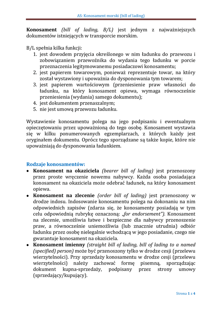 AS: Konosament morski (bill of lading) Konosament (bill of lading, B/L) jest jednym z najważniejszych dokumentów istniejących w transporcie morskim. B/L spełnia kilka funkcji: 1. jest dowodem przyjęcia określonego w nim ładunku do przewozu i zobowiązaniem przewoźnika do wydania tego ładunku w porcie przeznaczenia legitymowanemu posiadaczowi konosamentu; 2. jest papierem towarowym, ponieważ reprezentuje towar, na który został wystawiony i upoważnia do dysponowania tym towarem; 3. jest papierem wartościowym (przeniesienie praw własności do ładunku, na który konosament opiewa, wymaga równocześnie przeniesienia (wydania) samego dokumentu); 4. jest dokumentem przenaszalnym; 5. nie jest umową przewozu ładunku. Wystawienie konosamentu polega na jego podpisaniu i ewentualnym opieczętowaniu przez upoważnioną do tego osobę. Konosament wystawia się w kilku ponumerowanych egzemplarzach, z których każdy jest oryginałem dokumentu. Oprócz tego sporządzane są także kopie, które nie upoważniają do dysponowania ładunkiem. Rodzaje konosamentów: Konosament na okaziciela (bearer bill of lading) jest przenoszony przez proste wręczenie nowemu nabywcy. Każda osoba posiadająca konosament na okaziciela może odebrać ładunek, na który konosament opiewa. Konosament na zlecenie (order bill of lading) jest przenoszony w drodze indosu. Indosowanie konosamentu polega na dokonaniu na nim odpowiednich zapisów (zdarza się, że konosamenty posiadają w tym celu odpowiednią rubrykę oznaczoną: „for endorsement"). Konosament na zlecenie, umożliwia łatwe i bezpieczne dla nabywcy przenoszenie praw, a równocześnie uniemożliwia (lub znacznie utrudnia) odbiór ładunku przez osobę nielegalnie wchodzącą w jego posiadanie, czego nie gwarantuje konosament na okaziciela. Konosament imienny (straight bill of lading, bill of lading to a named (specified) person) może być przenoszony tylko w drodze cesji (przelewu wierzytelności). Przy sprzedaży konosamentu w drodze cesji (przelewu wierzytelności) należy zachować formę pisemną, sporządzając dokument kupna-sprzedaży, podpisany przez strony umowy (sprzedający/kupujący). Strona 1 z 4 AS: Konosament morski (bill of lading) Konosament przyjęcia do załadowania (received for shipment bill of lading) potwierdza fakt przejęcia ładunku przez przewoźnika, lecz nie stanowi dowodu, że ładunek znalazł się na konkretnym statku. Konosament ten stanowi zobowiązanie przewoźnika do załadowania ładunku na pierwszy odchodzący we właściwym kierunku statek danej linii. Konosament załadowania (shipped bill of lading, on board bill of lading), stanowi dowód przyjęcia ładunku na konkretny statek. Konosament czysty (clean bill of lading) nie zawiera klauzul (zapisów) stwierdzających jednoznacznie wadliwy stan ładunku lub uszkodzenie opakowania. Konosament brudny (nieczysty, zaklauzulowany, dirty bill of lading, unclean bili of lading) zawiera klauzule restrykcyjne stwierdzających jednoznacznie wadliwy stan ładunku lub uszkodzenie opakowania, co obniża jego wartość handlową. Konosament czarterowy (charter party bill of fading) wystawiany jest przy przewozach wykonywanych na podstawie czarterów. W konosamencie czarterowym pierwsza strona jest czysta, lub umieszczone są tam jedynie wybrane podstawowe z odesłaniem do szczegółowych warunków umowy czarterowej. Konosament liniowy (liner bill of lading) zawiera na stronie pierwszej liczne klauzule, szczegółowo określające warunki przewozu ładunku. Konosament przeładunkowy (transhipment bill of lading) wystawiany jest w sytuacji, gdy w trakcie przewozu ładunek przeładowywany będzie na inny statek tego samego armatora. Nie następuje więc zmiana ani rodzaju transportu (gałęzi transportu) ani armatora. Konosament bezpośredni (Through bill of lading) wystawiany jest w dwóch sytuacjach. W pierwszej, gdy przewóz ładunku odbywa się jedynie morzem, ale ładunek przewożony jest statkami różnych armatorów i w drugiej, gdy ładunek przewożony jest różnymi środkami transportu, przy czym występować musi morski odcinek przewozu. Charakterystyczną cechą konosamentu bezpośredniego jest ograniczenie odpowiedzialności poszczególnych przewoźników jedynie do odcinków, na których sami dokonują przewozu. Konosament bezpośredni stwarza szereg komplikacji prawnych, bowiem do jednego i tego samego dokumentu należy stosować różne - zależnie od sytuacji akty prawne właściwe dla po szczególnych stadiów transportu. Nie może on pełnić wszystkich funkcji konosamentu. Konosament lokalny (local bill of lading), przewozowe listy kolejowe, lotnicze czy żeglugowe (gdy występuje zmiana środka transportu). Dokumenty te regulują stosunki prawne pomiędzy wystawcą Strona 2 z 4 AS: Konosament morski (bill of lading) konosamentu bezpośredniego, (gałęziowymi). a przewoźnikami odcinkowymi Podstawowe klauzule (rubryki) konosamentu Uregulowania występujące w każdym konosamencie: zakres odpowiedzialności przewoźnika za ładunek, limity odpowiedzialności; zasady płatności frachtu, warunki przeładunku i wydania ładunku; zastaw na ładunku, przewóz ładunków niebezpiecznych; klauzule określające zasady postępowania i/lub zakres odpowiedzialności przewoźnika w sytuacjach szczególnych. Na pierwszej stronie konosamentu liniowego umieszczone są warunki przewozu określone przez przewoźnika, z uwzględnieniem obowiązujących przepisów prawnych (konwencji międzynarodowych, prawa lokalnego) oraz usankcjonowanych zwyczajów (wynikających ze stosowanej praktyki i różnego typu ujednoliconych reguł, opracowywanych przez organizacje międzynarodowe). Druga strona konosamentu zawiera klauzule (rubryki), które są każdorazowo wypełniane przed podpisaniem dokumentu. W prawym górnym rogu konosamentu umieszczany jest zazwyczaj znak firmowy (emblemat) armatora. W lewym górnym rogu znajdują się następujące klauzule (rubryki): Shipper: wpi