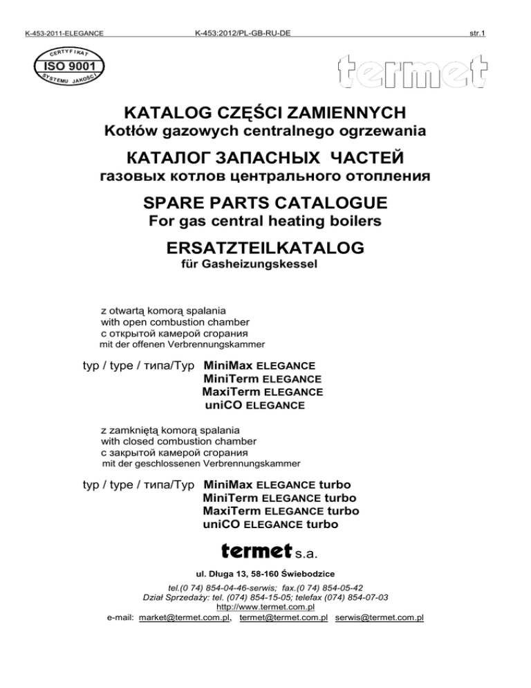 K-453-2011-ELEGANCE CER SY ST E K-453:2012/PL-GB-RU-DE str.1 T Y F I KA T MU J A K O ŚC I KATALOG CZĘŚCI ZAMIENNYCH Kotłów gazowych centralnego ogrzewania КАТАЛОГ ЗАПАСНЫХ ЧАСТЕЙ газовых котлов центрального отопления SPARE PARTS CATALOGUE For gas central heating boilers ERSATZTEILKATALOG für Gasheizungskessel z otwartą komorą spalania with open combustion chamber с открытой камерой сгорания mit der offenen Verbrennungskammer typ / type / типа/Typ MiniMax ELEGANCE MiniTerm ELEGANCE MaxiTerm ELEGANCE uniCO ELEGANCE z zamkniętą komorą spalania with closed combustion chamber с закрытой камерой сгорания mit der geschlossenen Verbrennungskammer typ / type / типа/Typ MiniMax ELEGANCE turbo MiniTerm ELEGANCE turbo MaxiTerm ELEGANCE turbo uniCO ELEGANCE turbo s.a. ul. Długa 13, 58-160 Świebodzice tel.(0 74) 854-04-46-serwis; fax.(0 74) 854-05-42 Dział Sprzedaży: tel. (074) 854-15-05; telefax (074) 854-07-03 http://www.termet.com.pl e-mail: [email protected], [email protected] [email protected] K-453-2011-ELEGANCE K-453:2012/PL-GB-RU-DE str.2 WPROWADZENIE Katalog części zamiennych kotła grzewczego przeznaczony jest głównie dla sprzedawców i punktów usługowych zajmujących się zamawianiem i rozprowadzaniem części, naprawą i konserwacją kotła w okresie gwarancyjnym i pogwarancyjnym. Katalog zawiera rysunek zestawieniowy kotła na którym pokazane są jego części i zespoły ich położenie i sposób zamocowania w wyrobie. Każda część na rysunku oznaczona jest numerem (pozycją), pod którym w odpowiedniej tabeli podawane są: nazwa, nr rysunku oraz opis miejsca zamontowania. Te części, których nie można było pokazać na rysunku występują w tabelach pod odpowiednią liczba porządkową. Przy zamawianiu określonych części należy powołać się na niniejszy katalog podając pełną nazwę części lub zespołu oraz nr rysunku. INTRODUCTION Spare parts catalogue is dedicated mainly for salesmen and servicing stations that deal with ordering and selling spare parts for boilers as well as repairing and making all maintenance operations of boilers during guarantee period and after it. Spare parts catalogue includes the assembly drawing of the boiler where its components, assemblies and their localisation and way of its fastening in the product are presented on. Every spare part on the drawing has its own number (item), which is stated in a proper table with a name of a part, its drawing number and a description of the a place where a component is installed in. The parts that could not be presented on the drawing are listed in tables below the proper ordinal number. To order a part it is necessary to refer to this Spare Parts Catalogue and give a full name of a spare part or its drawing number. ВВЕДЕНИЕ Каталог запасных частей газовых котлов центрального отоплени предназначен прежде всего для продавцов и фирм занимающихся сервисом, ремонтом, консервацией в течении гарантийного и после гарантийного срока. В каталоге находятся сборочный чертёж который указывает узлы и элементы котла, их расположение и метод крепления в котле. Кажлая часть на сборочном чертеже обозначена номером (позиция) под котором в соответствующей табели находится: наименоване, номер чертежа, описание места установления и вид. Части которых не возможно указать на сборочным чертеже находятся в табели под соответствующим порядковым номером. При заказе определённых части надо создаться на настоящий каталог подавая полное наименование части или узла а также номер чертежа. EINWEISUNG Der Ersatzteilkatalog für die Heizungskessels ist hauptsächlich für Verkäufer und Kundendienst bestimmt, die sich mit Bestellen und Verteilen des Teiles, mit Reparatur und Konservierung des Kessels beschäftigen. Das Verzeichnis enthält die Zusammenstellungszeichnung des Kessels auf welchem sind die Teile, Baugruppen, deren Platzierung und die Art des Befestigung in der Gerät, gezeigt. Jeder Teil ist auf der Zeichnung mit eine Nummer bezeichnet (Position), unter deren, in der angemessenen Tabelle werden die Details mit der Benennung, Zeich.-Nr. und Platzierung, zu finden. Diese Teile, die auf der Zeichnung zu zeigen nicht möglich waren , treten in den Tabellen unter angemessen Ordnungszahl auf. Bei Bestellung bestimmter Details sollte die Benennung oder Bezeichnung der Teile und die Zeichnungsnummer genannt werden. K-453-2011-ELEGANCE K-453:2012/PL-GB-RU-DE Widok ogólny kotłów General view of the boilers Общий вид котлов Totalansicht des Kessels str.3 K-453:2012/PL-GB-RU-DE K-453-2011-ELEGANCE h g 1 2 L MIFLEX N Podstawowe elementy kotła dwufunkcyjnego typ Main component of a combi boiler type Основные элементы двухконтурных котлов типа Hauptbestandsteile des Zweifunktionskessels Typ GCO-DP-13-10 MiniMax ELEGANCE str.4 K-453:2012/PL-GB-RU-DE K-453-2011-ELEGANCE str.5 16 17 27 9 13 10 15 11 18 19 20 26 7 5 4 2 1 25 8 22 33 Podstawowe elementy kotła dwufunkcyjnego typ Main component of a combi boiler type Основные элементы двухконтурных котлов типа Hauptbestandsteile des Zweifunktionskessels Typ GCO-DP-21-23 MiniTerm ELEGANCE K-453:2012/PL-GB-RU-DE K-453-2011-ELEGANCE str.6 16 17 1