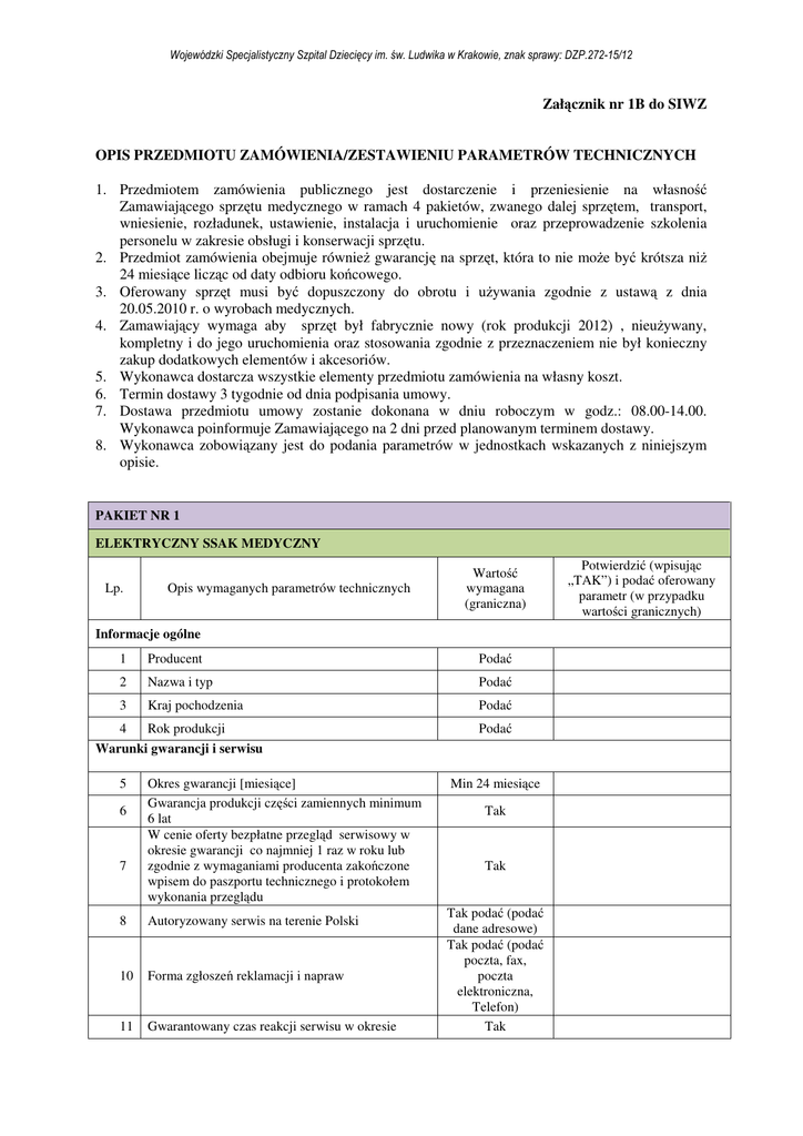 Wojewódzki Specjalistyczny Szpital Dziecięcy im. św. Ludwika w Krakowie, znak sprawy: DZP.272-15/12 Załącznik nr 1B do SIWZ OPIS PRZEDMIOTU ZAMÓWIENIA/ZESTAWIENIU PARAMETRÓW TECHNICZNYCH 1. Przedmiotem zamówienia publicznego jest dostarczenie i przeniesienie na własność Zamawiającego sprzętu medycznego w ramach 4 pakietów, zwanego dalej sprzętem, transport, wniesienie, rozładunek, ustawienie, instalacja i uruchomienie oraz przeprowadzenie szkolenia personelu w zakresie obsługi i konserwacji sprzętu. 2. Przedmiot zamówienia obejmuje również gwarancję na sprzęt, która to nie może być krótsza niż 24 miesiące licząc od daty odbioru końcowego. 3. Oferowany sprzęt musi być dopuszczony do obrotu i używania zgodnie z ustawą z dnia 20.05.2010 r. o wyrobach medycznych. 4. Zamawiający wymaga aby sprzęt był fabrycznie nowy (rok produkcji 2012) , nieużywany, kompletny i do jego uruchomienia oraz stosowania zgodnie z przeznaczeniem nie był konieczny zakup dodatkowych elementów i akcesoriów. 5. Wykonawca dostarcza wszystkie elementy przedmiotu zamówienia na własny koszt. 6. Termin dostawy 3 tygodnie od dnia podpisania umowy. 7. Dostawa przedmiotu umowy zostanie dokonana w dniu roboczym w godz.: 08.00-14.00. Wykonawca poinformuje Zamawiającego na 2 dni przed planowanym terminem dostawy. 8. Wykonawca zobowiązany jest do podania parametrów w jednostkach wskazanych z niniejszym opisie. PAKIET NR 1 ELEKTRYCZNY SSAK MEDYCZNY Lp. Opis wymaganych parametrów technicznych Wartość wymagana (graniczna) Informacje ogólne 1 Producent Podać 2 Nazwa i typ Podać 3 Kraj pochodzenia Podać 4 Rok produkcji Warunki gwarancji i serwisu 5 6 7 Okres gwarancji [miesiące] Gwarancja produkcji części zamiennych minimum 6 lat W cenie oferty bezpłatne przegląd serwisowy w okresie gwarancji co najmniej 1 raz w roku lub zgodnie z wymaganiami producenta zakończone wpisem do paszportu technicznego i protokołem wykonania przeglądu 8 Autoryzowany serwis na terenie Polski 10 Forma zgłoszeń reklamacji i napraw 11 Gwarantowany czas reakcji serwisu w okresie Podać Min 24 miesiące Tak Tak Tak podać (podać dane adresowe) Tak podać (podać poczta, fax, poczta elektroniczna, Telefon) Tak Potwierdzić (wpisując „TAK”) i podać oferowany parametr (w przypadku wartości granicznych) Wojewódzki Specjalistyczny Szpital Dziecięcy im. św. Ludwika w Krakowie, znak sprawy: DZP.272-15/12 gwarancji maks.2 dni robocze od zgłoszenia 12 13 14 Dokumentacja technicznej/serwisowej możliwej do przekazania na potrzeby Zamawiającego W przypadku awarii w okresie gwarancji: dostawa aparatu zastępczego w ciągu 72 godzin od chwili zgłoszenia Wraz z dostawą komplet materiałów dotyczących instalacji urządzenia oraz 2 sztuki instrukcji obsługi w języku polskim Tak Tak Tak Opis parametrów 15 Maksymalny przepływ 60 L / min Tak 16 Maksymalne podciśnienie - 90 kpa Tak 17 Czas pracy: praca ciągła Tak 18 Butle do sterylizacji z poliwęglanu Z zastawką zabezpieczającą przed przepełnieniem ( 2 szt ) Tak 19 Pojemność butli 2 litry Tak 20 Przełącznik do automatycznego wyboru butli ssącej Tak 21 Pedał do sterowania nożnego Tak 22 Wskaźnik i regulator podciśnienia Tak 23 Podstawa jezdna na kółkach Tak 24 Możliwość stosowania wkładów jednorazowych Tak 24 Masa ssaka max 22 kg Tak 26 Wymiary max 475x745x435mm Tak 27 Zasilanie 230 V / 50 Hz Tak Pozostałe wymagania 28 29 30 Szkolenie dla personelu medycznego i technicznego w ilości niezbędnej do zapewnienia prawidłowej pracy przedmiotu zamówienia. Dodatkowe szkolenie w przypadku wyrażenia takiej potrzeby przez personel medyczny. Transport krajowy i zagraniczny wraz z ubezpieczeniem, wszelkie opłaty celne, skarbowe oraz inne opłaty pośrednie po stronie wykonawcy Dojazdy, przyjazdy pracowników serwisu, robocizn oraz inne koszty niezbędne do wykonania czynności gwarancji Tak Tak Tak Wojewódzki Specjalistyczny Szpital Dziecięcy im. św. Ludwika w Krakowie, znak sprawy: DZP.272-15/12 PAKIET NR 2 POMPA INFUZYJNA JEDNOSTRZYKAWKOWA Lp. Opis wymaganych parametrów technicznych Wartość wymagana (graniczna) Informacje ogólne 1. Producent Podać 2. Nazwa i typ Podać 3. Kraj pochodzenia Podać 4. Rok produkcji Podać Warunki gwarancji i serwisu 5. Okres gwarancji [miesiące] Gwarancja produkcji części zamiennych minimum 6 lat W cenie oferty bezpłatne przegląd serwisowy w okresie gwarancji co najmniej 1 raz w roku lub zgodnie z wymaganiami producenta 7. zakończone wpisem do paszportu technicznego i protokołem wykonania przeglądu 6. 8. Autoryzowany serwis na terenie Polski 9. Forma zgłoszeń reklamacji i napraw Gwarantowany czas reakcji serwisu w okresie gwarancji maks.2 dni robocze od zgłoszenia Dokumentacja technicznej/serwisowej 11. możliwej do przekazania na potrzeby Zamawiającego W przypadku awarii w okresie gwarancji: 12. dostawa aparatu zastępczego w ciągu 72 godzin od chwili zgłoszenia Wraz z dostawą komplet materiałów 13. dotyczących instalacji urządzenia oraz 2 sztuki instrukcji obsługi w języku polskim 10. Min 24 miesiące Tak Tak Tak podać (podać dane adresowe) Tak podać (podać poczta, fax, poczta elektroniczna, Telefon) Tak Tak Tak Tak Opis parametrów Możliwość stosowania strzykawek wymiennie na jednym torze Szybkość dozowania od 0,1 do 99,9 ml/h z 15. dokładnością do 0,1 ml/h Możliwość programowania szybkości 16. podawania płynu infuzyjnego Możliwość kontrolowania dawki 17. uderzeniowej na wyświetlaczu przepływu 14. Tak Tak Tak Tak 18. Ciśnienie okluzji 700 mm Hg Tak 19. Funkcja KVO i STAND-BY Tak 20. Alarmy dźwiękowe i sygnalizacja świetlna: Tak Potwierdzić (wpisując „TAK”) i podać oferowany parametr (w przypadku wartości granicznych) Wojewódzki Specjalistyczny Szpital Dziecięcy im. św. Ludwika w Krakowie, znak sprawy: DZP.272-15/12 koniec infuzji, rozładowana KVO, okluzja, bateria, brak zasilania z sieci, pusta strzykawka Zasilanie 230 V i awaryjnie