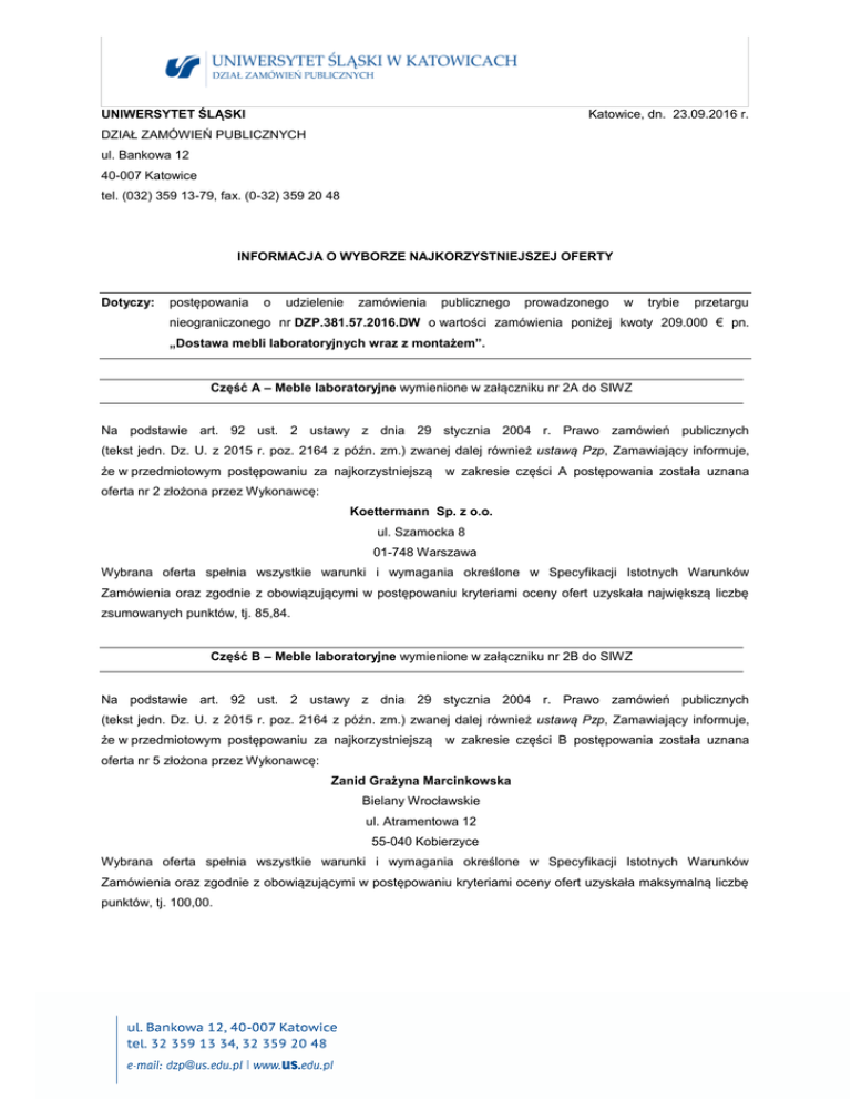 UNIWERSYTET ŚLĄSKI Katowice, dn. 23.09.2016 r. DZIAŁ ZAMÓWIEŃ PUBLICZNYCH ul. Bankowa 12 40-007 Katowice tel. (032) 359 13-79, fax. (0-32) 359 20 48 INFORMACJA O WYBORZE NAJKORZYSTNIEJSZEJ OFERTY Dotyczy: postępowania o udzielenie zamówienia publicznego prowadzonego w trybie przetargu nieograniczonego nr DZP.381.57.2016.DW o wartości zamówienia poniżej kwoty 209.000 € pn. „Dostawa mebli laboratoryjnych wraz z montażem”. Część A – Meble laboratoryjne wymienione w załączniku nr 2A do SIWZ Na podstawie art. 92 ust. 2 ustawy z dnia 29 stycznia 2004 r. Prawo zamówień publicznych (tekst jedn. Dz. U. z 2015 r. poz. 2164 z późn. zm.) zwanej dalej również ustawą Pzp, Zamawiający informuje, że w przedmiotowym postępowaniu za najkorzystniejszą w zakresie części A postępowania została uznana oferta nr 2 złożona przez Wykonawcę: Koettermann Sp. z o.o. ul. Szamocka 8 01-748 Warszawa Wybrana oferta spełnia wszystkie warunki i wymagania określone w Specyfikacji Istotnych Warunków Zamówienia oraz zgodnie z obowiązującymi w postępowaniu kryteriami oceny ofert uzyskała największą liczbę zsumowanych punktów, tj. 85,84. Część B – Meble laboratoryjne wymienione w załączniku nr 2B do SIWZ Na podstawie art. 92 ust. 2 ustawy z dnia 29 stycznia 2004 r. Prawo zamówień publicznych (tekst jedn. Dz. U. z 2015 r. poz. 2164 z późn. zm.) zwanej dalej również ustawą Pzp, Zamawiający informuje, że w przedmiotowym postępowaniu za najkorzystniejszą w zakresie części B postępowania została uznana oferta nr 5 złożona przez Wykonawcę: Zanid Grażyna Marcinkowska Bielany Wrocławskie ul. Atramentowa 12 55-040 Kobierzyce Wybrana oferta spełnia wszystkie warunki i wymagania określone w Specyfikacji Istotnych Warunków Zamówienia oraz zgodnie z obowiązującymi w postępowaniu kryteriami oceny ofert uzyskała maksymalną liczbę punktów, tj. 100,00. INFORMACJE ZAWIERAJĄCE NAZWY, FIRMY, SIEDZIBY I ADRESY WYKONAWCÓW, KTÓRZY ZŁOŻYLI OFERTY WRAZ ZE STRESZCZENIEM OCENY I PORÓWNANIA ZŁOŻONYCH OFERT, ZAWIERAJACYM PUNKTACJĘ PRZYZNANĄ OFERTOM W KAŻDYM KRYTERIUM OCENY OFERT I ŁĄCZNĄ PUNKTACJĘ: Część A postępowania: Dodatkowe Cena Nazwa Wykonawcy Gwarancja zabezpieczenie Stelaże o Odporność wszystkich regulowanej mebli na wysokości korozję Waga 20% Waga 10% waga Waga elementów 40 % 2% stalowych Blat z płyty laminowanej SUMA Waga 8 Waga 20 % Koettermann Sp. z o.o. ul. Szamocka 8 25,84 pkt 2,00 pkt 20,00 pkt 20,00 pkt 10,00 pkt 8,00 pkt - - - - - - 85,84 pkt 01-748 Warszawa DCD Habitat Sp. z o.o. ul. Mosińska 9 62-060 Stęszew Część B postępowania: Numer Cena Gwarancja Nazwa Wykonawcy oferty waga 98 % Waga 2% SUMA PUNKTÓW Zanid Grażyna Marcinkowska 5 Bielany Wrocławskie 98,00 pkt 2,00 pkt 100,00 pkt 95,56 pkt 1,00 pkt 96,56 pkt 86,18 pkt 1,00 pkt 87,18 pkt ul. Atramentowa 12 55-040 Kobierzyce DCD Habitat Sp. z o.o. ul. Mosińska 9 3 62-060 Stęszew TAWO Tadeusz Flieger 4 ul. Grochowska 12 60-277 Poznań mgr Ewa Słowik Z-ca Przewodniczącego Komisji Przetargowej mgr inż. Artur Baran Przewodniczący Komisji Przetargowe -