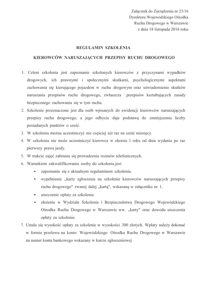 Załącznik do Zarządzenia nr 23/16 Dyrektora Wojewódzkiego Ośrodka Ruchu Drogowego w Warszawie z dnia 18 listopada 2016 roku REGULAMIN SZKOLENIA KIEROWCÓW NARUSZAJĄCYCH PRZEPISY RUCHU DROGOWEGO 1. Celem szkolenia jest zapoznanie szkolonych kierowców z przyczynami wypadków drogowych, ich prawnymi i społecznymi skutkami, psychologicznymi aspektami zachowania się kierującego pojazdem w ruchu drogowym oraz uświadomienie skutków naruszania przepisów ruchu drogowego, zwłaszcza przepisów kształtujących zasady bezpiecznego zachowania się w tym ruchu. 2. Szkolenie przeznaczone jest dla osób wpisanych do ewidencji kierowców naruszających przepisy ruchu drogowego, a jego odbycie daje podstawę do zmniejszenia liczby posiadanych punktów o sześć. 3. W szkoleniu można uczestniczyć nie częściej niż raz na sześć miesięcy. 4. W szkoleniu nie może uczestniczyć kierowca w okresie 1 roku od dnia wydania po raz pierwszy prawa jazdy. 5. W trakcie zajęć zabrania się prowadzenia rozmów telefonicznych. 6. Warunkiem zakwalifikowania osoby do szkolenia jest: • zapoznanie się z aktualnym regulaminem szkolenia. • wypełnienie „karty zgłoszenia na szkolenie kierowców naruszających przepisy ruchu drogowego" zwanej dalej „kartą", wskazaną w załączniku nr 1. • uiszczenie opłaty za szkolenie. • złożenie w Wydziale Szkolenia i Bezpieczeństwa Drogowego Wojewódzkiego Ośrodka Ruchu Drogowego w Warszawie ww. „karty" oraz dowodu uiszczenia opłaty za szkolenie. 7. Ustala się wysokość opłaty za szkolenie w wysokości 300 złotych. Wpłaty należy dokonać w formie przelewu na konto Wojewódzkiego Ośrodka Ruchu Drogowego w Warszawie na numer konta bankowego wskazany w karcie zgłoszeniowej 8. Szkolenie prowadzone będzie w siedzibie Wojewódzkiego Ośrodka Ruchu Drogowego w Warszawie przy ul. Odlewniczej 8 w następujących terminach: • dni powszednie w godzinach 1400 - 2000 • sobota w godzinach 1000 - 1600, zgodnie z programem zawartym w poniższej tabeli: Lp Temat Czas Metoda Środki Prowadzący dydaktyczne szkolenie 1 Przyczyny wypadków drogowych na tle poziomu bezpieczeństwa ruchu 2x45min. Pogadanka Film Policjant ruchu drogowego 2 Prawne i społeczne skutki wypadków drogowych 45min. Pogadanka Film Policjant ruchu drogowego 3 Psychologiczne aspekty zachowania się kierującego pojazdem w ruchu drogowym 3x45min Pogadanka Film Psycholog 9. Wykładowcami prowadzącymi szkolenie są osoby wymienione w powyższej tabeli, posiadający merytoryczne przygotowanie do prowadzenia szkolenia. 10. Dyrektor Wojewódzkiego Ośrodka Ruchu Drogowego w Warszawie potwierdza odbycie szkolenia wydając uczestniczącemu w nim kierowcy zaświadczenie zgodne ze wzorem określonym w załączniku nr 9 do rozporządzenia z dnia 25 kwietnia 2012r w sprawie postępowania z kierowcami naruszającymi przepisy ruchu drogowego. Kopię zaświadczenia o odbyciu szkolenia Dyrektor WORD w Warszawie przesyła organowi prowadzącemu ewidencję właściwemu ze względu na miejsce zamieszkania uczestnika szkolenia. 11. „Dopuszcza się rezygnację lub zmianę terminu osoby zakwalifikowanej na szkolenie bez poniesienia konsekwencji finansowych. Wola rezygnacji powinna być wyrażona w formie pisemnej oraz dostarczona do WORD w Warszawie." Dotyczy to także pism przesłanych na adres WORD w Warszawie za pomocą „Poczty Polskiej" bądź innych operatorów pocztowych. Dopuszcza się przesłanie ww. pisma drogą elektroniczną na adres: [email protected] lub faksem (nr faksu: (22) 59-76-701). 12. Regulamin szkolenia kierowców naruszających przepisy ruchu drogowego z dnia 12 lutego 2015 roku obowiązuje do dnia wejścia w życie obecnego regulaminu. 13. Regulamin wchodzi w życie z dniem 18 listopada 2016 rok.