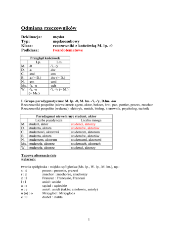Odmiana rzeczowników Deklinacja: Typ: Klasa: Podklasa: męska męskoosobowy rzeczowniki z końcówką M. lp. -0 twardotematowe Przegląd końcówek Lp. Lm. M. -0 -'i, -'y D. -a -ów C. -owi -om B. -a (= D.) -ów (= D.) N. -em -ami Ms. -'e, -u -ach W. -'e, -u -'i, -'y (= M.) (= Ms.) I. Grupa paradygmatyczna: M. lp. -0, M. lm. -'i, -'y, D.lm. -ów Rzeczowniki pospolite (niewelarne): agent, aktor, bokser, brat, pan, portier, prezes, znachor Rzeczowniki pospolite (welarne): elektryk, mnich, biolog, kierownik, psycholog, technik Paradygmat niewelarny: student, aktor Liczba pojedyncza Liczba mnoga M. student, aktor studenci, aktorzy D. studenta, aktora studentów, aktorów C. studentowi, aktorowi studentom, aktorom B. studenta, aktora studentów, aktorów N. studentem, aktorem studentami, aktorami Ms. studencie, aktorze studentach, aktorach W. studencie, aktorze studenci, aktorzy Typowe alternacje (nie welarne): twarda spółgłoska : miękka spółgłoska (Ms. lp., W. lp., M. lm.), np.: s:ś prezes : prezesie, prezesi r:ż znachor : znachorze, znachorzy z:ź Francuz : Francuzie, Francuzi ł:l anioł : aniele a:e sąsiad : sąsiedzie o:e anioł : anieli (także: aniołowie, anioły) u (ó) : o Mrzygłód : Mrzygłoda e:0 diabeł : diabła 1 Paradygmat welarny: mnich, technik, biolog Liczba pojedyncza Liczba mnoga M. mnich, kierownik, biolog mnisi, kierownicy, biolodzy D. mnicha, kierownika, mnichów, kierowników, biologa biologów C. mnichowi, kierownikowi, mnichom, kierownikom, biologowi biologom B. mnicha, kierownika, mnichów, kierowników, biologa biologów N. mnichem, kierownikiem, mnichami, kierownikami, biologiem biologami Ms. mnichu, kierowniku, mnichach, kierownikach, biologu biologach W. mnichu, kierowniku, mnisi, kierownicy, biolodzy biologu Typ biolog, socjolog – w M.lm. też -owie Typowe alternacje: twarda spółgłoska : miękka spółgłoska (M. lm., NIE: Ms. lp., W. lp.), np.: k:c technik : technicy g : dz psycholog : psycholodzy ch : ś Czech : Czesi W. lp. tylko: Kozacze (przest., dziś Kozaku), człowiecze (podn., częściej człowieku) Paradygmat: chłop, diabeł, kat (chłopu, diabłu, katu) Liczba pojedyncza Liczba mnoga M. chłop, diabeł, kat chłopi, diabły (diabli), kaci D. chłopa, diabła, kata chłopów, diabłów, katów C. chłopu, diabłu, katu chłopom, diabłom, katom B. chłopa, diabła, kata chłopów, diabłów (diabły), katów N. chłopem, diabłem, katem chłopami, diabłami, katami Ms. chłopie, diable, kacie chłopach, diabłach, katach W. chłopie, diable, kacie chłopi, diabli, kaci Niech to diabli (porwą, wezmą)! Diabli wiedzą. Diabli kogoś biorą, wzięli coś lub kogoś. Paradygmat: brat (brat-, brać-; bratu, braćmi) Liczba pojedyncza Liczba mnoga M. brat bracia D. brata braci C. bratu braciom B. brata braci 2 N. bratem Ms. bracie W. bracie braćmi braciach bracia Paradygmat: człowiek (człowieku, ludzie) Liczba pojedyncza Liczba mnoga M. człowiek ludzie D. człowieka ludzi C. człowiekowi ludziom B. człowieka ludzi N. człowiekiem ludźmi Ms. człowieku ludziach W. człowieku, ludzie podn. człowiecze II. Grupa paradygmatyczna: M. lp. -0, M. lm. -'y, D.lm. -ów Rzeczowniki pospolite (-ec, -owiec): chłopiec, głupiec, goprowiec, jeździec, kupiec, malec, mędrzec, młodzieniec, ojciec, rajdowiec, sportowiec, szewc, tubylec, związkowiec Paradygmat: sportowiec, tubylec Liczba pojedyncza Liczba mnoga M. sportowiec, tubylec sportowcy, tubylcy D. sportowca, tubylca sportowców, tubylców C. sportowcowi, tubylcowi sportowcom, tubylcom B. sportowca, tubylca sportowców, tubylców N. sportowcem, tubylcem sportowcami, tubylcami Ms. sportowcu, tubylcu sportowcach, tubylcach W. sportowcu, tubylcu sportowcy, tubylcy Paradygmat: mędrzec, szewc (mędrcze, szewcze) Liczba pojedyncza Liczba mnoga M. mędrzec, szewc mędrcy, szewcy D. mędrca, szewca mędrców, szewców C. mędrcowi, szewcowi mędrcom, szewcom B. mędrca, szewca mędrców, szewców N. mędrcem, szewcem mędrcami, szewcami Ms. mędrcu, szewcu mędrcach, szewcach W. mędrcu, podn. mędrcze mędrcy, szewcy szewcu, fraz. szewcze Typowe alternacje: c:č e:0 zob. formy wołacza lp. malec : malca chłopiec : chłopca alternacji e : 0 towarzyszy depalatalizacja miękkiej spółgłoski występującej w M. lp., np.: w’ : w sportowiec : sportowca p’ : p kupiec : kupca 3 Paradygmat: ojciec (ojc-; ojcu, ojcowie) Liczba pojedyncza Liczba mnoga M. ojciec ojcowie D. ojca ojców C. ojcu ojcom B. ojca ojców N. ojcem ojcami Ms. ojcu ojcach W. ojcze ojcowie Formy wołacza lp.: Chłopiec chłopcze Głupiec głupcze, pot. głupcu Jeździec jeźdźcze, pot. jeźdźcu Kupiec kupcze Malec malcze Mędrzec mędrcu, podn. mędrcze Młodzieniec młodzieńcze, pot. młodzieńcu Ojciec ojcze Szewc szewcu, fraz. szewcze (Pilnuj, szewcze, kopyta!) III. Grupa paradygmatyczna: M. lp. -0, M. lm. -owie, D.lm. -ów Rzeczowniki pospolite (niewelarne): car, filozof, generał, kapitan, mer Rzeczowniki pospolite (welarne): bóg, druh, mag, potomek, świadek, skoczek, wróg, ziomek Paradygmat niewelarny: generał, mer Liczba pojedyncza Liczba mnoga M. generał, mer generałowie, merowie D. generała, mera generałów, merów C. generałowi, merowi generałom, merom B. generała, mera generałów, merów N. generałem, merem generałami, merami Ms. generale, merze generałach, merach W. generale, merze generałowie, merowie Typowe alternacje: twarda spółgłoska : miękka spółgłoska (Ms. lp., W. lp.), np.: ł:l generał : generale r:ż car : carze Wahania -y / -owie w M. lm.: Doktor doktorzy, doktorowie (tylko stopień naukowy) Fundator fundatorzy, rzad. fundatorowie Inkwizytor inkwizytorzy, rzad. inkwizytorowie Magister magistrzy, magistrowie Profesor profesorowie, rzad. profesorzy 4 Rektor rektorzy, rzad. rektorowie Paradygmat welarny: mag, świadek Liczba pojedyncza Liczba mnoga M. mag, świadek magowie, świadkowie D. maga, świadka magów, świadków C. magowi, świadkowi magom, świadkom B. maga, świadka mag