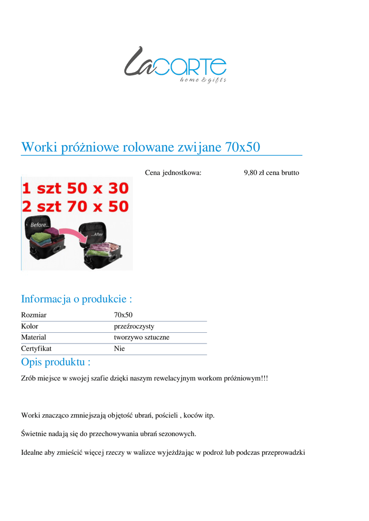 Worki próżniowe rolowane zwijane 70x50 Cena jednostkowa: 9,80 zł cena brutto Informacja o produkcie : Rozmiar Kolor Material Certyfikat 70x50 przeźroczysty tworzywo sztuczne Nie Opis produktu : Zrób miejsce w swojej szafie dzięki naszym rewelacyjnym workom próżniowym!!! Worki znacząco zmniejszają objętość ubrań, pościeli , koców itp. Świetnie nadają się do przechowywania ubrań sezonowych. Idealne aby zmieścić więcej rzeczy w walizce wyjeżdżając w podroż lub podczas przeprowadzki Naszych worków można używać wielokrotnie są trwałe i odporne na uszkodzenia. Hermetyczne zamknięcie uchroni zawartość prze brudem, kurzem, wilgocią itp. Umożliwiają zaoszczędzenie aż 75% miejsca, Stosowanie: 1. Do worka wkładamy ubrania lub inne rzeczy 2. Zamykamy worek znajdującym się w nim suwakiem. 3. Zwijamy worek. Zestaw zawiera: 1 szt 50 x 30 2 szt 70 x 50 Powered by TCPDF (www.tcpdf.org)