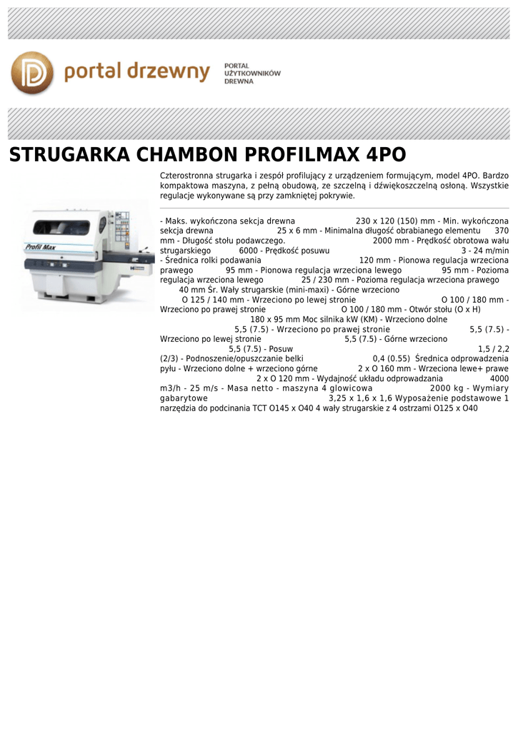 STRUGARKA CHAMBON PROFILMAX 4PO Czterostronna strugarka i zespół profilujący z urządzeniem formującym, model 4PO. Bardzo kompaktowa maszyna, z pełną obudową, ze szczelną i dźwiękoszczelną osłoną. Wszystkie regulacje wykonywane są przy zamkniętej pokrywie. - Maks. wykończona sekcja drewna 230 x 120 (150) mm - Min. wykończona sekcja drewna 25 x 6 mm - Minimalna długość obrabianego elementu 370 mm - Długość stołu podawczego. 2000 mm - Prędkość obrotowa wału strugarskiego 6000 - Prędkość posuwu 3 - 24 m/min - Średnica rolki podawania 120 mm - Pionowa regulacja wrzeciona prawego 95 mm - Pionowa regulacja wrzeciona lewego 95 mm - Pozioma regulacja wrzeciona lewego 25 / 230 mm - Pozioma regulacja wrzeciona prawego 40 mm Śr. Wały strugarskie (mini-maxi) - Górne wrzeciono O 125 / 140 mm - Wrzeciono po lewej stronie O 100 / 180 mm Wrzeciono po prawej stronie O 100 / 180 mm - Otwór stołu (O x H) 180 x 95 mm Moc silnika kW (KM) - Wrzeciono dolne 5,5 (7.5) - Wrzeciono po prawej stronie 5,5 (7.5) Wrzeciono po lewej stronie 5,5 (7.5) - Górne wrzeciono 5,5 (7.5) - Posuw 1,5 / 2,2 (2/3) - Podnoszenie/opuszczanie belki 0,4 (0.55) Średnica odprowadzenia pyłu - Wrzeciono dolne + wrzeciono górne 2 x O 160 mm - Wrzeciona lewe+ prawe 2 x O 120 mm - Wydajność układu odprowadzania 4000 m3/h - 25 m/s - Masa netto - maszyna 4 glowicowa 2000 kg - Wymiary gabarytowe 3,25 x 1,6 x 1,6 Wyposażenie podstawowe 1 narzędzia do podcinania TCT O145 x O40 4 wały strugarskie z 4 ostrzami O125 x O40