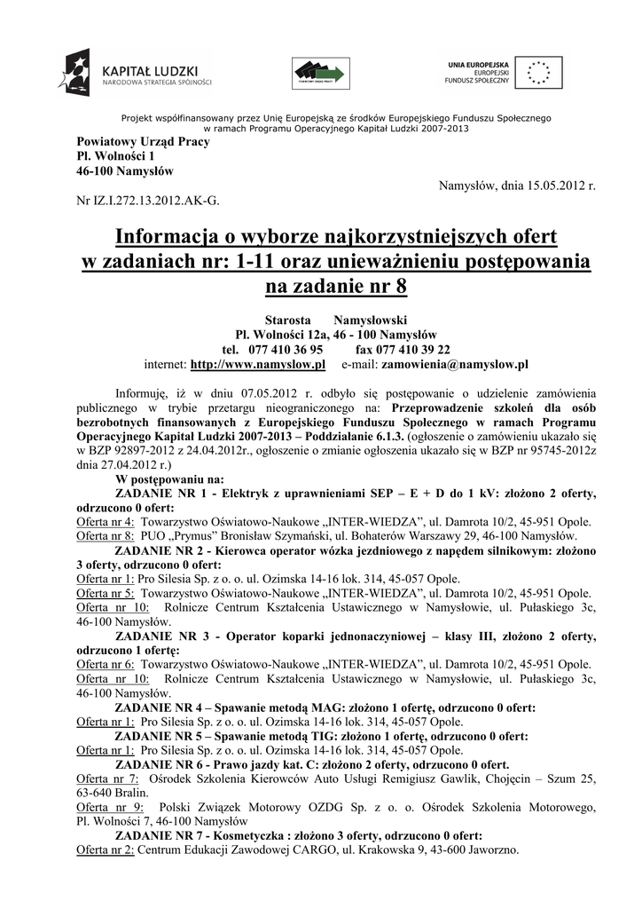 Projekt współfinansowany przez Unię Europejską ze środków Europejskiego Funduszu Społecznego w ramach Programu Operacyjnego Kapitał Ludzki 2007-2013 Powiatowy Urząd Pracy Pl. Wolności 1 46-100 Namysłów Namysłów, dnia 15.05.2012 r. Nr IZ.I.272.13.2012.AK-G. Informacja o wyborze najkorzystniejszych ofert w zadaniach nr: 1-11 oraz unieważnieniu postępowania na zadanie nr 8 Starosta Namysłowski Pl. Wolności 12a, 46 - 100 Namysłów tel. 077 410 36 95 fax 077 410 39 22 internet: http://www.namyslow.pl e-mail: [email protected] Informuję, iż w dniu 07.05.2012 r. odbyło się postępowanie o udzielenie zamówienia publicznego w trybie przetargu nieograniczonego na: Przeprowadzenie szkoleń dla osób bezrobotnych finansowanych z Europejskiego Funduszu Społecznego w ramach Programu Operacyjnego Kapitał Ludzki 2007-2013 – Poddziałanie 6.1.3. (ogłoszenie o zamówieniu ukazało się w BZP 92897-2012 z 24.04.2012r., ogłoszenie o zmianie ogłoszenia ukazało się w BZP nr 95745-2012z dnia 27.04.2012 r.) W postępowaniu na: ZADANIE NR 1 - Elektryk z uprawnieniami SEP – E + D do 1 kV: złożono 2 oferty, odrzucono 0 ofert: Oferta nr 4: Towarzystwo Oświatowo-Naukowe „INTER-WIEDZA”, ul. Damrota 10/2, 45-951 Opole. Oferta nr 8: PUO „Prymus” Bronisław Szymański, ul. Bohaterów Warszawy 29, 46-100 Namysłów. ZADANIE NR 2 - Kierowca operator wózka jezdniowego z napędem silnikowym: złożono 3 oferty, odrzucono 0 ofert: Oferta nr 1: Pro Silesia Sp. z o. o. ul. Ozimska 14-16 lok. 314, 45-057 Opole. Oferta nr 5: Towarzystwo Oświatowo-Naukowe „INTER-WIEDZA”, ul. Damrota 10/2, 45-951 Opole. Oferta nr 10: Rolnicze Centrum Kształcenia Ustawicznego w Namysłowie, ul. Pułaskiego 3c, 46-100 Namysłów. ZADANIE NR 3 - Operator koparki jednonaczyniowej – klasy III, złożono 2 oferty, odrzucono 1 ofertę: Oferta nr 6: Towarzystwo Oświatowo-Naukowe „INTER-WIEDZA”, ul. Damrota 10/2, 45-951 Opole. Oferta nr 10: Rolnicze Centrum Kształcenia Ustawicznego w Namysłowie, ul. Pułaskiego 3c, 46-100 Namysłów. ZADANIE NR 4 – Spawanie metodą MAG: złożono 1 ofertę, odrzucono 0 ofert: Oferta nr 1: Pro Silesia Sp. z o. o. ul. Ozimska 14-16 lok. 314, 45-057 Opole. ZADANIE NR 5 – Spawanie metodą TIG: złożono 1 ofertę, odrzucono 0 ofert: Oferta nr 1: Pro Silesia Sp. z o. o. ul. Ozimska 14-16 lok. 314, 45-057 Opole. ZADANIE NR 6 - Prawo jazdy kat. C: złożono 2 oferty, odrzucono 0 ofert. Oferta nr 7: Ośrodek Szkolenia Kierowców Auto Usługi Remigiusz Gawlik, Chojęcin – Szum 25, 63-640 Bralin. Oferta nr 9: Polski Związek Motorowy OZDG Sp. z o. o. Ośrodek Szkolenia Motorowego, Pl. Wolności 7, 46-100 Namysłów ZADANIE NR 7 - Kosmetyczka : złożono 3 oferty, odrzucono 0 ofert: Oferta nr 2: Centrum Edukacji Zawodowej CARGO, ul. Krakowska 9, 43-600 Jaworzno. Oferta nr 3: Studio Kosmetyki Ciała „MARKIEL” Barbara Markiel, ul. Kazimierska 15, 51-657 Wrocław. Oferta nr 10: Rolnicze Centrum Kształcenia Ustawicznego w Namysłowie, ul. Pułaskiego 3c, 46-100 Namysłów. ZADANIE NR 8 - Artystyczna produkcja biżuterii oraz decoupage: złożono 0 ofert, odrzucono 0 ofert. ZADANIE NR 9 - Kadry i płace: złożono 3 oferty, odrzucono 0 ofert: Oferta nr 1: Pro Silesia Sp. z o. o. ul. Ozimska 14-16 lok. 314, 45-057 Opole. Oferta nr 2: Centrum Edukacji Zawodowej CARGO, ul. Krakowska 9, 43-600 Jaworzno. Oferta nr 10: Rolnicze Centrum Kształcenia Ustawicznego w Namysłowie, ul. Pułaskiego 3c, 46-100 Namysłów. ZADANIE NR 10 - Konserwator terenów zieleni: złożono 2 oferty, odrzucono 0 ofert: Oferta nr 2: Centrum Edukacji Zawodowej CARGO, ul. Krakowska 9, 43-600 Jaworzno. Oferta nr 10: Rolnicze Centrum Kształcenia Ustawicznego w Namysłowie, ul. Pułaskiego 3c, 46-100 Namysłów. ZADANIE NR 11 - Grafika komputerowa: złożono 1 ofertę, odrzucono 0 ofert: Oferta nr 10: Rolnicze Centrum Kształcenia Ustawicznego w Namysłowie, ul. Pułaskiego 3c, 46-100 Namysłów. W wyniku postępowania wybrana następujące oferty: ZADANIE NR 1 - Elektryk z uprawnieniami SEP – E + D do 1 kV: wybrano ofertę nr 4 Towarzystwa Oświatowo-Naukowego „INTER-WIEDZA”, ul. Damrota 10/2, 45-951 Opole, za cenę brutto 5.900,00 zł (słownie złotych: pięć tysięcy dziewięćset 00/100). Uzasadnienie: Oferta najkorzystniejsza z uwagi na kryterium zawarte w Ogłoszeniu i Specyfikacji Istotnych Warunków Zamówienia (oferowana cena brutto – 100%), wykonawca otrzymał najwyższą ilość punktów = 100,00. ZADANIE NR 2 - Kierowca operator wózka jezdniowego z napędem silnikowym: wybrano ofertę nr 10 - Rolniczego Centrum Kształcenia Ustawicznego w Namysłowie, ul. Pułaskiego 3c, 46-100 Namysłów, za cenę brutto 3.864,00 zł (słownie złotych: trzy tysiące osiemset sześćdziesiąt cztery 00/100). Uzasadnienie: Oferta najkorzystniejsza z uwagi na kryterium zawarte w Ogłoszeniu i Specyfikacji Istotnych Warunków Zamówienia (oferowana cena brutto – 100%), wykonawca otrzymał najwyższą ilość punktów = 100,00. ZADANIE NR 3 - Operator koparki jednonaczyniowej – klasy III: wybrano ofertę nr 6 – Towarzystwa Oświatowo-Naukowego „INTER-WIEDZA”, ul. Damrota 10/2, 45-951 Opole, za cenę brutto 14.500,00 zł (słownie złotych: czternaście tysięcy pięćset 00/100). Uzasadnienie: Oferta najkorzystniejsza z uwagi na kryterium zawarte w Ogłoszeniu i Specyfikacji Istotnych Warunków Zamówienia (oferowana cena brutto – 100%), wykonawca otrzymał najwyższą ilość punktów = 100,00. ZADANIE NR 4 - Kurs spawania metodą MAG: wybrano ofertę nr 1 – Pro Silesii Sp. z o. o. ul. Ozimska 14-16 lok. 314, 45-057 Opole, za cenę brutto 9.500,00 zł (słownie złotych: dziewięć tysięcy pięćset 00/100). Uzasadnienie: Oferta najkorzystniejsza z uwagi na kryterium zawarte w Ogłoszeniu i Specyfikacji Istotnych Warunków Zamówienia (oferowana cena brutto – 100%), wykonawca otrzymał najwyższą ilość punktów = 100,00. ZADANIE NR 5 - Kurs spawania metodą TIG: wybrano ofert
