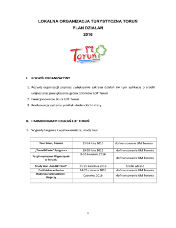 LOKALNA ORGANIZACJA TURYSTYCZNA TORUŃ PLAN DZIAŁAŃ 2016 I. ROZWÓJ ORGANIZACYJNY 1. Rozwój organizacji poprzez zwiększanie zakresu działań (w tym aplikacje o środki unijne) oraz powiększenie grona członków LOT Toruń 2. Funkcjonowanie Biura LOT Toruń 3. Kontynuacja systemu praktyk studenckich i staży II. HARMONOGRAM DZIAŁAŃ LOT TORUŃ 1. Wyjazdy targowe i wystawiennicze, study tour Tour Salon, Poznań 12-14 luty 2016 „Travel&Taste” Bydgoszcz 19-20 luty 2016 9-10 kwietnia 2016 Targi turystyczne Wypoczynek w Toruniu Study tour „Food&Travel” Dni Polskie w Pradze Study tour przyjazdowe blogerzy dofinansowanie UM Torunia dofinansowanie UM Torunia dofinansowanie UM Torunia 21-25 kwietnia 2016 24-25 czerwca 2016 Środki własne dofinansowanie UM Torunia Czerwiec 2016 dofinansowanie UM Torunia 1 2. Szkolenia dla członków LOT Dla członków LOT Toruń wrzesień 2016 współfinansowanie UMG Toruń Szkolenie dla pracowników branży turystycznej Wrzesień 2016 współfinansowanie UMR 17 marca 2015 Warszawa 7-8 marca 2015 Środki własne 10 kwietnia 2016 UMR maj 2016 LOT Toruń 3. Spotkania branżowe Spotkanie Regionalnych Convention Bureau, Warszawa Forum Gospodarcze Welconomy, Toruń Lokalne Forum Turystyki Toruńskiej Walne Zebranie Sprawozdawcze LOT Toruń 4. Imprezy plenerowe Otwarcie Sezonu Turystycznego w Toruniu 24 kwietnia 2016 dofinansowanie UM Torunia 7 maja 2016 dofinansowanie UM Torunia 22-24 kwietnia 2016 Środki własne Grudzień 2015 dofinansowanie UM Torunia Marzec 2016 dofinansowanie UM Torunia 5. Projekty tematyczne III Kajakowa Masa Krytyczna Toruń za pół ceny Ambasador Toruńskiej Turystyki 6. Publikacje Przygotowanie kalendarium wydarzeń na 2016 rok 2 III. POZOSTAŁE KIERUNKI DZIAŁAŃ 1. Rozwój i rozszerzenie oferty turystycznej w Toruniu, promocja ofert członków LOT na stronie lottorun.pl, torutc.pl i imprezach targowych 2. Udział w spotkaniach promocyjnych i spotkaniach z touroperatorami 3. Działania na rzecz integracji branży turystycznej 4. Działalność na rzecz kreowania i promocji nowych produktów turystycznych w Toruniu 5. Prowadzenie działalności informacyjnej i promocyjnej 6. Rozbudowa i aktualizacja strony internetowej LOT Toruń (TCBC, klaster), promocja w mediach społecznościowych 7. Kontynuacja prac LOT w organizacjach, radach oraz komisjach turystycznych i branżowych 8. Pozyskiwanie, w miarę możliwości, środków z projektów unijnych, na działalność toruńskiego klastra turystycznego. 3