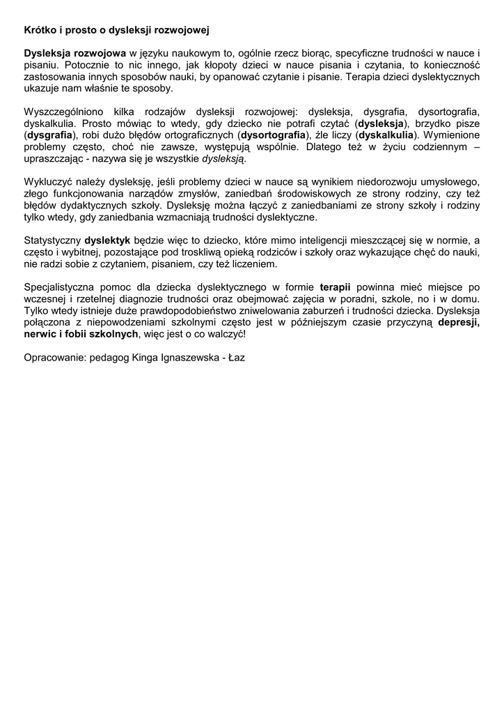 Krótko i prosto o dysleksji rozwojowej Dysleksja rozwojowa w języku naukowym to, ogólnie rzecz biorąc, specyficzne trudności w nauce i pisaniu. Potocznie to nic innego, jak kłopoty dzieci w nauce pisania i czytania, to konieczność zastosowania innych sposobów nauki, by opanować czytanie i pisanie. Terapia dzieci dyslektycznych ukazuje nam właśnie te sposoby. Wyszczególniono kilka rodzajów dysleksji rozwojowej: dysleksja, dysgrafia, dysortografia, dyskalkulia. Prosto mówiąc to wtedy, gdy dziecko nie potrafi czytać (dysleksja), brzydko pisze (dysgrafia), robi dużo błędów ortograficznych (dysortografia), źle liczy (dyskalkulia). Wymienione problemy często, choć nie zawsze, występują wspólnie. Dlatego też w życiu codziennym – upraszczając - nazywa się je wszystkie dysleksją. Wykluczyć należy dysleksję, jeśli problemy dzieci w nauce są wynikiem niedorozwoju umysłowego, złego funkcjonowania narządów zmysłów, zaniedbań środowiskowych ze strony rodziny, czy też błędów dydaktycznych szkoły. Dysleksję można łączyć z zaniedbaniami ze strony szkoły i rodziny tylko wtedy, gdy zaniedbania wzmacniają trudności dyslektyczne. Statystyczny dyslektyk będzie więc to dziecko, które mimo inteligencji mieszczącej się w normie, a często i wybitnej, pozostające pod troskliwą opieką rodziców i szkoły oraz wykazujące chęć do nauki, nie radzi sobie z czytaniem, pisaniem, czy też liczeniem. Specjalistyczna pomoc dla dziecka dyslektycznego w formie terapii powinna mieć miejsce po wczesnej i rzetelnej diagnozie trudności oraz obejmować zajęcia w poradni, szkole, no i w domu. Tylko wtedy istnieje duże prawdopodobieństwo zniwelowania zaburzeń i trudności dziecka. Dysleksja połączona z niepowodzeniami szkolnymi często jest w późniejszym czasie przyczyną depresji, nerwic i fobii szkolnych, więc jest o co walczyć! Opracowanie: pedagog Kinga Ignaszewska - Łaz