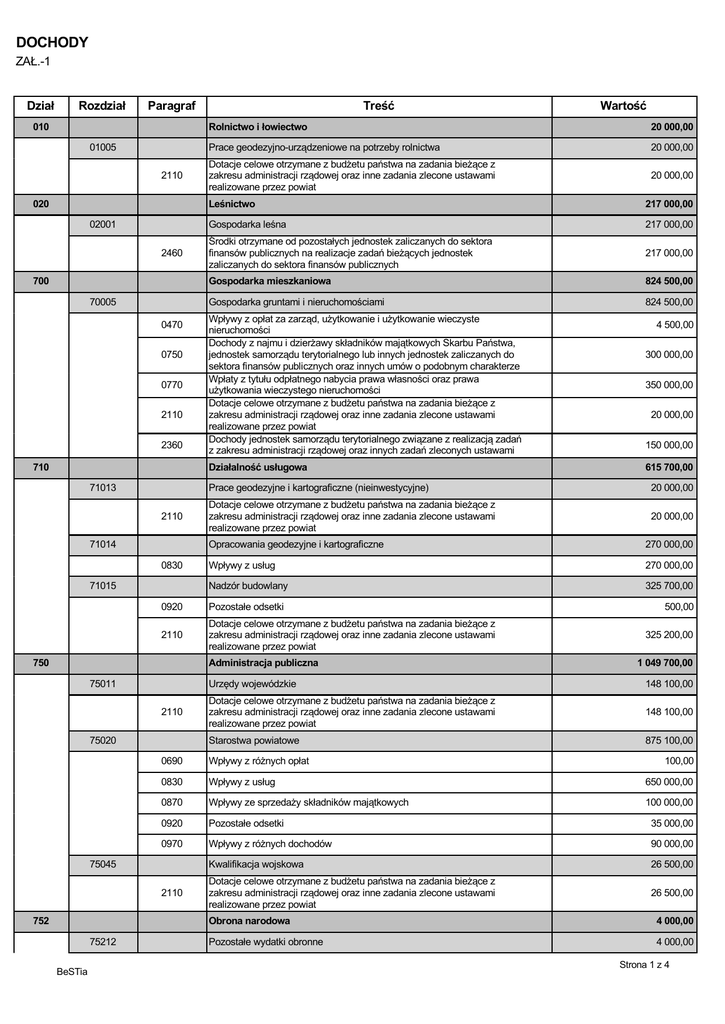 DOCHODY ZAŁ.-1 Dział 010 Rozdział Paragraf 01005 Prace geodezyjno-urządzeniowe na potrzeby rolnictwa 2110 020 02001 70005 0470 0770 2110 2360 71013 71014 71015 0830 0920 2110 750 75020 0690 0830 0870 0920 75045 0970 2110 752 75212 BeSTia 20 000,00 217 000,00 Gospodarka gruntami i nieruchomościami Wpływy z opłat za zarząd, użytkowanie i użytkowanie wieczyste nieruchomości Dochody z najmu i dzierżawy składników majątkowych Skarbu Państwa, jednostek samorządu terytorialnego lub innych jednostek zaliczanych do sektora finansów publicznych oraz innych umów o podobnym charakterze Wpłaty z tytułu odpłatnego nabycia prawa własności oraz prawa użytkowania wieczystego nieruchomości Dotacje celowe otrzymane z budżetu państwa na zadania bieżące z zakresu administracji rządowej oraz inne zadania zlecone ustawami realizowane przez powiat Dochody jednostek samorządu terytorialnego związane z realizacją zadań z zakresu administracji rządowej oraz innych zadań zleconych ustawami Działalność usługowa Dotacje celowe otrzymane z budżetu państwa na zadania bieżące z zakresu administracji rządowej oraz inne zadania zlecone ustawami realizowane przez powiat 217 000,00 824 500,00 824 500,00 4 500,00 300 000,00 350 000,00 20 000,00 150 000,00 615 700,00 20 000,00 20 000,00 Opracowania geodezyjne i kartograficzne 270 000,00 Nadzór budowlany 325 700,00 Dotacje celowe otrzymane z budżetu państwa na zadania bieżące z zakresu administracji rządowej oraz inne zadania zlecone ustawami realizowane przez powiat 325 200,00 Wpływy z usług Pozostałe odsetki Urzędy wojewódzkie 2110 20 000,00 Środki otrzymane od pozostałych jednostek zaliczanych do sektora finansów publicznych na realizacje zadań bieżących jednostek zaliczanych do sektora finansów publicznych Administracja publiczna 75011 20 000,00 217 000,00 Prace geodezyjne i kartograficzne (nieinwestycyjne) 2110 Wartość Leśnictwo Gospodarka mieszkaniowa 0750 710 Dotacje celowe otrzymane z budżetu państwa na zadania bieżące z zakresu administracji rządowej oraz inne zadania zlecone ustawami realizowane przez powiat Gospodarka leśna 2460 700 Rolnictwo i łowiectwo Treść Dotacje celowe otrzymane z budżetu państwa na zadania bieżące z zakresu administracji rządowej oraz inne zadania zlecone ustawami realizowane przez powiat 270 000,00 500,00 1 049 700,00 148 100,00 148 100,00 Starostwa powiatowe 875 100,00 Wpływy z usług 650 000,00 Wpływy z różnych opłat Wpływy ze sprzedaży składników majątkowych Pozostałe odsetki Wpływy z różnych dochodów Kwalifikacja wojskowa Dotacje celowe otrzymane z budżetu państwa na zadania bieżące z zakresu administracji rządowej oraz inne zadania zlecone ustawami realizowane przez powiat Obrona narodowa Pozostałe wydatki obronne 100,00 100 000,00 35 000,00 90 000,00 26 500,00 26 500,00 4 000,00 4 000,00 Strona 1 z 4 2110 754 75411 Bezpieczeństwo publiczne i ochrona przeciwpożarowa 0920 2110 2360 756 75618 0420 0490 0570 75622 0590 0010 0020 758 75801 75803 75832 801 2920 2920 2920 80102 0970 2440 2701 80120 0690 0750 0970 2330 2701 80130 BeSTia Komendy powiatowe Państwowej Straży Pożarnej Pozostałe odsetki Dotacje celowe otrzymane z budżetu państwa na zadania bieżące z zakresu administracji rządowej oraz inne zadania zlecone ustawami realizowane przez powiat Dochody jednostek samorządu terytorialnego związane z realizacją zadań z zakresu administracji rządowej oraz innych zadań zleconych ustawami Dochody od osób prawnych, od osób fizycznych i od innych jednostek nieposiadających osobowości prawnej oraz wydatki związane z ich poborem Wpływy z innych opłat stanowiących dochody jednostek samorządu terytorialnego na podstawie ustaw Wpływy z opłaty komunikacyjnej Wpływy z innych lokalnych opłat pobieranych przez jednostki samorządu terytorialnego na podstawie odrębnych ustaw Grzywny, mandaty i inne kary pieniężne od osób fizycznych Wpływy z opłat za koncesje i licencje Udziały powiatów w podatkach stanowiących dochód budżetu państwa Podatek dochodowy od osób fizycznych Podatek dochodowy od osób prawnych 0690 4 000,00 2 776 000,00 2 776 000,00 1 500,00 2 773 000,00 1 500,00 5 909 094,00 1 084 000,00 950 000,00 74 000,00 40 000,00 20 000,00 4 825 094,00 4 695 094,00 130 000,00 Różne rozliczenia 21 597 680,00 Subwencje ogólne z budżetu państwa 15 738 507,00 Część oświatowa subwencji ogólnej dla jednostek samorządu terytorialnego Część wyrównawcza subwencji ogólnej dla powiatów Subwencje ogólne z budżetu państwa Część równoważąca subwencji ogólnej dla powiatów Subwencje ogólne z budżetu państwa Oświata i wychowanie Szkoły podstawowe specjalne 0750 80110 Dotacje celowe otrzymane z budżetu państwa na zadania bieżące z zakresu administracji rządowej oraz inne zadania zlecone ustawami realizowane przez powiat Dochody z najmu i dzierżawy składników majątkowych Skarbu Państwa, jednostek samorządu terytorialnego lub innych jednostek zaliczanych do sektora finansów publicznych oraz innych umów o podobnym charakterze Wpływy z różnych dochodów Dotacje otrzymane z państwowych funduszy celowych na realizację zadań bieżących jednostek sektora finansów publicznych Gimnazja Środki na dofinansowanie własnych zadań bieżących gmin (związków gmin), powiatów (związków powiatów), samorządów województw, pozyskane z innych źródeł Licea ogólnokształcące Wpływy z różnych opłat Dochody z najmu i dzierżawy składników majątkowych Skarbu Państwa, jednostek samorządu terytorialnego lub innych jednostek zaliczanych do sektora finansów publicznych oraz innych umów o podobnym charakterze Wpływy z różnych dochodów Dotacje celowe otrzymane od samorządu województwa na zadania bieżące realizowane na podstawie porozumień (umów) między jednostkami samorządu terytorialnego Środki na dofinansowanie własnych zadań bieżących gmin (związków gmin), powiat