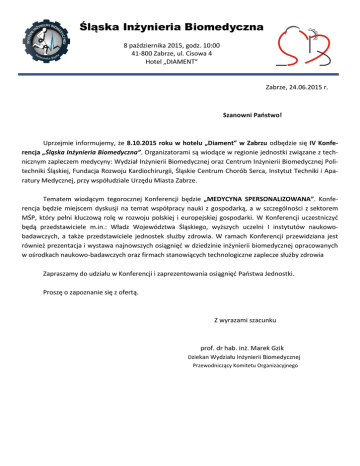 Śląska Inżynieria Biomedyczna 8 października 2015, godz. 10:00 41-800 Zabrze, ul. Cisowa 4 Hotel „DIAMENT” Zabrze, 24.06.2015 r. Szanowni Państwo! Uprzejmie informujemy, że 8.10.2015 roku w hotelu „Diament” w Zabrzu odbędzie się IV Konferencja „Śląska Inżynieria Biomedyczna”. Organizatorami są wiodące w regionie jednostki związane z technicznym zapleczem medycyny: Wydział Inżynierii Biomedycznej oraz Centrum Inżynierii Biomedycznej Politechniki Śląskiej, Fundacja Rozwoju Kardiochirurgii, Śląskie Centrum Chorób Serca, Instytut Techniki i Aparatury Medycznej, przy współudziale Urzędu Miasta Zabrze. Tematem wiodącym tegorocznej Konferencji będzie „MEDYCYNA SPERSONALIZOWANA”. Konferencja będzie miejscem dyskusji na temat współpracy nauki z gospodarką, a w szczególności z sektorem MŚP, który pełni kluczową rolę w rozwoju polskiej i europejskiej gospodarki. W Konferencji uczestniczyć będą przedstawiciele m.in.: Władz Województwa Śląskiego, wyższych uczelni I instytutów naukowobadawczych, a także przedstawiciele jednostek służby zdrowia. W ramach Konferencji przewidziana jest również prezentacja i wystawa najnowszych osiągnięć w dziedzinie inżynierii biomedycznej opracowanych w ośrodkach naukowo-badawczych oraz firmach stanowiących technologiczne zaplecze służby zdrowia Zapraszamy do udziału w Konferencji i zaprezentowania osiągnięć Państwa Jednostki. Proszę o zapoznanie się z ofertą. Z wyrazami szacunku prof. dr hab. inż. Marek Gzik Dziekan Wydziału Inżynierii Biomedycznej Przewodniczący Komitetu Organizacyjnego Śląska Inżynieria Biomedyczna 8 października 2015, godz. 10:00 41-800 Zabrze, ul. Cisowa 4 Hotel „DIAMENT” OFERTA WSPÓŁPRACY Oferta Ustna prezentacja firmy Stoisko reklamowe (2m x 3m) Złoty Sponsor 5 000 PLN 10 min Tak Sponsor 3 000 PLN Tak