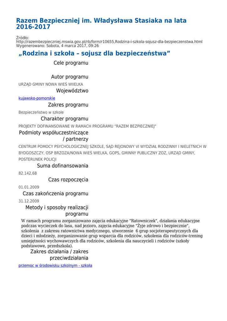 Razem Bezpieczniej im. Władysława Stasiaka na lata 2016-2017 Źródło: http://razembezpieczniej.mswia.gov.pl/rb/form/r10655,Rodzina-i-szkola-sojusz-dla-bezpieczenstwa.html Wygenerowano: Sobota, 4 marca 2017, 09:26 „Rodzina i szkoła – sojusz dla bezpieczeństwa” Cele programu Autor programu URZĄD GMINY NOWA WIEŚ WIIELKA Województwo kujawsko-pomorskie Zakres programu Bezpieczeństwo w szkole Charakter programu PROJEKTY DOFINANSOWANE W RAMACH PROGRAMU "RAZEM BEZPIECZNIEJ" Podmioty współuczestniczące / partnerzy CENTRUM POMOCY PSYCHOLOGICZNEJ SZKOLE, SĄD REJONOWY VI WYDZIAŁ RODZINNY I NIELETNICH W BYDGOSZCZY, OSP BRZOZA/NOWA WIEŚ WIELKA, GOPS, GMINNY PUBLICZNY ZOZ, URZĄD GMINY, POSTERUNEK POLICJI Suma dofinansowania 82.142,68 Czas rozpoczęcia 01.01.2009 Czas zakończenia programu 31.12.2009 Metody i sposoby realizacji programu W ramach programu zorganizowano zajęcia edukacyjne "Ratowniczek", działania edukacyjne podczas wycieczek do lasu, nad jezioro, zajęcia edukacyjne "Żyje zdrowo i bezpiecznie", szkolenia z zakresu ratownictwa medycznego, utworzenie 6 grup socjoterapeutycznych dla dzieci i młodzieży, zorganizowanie grup wsparcia dla rodziców, szkolenia dla rodziców-trening umiejętności wychowawczych dla rodziców, szkolenia dla nauczycieli i rodziców (szkoły podstawowe, przedszkola). Zakres działania / zakres przeciwdziałania przemoc w środowisku szkolnym - szkoła