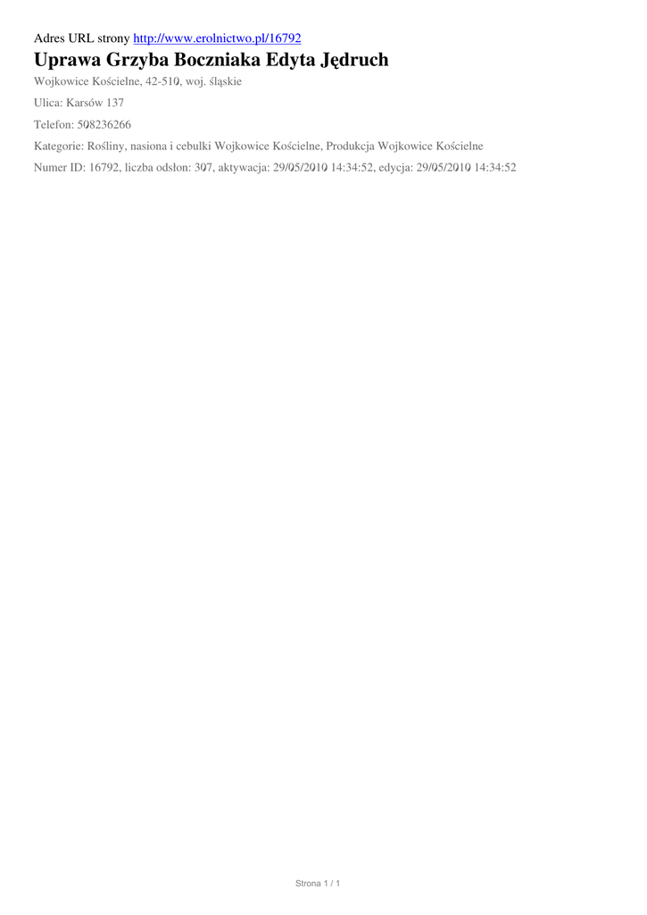 Adres URL strony http://www.erolnictwo.pl/16792 Uprawa Grzyba Boczniaka Edyta Jędruch Wojkowice Kościelne, 42-510, woj. śląskie Ulica: Karsów 137 Telefon: 508236266 Kategorie: Rośliny, nasiona i cebulki Wojkowice Kościelne, Produkcja Wojkowice Kościelne Numer ID: 16792, liczba odsłon: 307, aktywacja: 29/05/2010 14:34:52, edycja: 29/05/2010 14:34:52 Strona 1 / 1