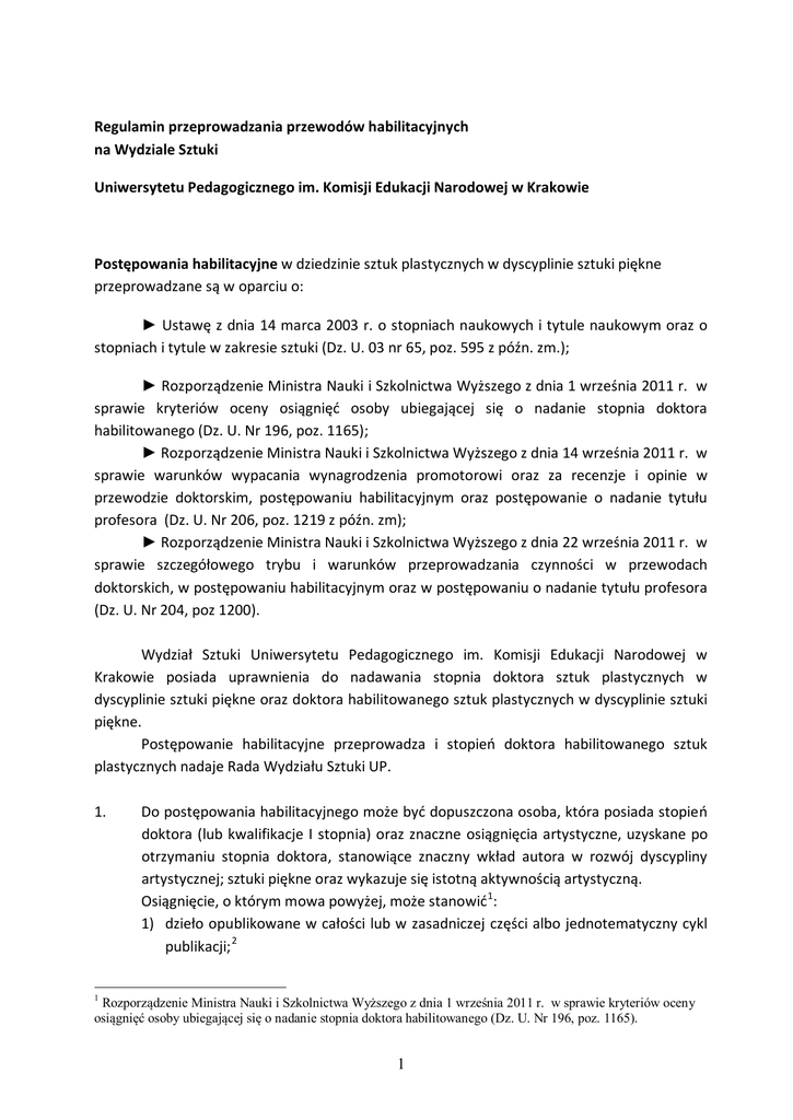 Regulamin przeprowadzania przewodów habilitacyjnych na Wydziale Sztuki Uniwersytetu Pedagogicznego im. Komisji Edukacji Narodowej w Krakowie Postępowania habilitacyjne w dziedzinie sztuk plastycznych w dyscyplinie sztuki piękne przeprowadzane są w oparciu o: ► Ustawę z dnia 14 marca 2003 r. o stopniach naukowych i tytule naukowym oraz o stopniach i tytule w zakresie sztuki (Dz. U. 03 nr 65, poz. 595 z późn. zm.); ► Rozporządzenie Ministra Nauki i Szkolnictwa Wyższego z dnia 1 września 2011 r. w sprawie kryteriów oceny osiągnięć osoby ubiegającej się o nadanie stopnia doktora habilitowanego (Dz. U. Nr 196, poz. 1165); ► Rozporządzenie Ministra Nauki i Szkolnictwa Wyższego z dnia 14 września 2011 r. w sprawie warunków wypacania wynagrodzenia promotorowi oraz za recenzje i opinie w przewodzie doktorskim, postępowaniu habilitacyjnym oraz postępowanie o nadanie tytułu profesora (Dz. U. Nr 206, poz. 1219 z późn. zm); ► Rozporządzenie Ministra Nauki i Szkolnictwa Wyższego z dnia 22 września 2011 r. w sprawie szczegółowego trybu i warunków przeprowadzania czynności w przewodach doktorskich, w postępowaniu habilitacyjnym oraz w postępowaniu o nadanie tytułu profesora (Dz. U. Nr 204, poz 1200). Wydział Sztuki Uniwersytetu Pedagogicznego im. Komisji Edukacji Narodowej w Krakowie posiada uprawnienia do nadawania stopnia doktora sztuk plastycznych w dyscyplinie sztuki piękne oraz doktora habilitowanego sztuk plastycznych w dyscyplinie sztuki piękne. Postępowanie habilitacyjne przeprowadza i stopień doktora habilitowanego sztuk plastycznych nadaje Rada Wydziału Sztuki UP. 1. Do postępowania habilitacyjnego może być dopuszczona osoba, która posiada stopień doktora (lub kwalifikacje I stopnia) oraz znaczne osiągnięcia artystyczne, uzyskane po otrzymaniu stopnia doktora, stanowiące znaczny wkład autora w rozwój dyscypliny artystycznej; sztuki piękne oraz wykazuje się istotną aktywnością artystyczną. Osiągnięcie, o którym mowa powyżej, może stanowić 1: 1) dzieło opublikowane w całości lub w zasadniczej części albo jednotematyczny cykl publikacji; 2 Rozporządzenie Ministra Nauki i Szkolnictwa Wyższego z dnia 1 września 2011 r. w sprawie kryteriów oceny osiągnięć osoby ubiegającej się o nadanie stopnia doktora habilitowanego (Dz. U. Nr 196, poz. 1165). 1 1 2) zrealizowane oryginalne osiągnięcie artystyczne; 3) część pracy zbiorowej, jeżeli opracowanie wydzielonego zagadnienia jest indywidualnym wkładem osoby ubiegającej się o nadanie stopnia doktora habilitowanego sztuk plastycznych. 2. Wszczęcie postępowania habilitacyjnego następuje na wniosek osoby ubiegającej się o nadanie stopnia doktora habilitowanego sztuk plastycznych, skierowane do Centralnej Komisji ds. Stopni i Tytułów 3. 3. Do wniosku o wszczęcie postępowania habilitacyjnego kandydat załącza (w formie odrębnych załączników): 1) oryginał lub poświadczoną przez jednostkę organizacyjną przeprowadzającą postępowanie habilitacyjne kopię dokumentu stwierdzającego posiadanie stopnia doktora albo kwalifikacji I stopnia w zakresie sztuki; 2) autoreferat przedstawiający opis jego dorobku i osiągnięć artystycznych określonych w art. 16 ust. 2 ustawy, w formie papierowej i elektronicznej, w języku polskim i angielskim. 3) dokumentację dorobku artystycznego wraz z odpowiednim zapisem dzieł artystycznych i dokumentacją ich publicznej prezentacji, w formie papierowej i elektronicznej, w języku polskim i angielskim (wraz z tytułami prac w języku angielskim) – z uwzględnieniem wymagań określonych w rozporządzeniu Ministra Nauki i Szkolnictwa Wyższego z dnia 1 września 2011 w sprawie kryteriów oceny osiągnięć osoby ubiegającej się o nadanie stopnia doktora habilitowanego (Dz. U. Nr 196, poz. 1165); 4) informacje o: a) osiągnięciach dydaktycznych wraz z wykazem przewodów doktorskich, w których pełnił funkcję promotora pomocniczego, b) współpracy z instytucjami, organizacjami działającymi w zakresie sztuki w kraju i za granicą, c) działalności popularyzującej sztukę. 4. Wniosek o wszczęcie postępowania habilitacyjnego wraz z załącznikami przedkłada się w formie elektronicznej i formie papierowej. Załączniki, o których mowa w ust. 3 pkt. 2-4, wymagają podpisu habilitanta. Forma elektroniczna wniosku wraz z załącznikami musi być identyczna z formą papierową, uwzględniając również wymagane podpisy na tych dokumentach. Dzieło w przypadku sztuk plastycznych to np. publikacja książkowa, cykl obrazów, rysunków czy grafik. Publikacją jest zaś publiczna prezentacja dzieła udokumentowana katalogiem. Osiągnięcie, o którym mowa, jest odpowiednikiem wcześniejszej pracy habilitacyjnej. 3 Centralna Komisja do spraw Stopni i Tytułów Pl. Defilad 1 (PKiN) 00-901 Warszawa Sekcja Sztuki: 22-656-65-25 2 2 Wzory dokumentów do Centralnej Komisji do Spraw Stopni i Tytułów: 1. Wzór wniosku: http://www.ck.gov.pl/images/PDF/komunikaty/wzor_wniosku.pdf 2. Wzór autoreferatu: http://www.ck.gov.pl/images/PDF/komunikaty/wzor_autoreferat.pdf 3. Wzór dokumentacji dorobku artystycznego: http://www.ck.gov.pl/images/PDF/komunikaty/Kom4/wykazsztuka.pdf Jednocześnie Centralna Komisja prosi o dołączenie do wniosku (w formie osobnego dokumentu) informacji umożliwiających bezpośredni kontakt z wnioskodawcą (adres zamieszkania, numer telefonu, adres email). 5. W przypadku, gdy osiągnięciem artystycznym jest część pracy zbiorowej, habilitant przedkłada oświadczenie wszystkich jej współautorów, określające indywidualny wkład każdego z nich w jej powstanie. Habilitant jest zwolniony z obowiązku przedłożenia oświadczenia w przypadku śmierci współautora, uznania go za zmarłego albo jego trwałego uszczerbku na zdrowiu, uniemożliwiającego uzyskanie wymaganego oświadczenia. 6. Wyżej wymienioną dokumentację kandydat ubiegający sie o stopień doktora habilitowanego sztuk plastycznych 