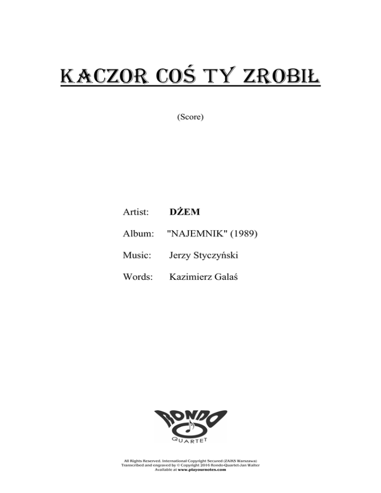 KACZOR COŚ TY ZROBIŁ (Score) Artist: DŻEM Album: "NAJEMNIK" (1989) Music: Jerzy Styczyński Words: Kazimierz Galaś All Rights Reserved. International Copyright Secured (ZAiKS Warszawa) Transcribed and engraved by © Copyright 2016 Rondo-Quartet-Jan Walter Available at www.playournotes.com KACZOR COŚ TY ZROBIł 1 SCORE from "NAJEMNIK" (1989) q»¡¶º Music by Jerzy Styczyński Words by Kazimierz Galaś DŻEM A 1 VOCAL GUITAR 1 GUITAR 2 ### 4 V 4 ∑ BASS GUITAR DRUMS ª 5 Gtr 1 Gtr 2 Snth B.G. Drm R.Q. ∑ ∑ ### 4 œ œœ œœ œ œ œ V 4 œœ œ œ œœ œœœ œ œ œœœ œœœ œ œœ œœœ œ œ œœœ œ œ œœ œœœ œ œ œœœ œ œ œœ œœ œ œ. œ. > œ. œ. œ. œ. >œ œ œ. œ. œ. œ. > œ. œ. œ. œ. > nœ œ ### 4 ∑ ∑ ∑ ∑ V 4 ### 4 & 4 SYNTHESIZER ∑ ∑ ∑ ∑ ∑ ∑ ∑ ∑ ∑ t ### 4 4 ∑ ∑ ∑ ∑ 4 4 ∑ ∑ ∑ ∑ ? ### 4 4 ÷ # # # n œœ œœ œ œ V œ. œ. ### V œœ œ >œ ∑ EL. PIANO œœ œœ œœ œœ . . ‘ ‘ ∑ ∑ n œœ œœ œ œ œ. œ. œœ œ >œ œœ œœ ∑ ### ∑ ∑ ∑ ∑ ? ### ∑ ∑ ∑ ∑ t ### ∑ ∑ ∑ ÷ ∑ ∑ ∑ & ª nœ œ nœ œ œ œ œ œ œ œ C Ó All Rights Reserved. International Copyright Secured (ZAiKS Warszawa) Transcribed and engraved by © Copyright 2016 Rondo-Quartet-Jan Walter Available at www.playournotes.com ‰ Dj A. A A A ‰ CJ Œ J.W. KACZOR COŚ TY ZROBIŁ - (score) 9 Gtr 1 Gtr 2 Snth B.G. Drm ### œ œœ œ œ V œ. œ. ### œ ‰ œœ V # # & # œœœ œ ? ### œ œ 2 œœ >œ j œœ >œ œœ œ œœ œ ‰ œœj œœ œœ œœ j œ ‰ œ œœ œœ œ œ œ œ. œ. œœ œœ >œ œ n œ œ œœ. œœ. ‘ ‘ Œ ‘ ‘ Œ ‘ ‘ ‘ Œ ‘ ‘ ‘ ‘ ‘ ‘ ‘ ‘ t ### œ œ œ œ œ œ œ œ ÷ C A AD A D A AD A ‰ J ‰ J ‰ J D A AD A D A AD A ‰ J ‰ J ‰ J ‘ ª ª ### œ œœ œ œ V œ. œ. ### V 13 Gtr 1 Gtr 2 Snth B.G. Drm R.Q. œœ œœ >œ œ ‘ œœ œœ . . ‘ ‘ ‘ ‘ œœ œ œ œ œ. œ. œœ ‰ œ œœ >œ j œœ >œ œœ œ œœ œ ### ‘ ‘ ‘ ‘ ? ### ‘ ‘ ‘ ‘ t ### ‘ ‘ ‘ & ÷ ‘ ‘ D A AD A D A AD ‰ J ‰ J Œ All Rights Reserved. International Copyright Secured (ZAiKS Warszawa) Transcribed and engraved by © Copyright 2016 Rondo-Quartet-Jan Walter Available at www.playournotes.com ¿¿ œœ ¿ œ œœ œœ ‰ œœ œ œ œ nœ œ œ œ œ D A AD Œ D D A A A Œ J.W. KACZOR COŚ TY ZROBIŁ - (score) 3 B 17 Voc Gtr 1 Gtr 2 Snth B.G. Drm V & Gtr 2 Snth B.G. Drm R.Q. œ J œ œ œJ œ RA - NO BU - DZĘ ### ### œ SIĘ œ œ œ œ J SPO - CO ww ww - ‰ Œ NY œ œ nœ #œ œ œ KA - CZOR MĘ - œ œœ œ œ œ >œœ œ. œ. nœ. œ j œ œ Œ ‰ œœ œœ > ˙˙ .. ˙. ˙˙ .. ˙˙ .. ww ww ? ### w w œœœ ww œœ œœ œ œœ œ - - CZY, MĘ œ œ œ. œ. Œ ‰ œj ˙ œœ ˙˙ j œ ‰ œ ˙˙ œ œ t ### œ œ œ œ œ œ œ œ œ œ œ œ œ œ œ œ œ ÷ C A D A D D A A A Œ D A AD A D A AD A ‰ J ‰ J ‰ J V ### V ### V ### & ### 20 Gtr 1 Œ ww w w # # # www V V ª Voc ### AD Œ D A AD Œ AD Œ œ nœ ª ? ### t ### ÷ All Rights Reserved. International Copyright Secured (ZAiKS Warszawa) Transcribed and engraved by © Copyright 2016 Rondo-Quartet-Jan Walter Available at www.playournotes.com J.W.