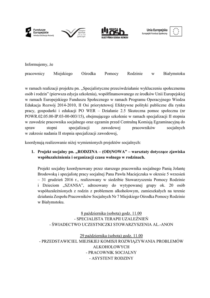 Informujemy, że pracownicy Miejskiego Ośrodka Pomocy Rodzinie w Białymstoku w ramach realizacji projektu pn. ,,Specjalistyczne przeciwdziałanie wykluczeniu społecznemu osób i rodzin” (pierwsza edycja szkolenia), współfinansowanego ze środków Unii Europejskiej w ramach Europejskiego Funduszu Społecznego w ramach Programu Operacyjnego Wiedza Edukacja Rozwój 2014-2010, II Osi priorytetowej Efektywne polityki publiczne dla rynku pracy, gospodarki i edukacji PO WER – Działanie 2.5 Skuteczna pomoc społeczna (nr POWR.02.05.00-IP.03-00-003/15), obejmującego szkolenie w ramach specjalizacji II stopnia w zawodzie pracownika socjalnego oraz egzamin przed Centralną Komisją Egzaminacyjną do spraw stopni specjalizacji zawodowej pracowników socjalnych w zakresie nadania II stopnia specjalizacji zawodowej, koordynują realizowanie niżej wymienionych projektów socjalnych: 1. Projekt socjalny pn. „RODZINA – (OD)NOWA” – warsztaty dotyczące zjawiska współuzależnienia i organizacji czasu wolnego w rodzinach. Projekt socjalny koordynowany przez starszego pracownika socjalnego Panią Jolantę Brodowską i specjalistę pracy socjalnej Pana Pawła Maciejczuka w okresie 5 wrzesień – 31 grudzień 2016 r., realizowany w siedzibie Stowarzyszenia Pomocy Rodzinie i Dzieciom „SZANSA”, adresowany do wytypowanej grupy ok. 20 osób współuzależnionych z rodzin z problemem alkoholowym, zamieszkałych na terenie działania Zespołu Pracowników Socjalnych Nr 7 Miejskiego Ośrodka Pomocy Rodzinie w Białymstoku. 8 października (sobota) godz. 11.00 - SPECJALISTA TERAPII UZALEŻNIEŃ - ŚWIADECTWO UCZESTNICZKI STOWARZYSZENIA AL.-ANON 29 października (sobota) godz. 11.00 - PRZEDSTAWICIEL MIEJSKIEJ KOMISJI ROZWIĄZYWANIA PROBLEMÓW ALKOHOLOWYCH - PRACOWNIK SOCJALNY - ASYSTENT RODZINY 19 listopada (sobota) godz. 11.00 - WYCHOWAWCA PODWÓRKOWY - PRZEDSTAWICIEL STOWARZYSZENIA POMOCY RODZINIE I DZIECIOM „SZANSA” - ANIMATOR ORGANIZACJI CZASU WOLNEGO W RODZINACH 3 grudnia (sobota) godz. 11.00 - ZABAWA MIKOŁAJKOWA DLA UCZESTNIKÓW NA CZAS TRWANIA ZAJĘĆ ZAPEWNIONO OPIEKĘ DZIECIOM (KĄCIK ZABAW) *** 2. Projekt socjalny pn. „WIEMY WIĘCEJ” - mający na celu podniesienie umiejętności w zakresie bezpiecznego korzystania z Internetu. Projekt socjalny koordynowany przez starszych pracowników socjalnych Panią Katarzynę Wojtkowską i Panią Elżbietę Sobieszczańską w okresie 5 wrzesień – 31 grudzień 2016 r., realizowany w świetlicy dziennego pobytu dla dzieci przy dziennym Domu Pomocy Społecznej ul. Barszczańska 18 w Białymstoku, adresowany do wytypowanej grupy ok. 30 osób (rodzin i dzieci w wieku 5-9 lat) z osiedla Starosielce. 21 październik 2016r. godz. 15.00 - CERTYFIKOWANY SPECJALISTA PSYCHOTERAPII UZALEŻNIEŃ - zagrożenia cyber przemocą, ukazanie niebezpieczeństw w sieci, konsultacje ze specjalistą. 4 listopad 2016r godz. 15.00 - ZESPÓŁ SZKOLNO – PRZEDSZKOLNY NR 1 W BIAŁYMSTOKU- warsztaty dla rodziców i dzieci w zakresie bezpiecznego korzystania z Internetu, wystawa prac plastycznych dzieci, ukazanie Internetu jako wspólnego miejsca do nauki i zabawy. 18 listopad 2016r. godz. 15.00 - ZESPÓŁ SZKOLNO – PRZEDSZKOLNY NR 1 W BIAŁYMSTOKU, PRACOWNIK SOCJALNY- warsztaty dla rodziców mające na celu podniesienie poziomu umiejętności w zakresie bezpiecznego korzystania z cyberprzestrzeni oraz reagowania na zagrożenia, które w niej występują; przekazanie informacji o instytucjach świadczących pomoc dla rodzin z problemami opiekuńczo – wychowawczymi. *** 3. Projekt socjalny pn. „RODZINA RAZEM – RODZINIE LEPIEJ” Pracownicy Socjalni Miejskiego Ośrodka Pomocy Rodzinie w Białymstoku- Danuta Świętochowska i Małgorzata Mikołajewska, w partnerstwie ze Stowarzyszeniem Pomocy Rodzinie i Dzieciom "Szansa" , Stowarzyszeniem Wspierania Środowisk Lokalnych "Aktywne Osiedle" , Centrum Integracji Społecznej "Żelazna" Stowarzyszenia "Ku Dobrej Nadziei" rozpoczęli realizację projektu socjalnego pod nazwą: "RODZINA RAZEM - RODZINIE LEPIEJ" Projekt adresowany jest do 10 rodzin mieszkających na osiedlu przy ul. Barszczańskiej i Klepackiej w Białymstoku w obrębie dzielnicy Starosielce. Celem projektu jest wzmocnienie więzi rodzinnych poprzez nabycie umiejętności konstruktywnego spędzania czasu wolnego. Wszelkie działania projektowe w trakcie spotkań i warsztatów, będą miały na celu wzmacnianie więzi rodzinnych, poprawianiu relacji w rodzinach, podnoszeniu umiejętności prawidłowych i rozwojowych form spędzania czasu wolnego. Wszyscy uczestnicy projektu mają zapewnione przyjazne miejsce, w którym będą się odbywały spotkania, profesjonalną opiekę nad dziećmi, ciekawie prowadzone zajęcia, wysokiej klasy trenerów. Dajemy szansę naszym rodzinom na jeszcze lepsze życie. "Rodzina razem - rodzinie lepiej"