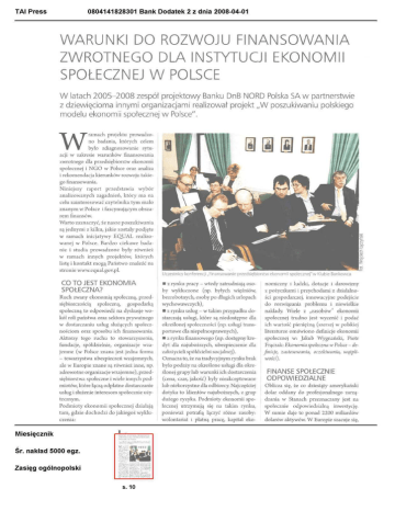 TAI Press 0804141828301 Bank Dodatek 2 z dnia 2008-04-01 WARUNKI DO ROZWOJU FINANSOWANIA ZWROTNEGO DLA INSTYTUCJI EKONOMII SPOŁECZNEJ W POLSCE W latach 2005-2008 zespół projektowy Banku DnB NORD Polska SA w partnerstwie z dziewięcioma innymi organizacjami realizował projekt „W poszukiwaniu polskiego modelu ekonomii społecznej w Polsce". ramach projektu prowadzono badania, których celem było zdiagnozowanie sytuacji w zakresie warunków finansowania zwrotnego dla przedsiębiorstw ekonomii społecznej i NGO w Polsce oraz analiza i rekomendacja kierunków rozwoju takiego finansowania. Niniejszy raport przedstawia wybór analizowanych zagadnień, który ma na celu zainteresować czytelnika tym mało znanym w Polsce i fascynującym obszarem finansów. Warto zaznaczyć, że nasze poszukiwania są jednymi z kilku, jakie zostały podjęte w ramach inicjatywy EOJJAL realizowanej w Polsce. Bardzo ciekawe badanie i studia prowadzone były również w ramach innych projektów, których listę i kontakt mogą Państwo znaleźć na stronie www.equal.gov.pl. W CO TO JEST EKONOMIA SPOŁECZNA? Ruch zwany ekonomią społeczną, przedsiębiorczością społeczną, gospodarką społeczną to odpowiedź na dyskusje wokół roli państwa oraz sektora prywatnego w dostarczaniu usług służących społecznościom oraz sposobu ich finansowania. Aktorzy tego ruchu to stowarzyszenia, fundacje, spółdzielnie, organizacje wzajemne (w Polsce znana jest jedna forma - towarzystwa ubezpieczeń wzajemnych, ale w Europie znane są również inne, np. zdrowotne organizacje wzajemne), przedsiębiorstwa społeczne i wiele innych podmiotów, które łączą odpłatne dostarczanie usług i służenie interesom społecznie użytecznym. Podmioty ekonomii społecznej działają tam, gdzie dochodzi do jakiegoś wyklu- Miesięcznik Śr. nakład 5000 egz. Zasięg ogólnopolski s. 10 Uczestnicy konferencji „Finansowanie przedsiębiorstw ekonomii społecznej" w Klubie Bankowca • z rynku pracy - wtedy zatrudniają osoby wykluczone (np. byłych więźniów, bezrobotnych, osoby po długich urlopach wychowawczych), • z rynku usług - w takim przypadku dostarczają usługi, które są niedostępne dla określonej społeczności (np. usługi transportowe dla niepełnosprawnych), • z rynkufinansowego(np. dostępny kredyt dla najuboższych, ubezpieczenie dla założycieli spółdzielni socjalnej). Oznacza to, że na tradycyjnym rynku brak było podaży na określone usługi dla określonej grupy lub warunki ich dostarczenia (cena, czas, jakość) były nieakceptowane lub niekorzystne dla odbiorcy. Najczęściej dotyka to klientów najuboższych, z grup dużego ryzyka. Podmioty ekonomii społecznej utrzymują się na takim rynku, ponieważ potrafią łączyć różne zasoby: wolontariat i płatną pracę, kapitał eko- nomiczny i ludzki, dotacje i darowizny z pożyczkami i przychodami z działalności gospodarczej, innowacyjne podejście do rozwiązania problemu i niewielkie nakłady. Wiele z „zasobów" ekonomii społecznej trudno jest wycenić i podać ich wartość pieniężną (szerzej w polskiej literaturze omówiono definicje ekonomii społecznej w: Jakub Wygnański, Piotr Frączak: Ekonomia społeczna w Polsce - definicje, zastosowania, oczekiwania, wątpliwości). FINANSE SPOŁECZNIE ODPOWIEDZIALNE Oblicza się, że co dziesiąty amerykański dolar oddany do profesjonalnego zarządzania w Stanach przeznaczany jest na społecznie odpowiedzialną inwestycję. W sumie daje to ponad 2200 miliardów dolarów aktywów. W Europie szacuje się, TAI Press 0804141828302 Bank Dodatek 2 z dnia 2008-04-01 że zainwestowane środki to 360 miliardów euro. Amerykańskie Forum Inwestycji Społecznych (Social Investment Forum; SIF) ocenia, że w ciągu 10 lat społecznie odpowiedzialne inwestycje (SRl) w Stanach urosły o 258 proc. Według francuskiego stowarzyszenia Finansol monitorującego rynek finansów solidarnych, wielkość francuskich oszczędności solidarnych potroiła się w ciągu pięciu lat od 1999 r., żeby w 2004 r. przekroczyć próg 600 milionów euro. Powyższe dane pokazują, że rynek finansów, w których parametry finansowe nie są jedynym kryterium wyboru, rozwija się dynamicznie po obu stronach Atlantyku. Przytoczone dane, ze względu na brak ścisłej definicji takich terminów, jak „inwestycje społecznie odpowiedzialne" czy „oszczędności solidarne" należy jednak traktować jako szacunkowe. Wieloletnie prace zarówno SIF, jak i Finansol dotyczące określenia znaczenia tych terminów nie przyniosły jeszcze ogólnie zaakceptowanej definicji. Pewną powszechną praktykę zaczynają wyznaczać działania certyfikujące produkty SRI i finansów solidarnych. W Europie zajmuje się tym dla produktów francuskich - Finansol, który przyznaje tzw. Label Finansol. Od niedawna rozpoczęły się również wspólne działania europejskich finansistów społecznych na rzecz stworzenia znaku europejskiego (projekt Fineurosol). Obecnie w Europie można zauważyć współistnienie dwóch podstawowych trendów, które opisujemy poniżej: 1) finansowania społecznie odpowiedzialnego; 2) finansowania solidarnego. FINANSOWANIE SPOŁECZNIE ODPOWIEDZIALNE Social responsible investing (SRI) można określić jako poszukiwanie takich inwestycji, które są jednocześnie dochodowe i wpływają pozytywnie na społeczeństwo. Oznacza to, że elementem oddziałującym na decyzję inwestora są społeczne i środowiskowe (w rozumieniu ochrony środowiska naturalnego) skutki inwestycji. Kryteria kwalifikacyjne są bardzo różne. Niektórzy inwestorzy ograniczają się do weryfikacji, czy podmiot finansowany nie przeznacza otrzymanych środków na handel bro- Miesięcznik Śr. nakład 5000 egz. Zasięg ogólnopolski s. 11 nią, żywym towarem, prostytucję, terroryzm i inne praktyki powszechnie uznawane za niedopuszczalne. Inni oczekują większego zaangażowania, na przykład poprzez ograniczenie się do określonego typu dzi