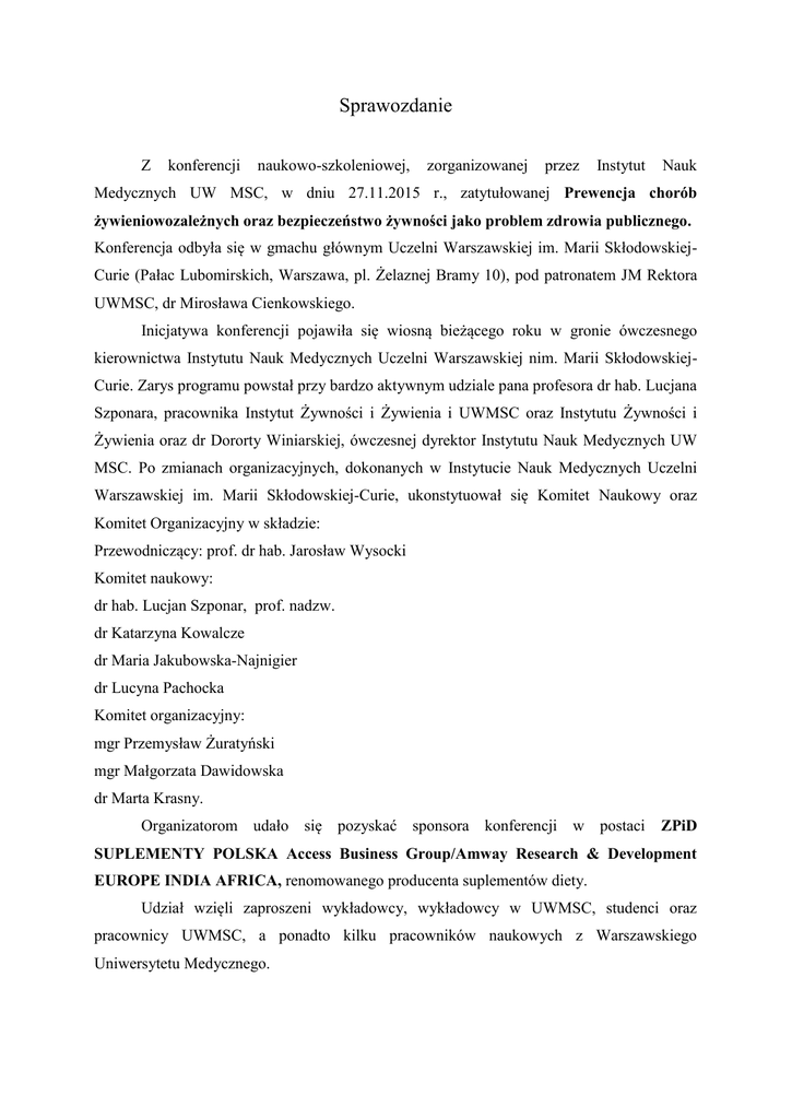 Sprawozdanie Z konferencji naukowo-szkoleniowej, zorganizowanej przez Instytut Nauk Medycznych UW MSC, w dniu 27.11.2015 r., zatytułowanej Prewencja chorób żywieniowozależnych oraz bezpieczeństwo żywności jako problem zdrowia publicznego. Konferencja odbyła się w gmachu głównym Uczelni Warszawskiej im. Marii SkłodowskiejCurie (Pałac Lubomirskich, Warszawa, pl. Żelaznej Bramy 10), pod patronatem JM Rektora UWMSC, dr Mirosława Cienkowskiego. Inicjatywa konferencji pojawiła się wiosną bieżącego roku w gronie ówczesnego kierownictwa Instytutu Nauk Medycznych Uczelni Warszawskiej nim. Marii SkłodowskiejCurie. Zarys programu powstał przy bardzo aktywnym udziale pana profesora dr hab. Lucjana Szponara, pracownika Instytut Żywności i Żywienia i UWMSC oraz Instytutu Żywności i Żywienia oraz dr Dororty Winiarskiej, ówczesnej dyrektor Instytutu Nauk Medycznych UW MSC. Po zmianach organizacyjnych, dokonanych w Instytucie Nauk Medycznych Uczelni Warszawskiej im. Marii Skłodowskiej-Curie, ukonstytuował się Komitet Naukowy oraz Komitet Organizacyjny w składzie: Przewodniczący: prof. dr hab. Jarosław Wysocki Komitet naukowy: dr hab. Lucjan Szponar, prof. nadzw. dr Katarzyna Kowalcze dr Maria Jakubowska-Najnigier dr Lucyna Pachocka Komitet organizacyjny: mgr Przemysław Żuratyński mgr Małgorzata Dawidowska dr Marta Krasny. Organizatorom udało się pozyskać sponsora konferencji w postaci ZPiD SUPLEMENTY POLSKA Access Business Group/Amway Research & Development EUROPE INDIA AFRICA, renomowanego producenta suplementów diety. Udział wzięli zaproszeni wykładowcy, wykładowcy w UWMSC, studenci oraz pracownicy UWMSC, a ponadto kilku pracowników naukowych z Warszawskiego Uniwersytetu Medycznego. Konferencja odbyła się zgodnie z planem w dniu 27 listopada br. Otwarcia o godzinie 9,00, w auli siedziby głównej Uczelni, dokonał prof. dr hab. Jarosław Wysocki, Dyrektor Instytutu Nauk Medycznych Uczelni Warszawskiej im. Marii Skłodowskiej-Curie, dziękując przybyłym, w szczególności Wykładowcom spoza Uczelni. Jako pierwszy zabrał głos prof. dr hab. Lucjan Szponar, który omówił stan obecny stanu odżywienia populacji polskiej, w porównaniu z poprzednimi okresami, w świetle badań epidemiologicznych, zrealizowanych na ogólnopolskich reprezentatywnych próbach. Podkreślił liczne zagrożenia zdrowotne wynikające z zaniedbań i błędów dietetycznych, w szczególności w grupie kobiet w wieku prokreacyjnym. Dr Katarzyna Kowalcze, adiunkt Katedry Dietetyki i Oceny Żywności Instytutu Nauk o Zdrowiu Uniwersytetu Przyrodniczo-Humanistycznego w Siedlcach, zarysowała problematykę wpływu złej diety, prowadzącej do otyłości i cukrzycy typu 2. Dietozależne czynniki ryzyka choroby nadciśnieniowej omówiła dr Maria Jakubowska-Najnigier z Uczelni Warszawskiej UW MSC. Zwróciła uwagę na nadmierną podaż kalorii w diecie, prowadzącą do nadwagi, na niedobór nienasyconych kwasów tłuszczowych, nadmiar sodu oraz palenie papierosów i innych wyrobów tytoniowych i spożywanie nadmiernych ilości alkoholu. Obturacyjny bezdech senny jako niedoceniany problem społeczny omówił prof. dr hab. Jarosław Wysocki. Zarysował tę jednostkę chorobową, omówił epidemiologię, przebieg i konsekwencje zdrowotne nieleczonego zespołu. W dyskusji po wszystkich referatach padło szereg argumentów za koniecznością zintensyfikowania edukacji zdrowotnej społeczeństwa. Podkreślano rolę pielęgniarek w systemie ochrony zdrowia i edukacji zdrowotnej społeczeństwa. Po przerwie głos zabrał przedstawiciel sponsora, mgr Jarosław Lichodziejewski, omawiając znaczenie suplementacji codziennej diety u osób nie spożywających odpowiedniej ilości owoców i warzyw. Omówił sytuację epidemiologiczną w zakresie odpowiedniego spożycia owoców i warzyw w Europie i na świecie. Podkreślił znaczenie przeciwnowotworowe polifenoli zawartych w codziennej diecie (owoce, warzywa), a także w suplementach diety. Zwrócił uwagę na bardzo duże zróżnicowanie suplementów dostępnych na rynku polskim pod względem ich skuteczności i bezpieczeństwa. Znaczenie tłuszczów w codziennej diecie omówił uznany ekspert w tej dziedzinie z Katedry Dietetyki i Oceny Żywności Instytutu Nauk o Zdrowiu, prof. nadzw. Uniwersytetu Przyrodniczo- Humanistycznego w Siedlcach, dr hab. Wojciech Kolanowski. W jego wykładzie znalazły się bardzo szczegółowe dane dotyczące znaczenia niezbędnych wielonienasyconych kwasów tłuszczowych omega-3 i omega-6, a także jednonienasyconych kwasów tłuszczowych z wyszczególnieniem polecanych produktów, najbogatszych w te składniki. Kolejnym tematem był system bezpieczeństwa żywności w Unii Europejskiej, który podjęła dr Hanna Turlejska, emerytowany pracownik Instytutu Żywności i Żywienia, obecnie wykładowca UWMSC. Pani doktor omówiła kluczowe zagrożenia dla bezpieczeństwa żywności oraz uregulowania prawne zabezpieczające odpowiednią jakość w tym zakresie. Dr hab. Elżbieta KrzęcioNieczyporuk, prof. nadzw. Uniwersytetu Przyrodniczo-Humanistycznego w Siedlcach omówiła zanieczyszczenia w żywności. Wykład przybliżył słuchaczom różnorodność zagrożeń bezpieczeństwa żywności, w postaci zanieczyszczeń fizycznych, biologicznych i chemicznych. Konferencję zakończył prof. dr hab. Jarosław Wysocki, dziękując wykładowcom i słuchaczom. Warto podkreślić bardzo liczny udział studentów kierunku pielęgniarstwo UW MSC w konferencji oraz ich aktywność w dyskusjach po referatach.
