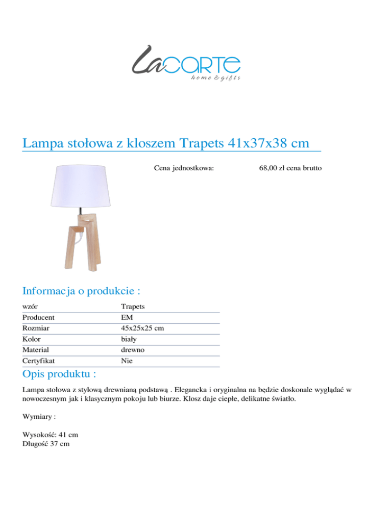 Lampa stołowa z kloszem Trapets 41x37x38 cm Cena jednostkowa: 68,00 zł cena brutto Informacja o produkcie : wzór Producent Rozmiar Kolor Material Certyfikat Trapets EM 45x25x25 cm biały drewno Nie Opis produktu : Lampa stołowa z stylową drewnianą podstawą . Elegancka i oryginalna na będzie doskonale wyglądać w nowoczesnym jak i klasycznym pokoju lub biurze. Klosz daje ciepłe, delikatne światło. Wymiary : Wysokość: 41 cm Długość 37 cm Szerokość: 38 cm Powered by TCPDF (www.tcpdf.org)