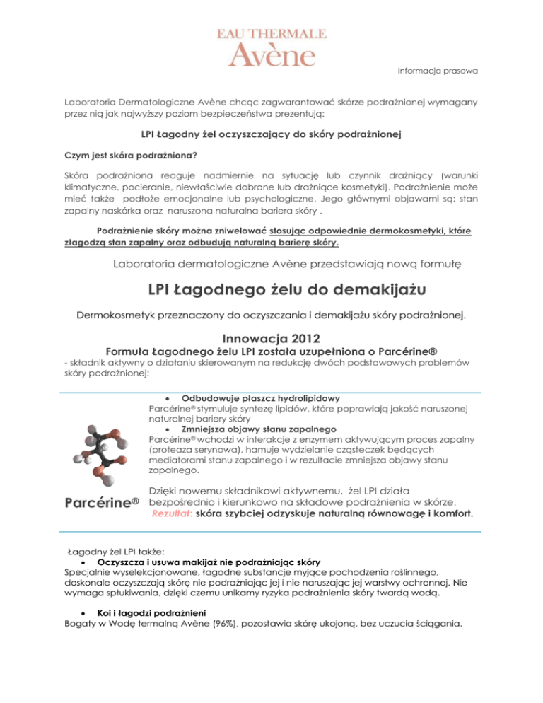 Informacja prasowa Laboratoria Dermatologiczne Avène chcąc zagwarantować skórze podrażnionej wymagany przez nią jak najwyższy poziom bezpieczeństwa prezentują: LPI Łagodny żel oczyszczający do skóry podrażnionej Czym jest skóra podrażniona? Skóra podrażniona reaguje nadmiernie na sytuację lub czynnik drażniący (warunki klimatyczne, pocieranie, niewłaściwie dobrane lub drażniące kosmetyki). Podrażnienie może mieć także podłoże emocjonalne lub psychologiczne. Jego głównymi objawami są: stan zapalny naskórka oraz naruszona naturalna bariera skóry . Podrażnienie skóry można zniwelować stosując odpowiednie dermokosmetyki, które złagodzą stan zapalny oraz odbudują naturalną barierę skóry. Laboratoria dermatologiczne Avène przedstawiają nową formułę LPI Łagodnego żelu do demakijażu Dermokosmetyk przeznaczony do oczyszczania i demakijażu skóry podrażnionej. Innowacja 2012 Formuła Łagodnego żelu LPI została uzupełniona o Parcérine® - składnik aktywny o działaniu skierowanym na redukcję dwóch podstawowych problemów skóry podrażnionej: Odbudowuje płaszcz hydrolipidowy Parcérine® stymuluje syntezę lipidów, które poprawiają jakość naruszonej naturalnej bariery skóry Zmniejsza objawy stanu zapalnego Parcérine® wchodzi w interakcje z enzymem aktywującym proces zapalny (proteaza serynowa), hamuje wydzielanie cząsteczek będących mediatorami stanu zapalnego i w rezultacie zmniejsza objawy stanu zapalnego. Parcérine® Dzięki nowemu składnikowi aktywnemu, żel LPI działa bezpośrednio i kierunkowo na składowe podrażnienia w skórze. Rezultat: skóra szybciej odzyskuje naturalną równowagę i komfort. Łagodny żel LPI także: Oczyszcza i usuwa makijaż nie podrażniając skóry Specjalnie wyselekcjonowane, łagodne substancje myjące pochodzenia roślinnego, doskonale oczyszczają skórę nie podrażniając jej i nie naruszając jej warstwy ochronnej. Nie wymaga spłukiwania, dzięki czemu unikamy ryzyka podrażnienia skóry twardą wodą. Koi i łagodzi podrażnieni Bogaty w Wodę termalną Avène (96%), pozostawia skórę ukojoną, bez uczucia ściągania. Informacja prasowa Aby zapewnić doskonałą tolerancję i zminimalizować ryzyko podrażnień Łagodny żel oczyszczający LPI zawiera minimalną ilość wyselekcjonowanych i bardzo łagodnych składników. Ma lekką nietłustą konsystencję, daje natychmiastowe uczucie odświeżenia i komfortu. Nie powoduje uczucia ściągnięcia skóry. Nie wymaga spłukiwania, dzięki czemu nie ma ryzyka podrażnienia skóry twardą wodą. Nie zawiera substancji zapachowych ani parabenów. Produkt hipoalergiczny. Nie powoduje powstawania zaskórników Pojemność: 200 ml Cena około: 62.00 pln