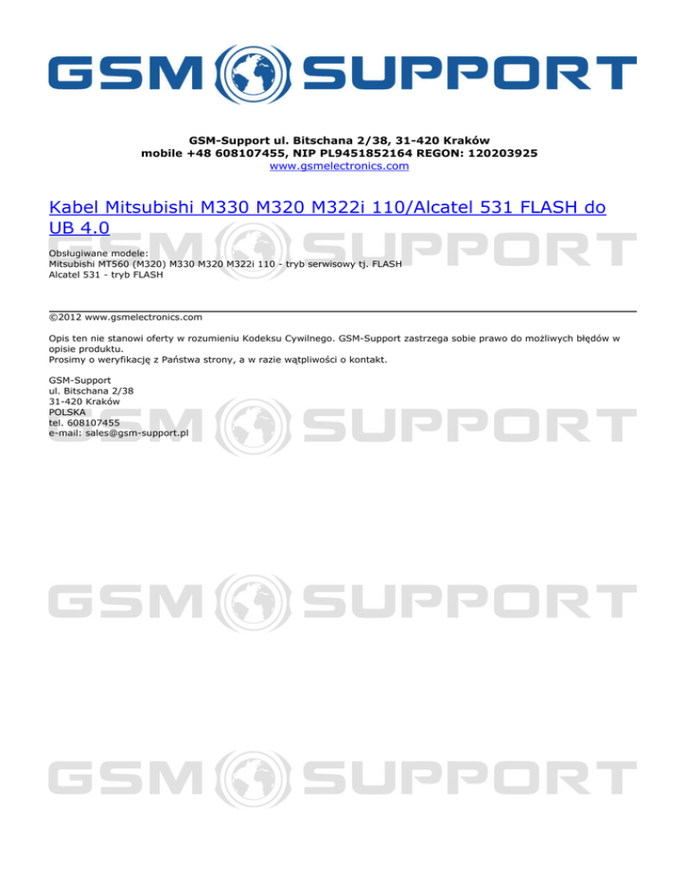 GSM-Support ul. Bitschana 2/38, 31-420 Kraków mobile +48 608107455, NIP PL9451852164 REGON: 120203925 www.gsmelectronics.com Kabel Mitsubishi M330 M320 M322i 110/Alcatel 531 FLASH do UB 4.0 Obsługiwane modele: Mitsubishi MT560 (M320) M330 M320 M322i 110 - tryb serwisowy tj. FLASH Alcatel 531 - tryb FLASH ©2012 www.gsmelectronics.com Opis ten nie stanowi oferty w rozumieniu Kodeksu Cywilnego. GSM-Support zastrzega sobie prawo do możliwych błędów w opisie produktu. Prosimy o weryfikację z Państwa strony, a w razie wątpliwości o kontakt. GSM-Support ul. Bitschana 2/38 31-420 Kraków POLSKA tel. 608107455 e-mail: [email protected] Powered by TCPDF (www.tcpdf.org)