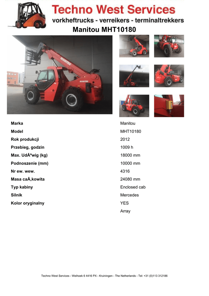 Manitou MHT10180 Marka Manitou Model MHT10180 Rok produkcji 2012 Przebieg, godzin 1009 h Max. Udźwig (kg) 18000 mm Podnoszenie (mm) 10000 mm Nr ew. wew. 4316 Masa całkowita 24080 mm Typ kabiny Enclosed cab Silnik Mercedes Kolor oryginalny YES Array Techno West Services - Weihoek 6 4416 PX - Kruiningen - The Netherlands - Tel: +31 (0)113 312186