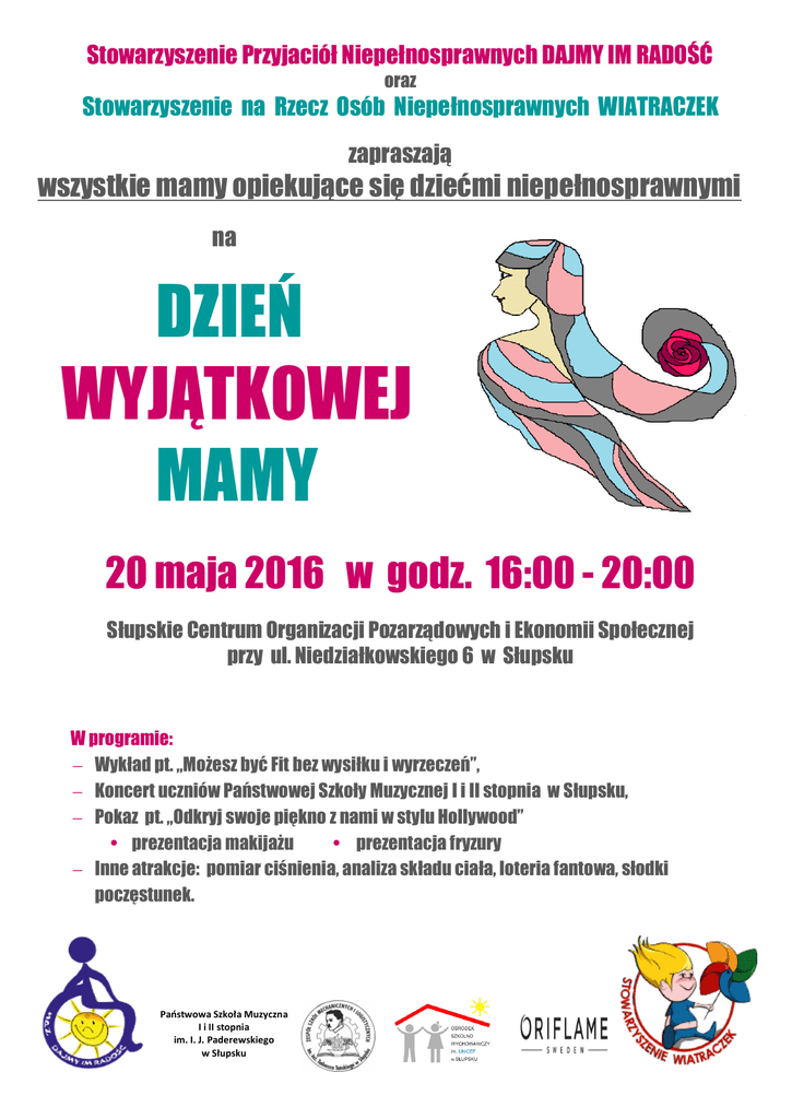 Stowarzyszenie Przyjaciół Niepełnosprawnych DAJMY IM RADOŚĆ oraz Stowarzyszenie na Rzecz Osób Niepełnosprawnych WIATRACZEK zapraszają wszystkie mamy opiekujące się dziećmi niepełnosprawnymi na DZIEŃ WYJĄTKOWEJ MAMY 20 maja 2016 w godz. 16:00 - 20:00 Słupskie Centrum Organizacji Pozarządowych i Ekonomii Społecznej przy ul. Niedziałkowskiego 6 w Słupsku W programie: Wykład pt. „Możesz być Fit bez wysiłku i wyrzeczeń”, Koncert uczniów Państwowej Szkoły Muzycznej I i II stopnia w Słupsku, Pokaz pt. „Odkryj swoje piękno z nami w stylu Hollywood” • prezentacja makijażu • prezentacja fryzury Inne atrakcje: pomiar ciśnienia, analiza składu ciała, loteria fantowa, słodki poczęstunek. Państwowa Szkoła Muzyczna I i II stopnia im. I. J. Paderewskiego w Słupsku