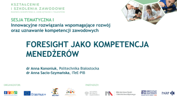 SESJA TEMATYCZNA I Innowacyjne rozwiązania wspomagające rozwój oraz uznawanie kompetencji zawodowych FORESIGHT JAKO KOMPETENCJA MENEDŻERÓW dr Anna Kononiuk, Politechnika Białostocka dr Anna Sacio-Szymańska, ITeE-PIB PLAN WYSTĄPIENIA Trendy kształtujące działalność gospodarczą Definicja foresightu w przedsiębiorstwie Model dojrzałości foresightowej Studia przypadków Korzyści ze stosowania badań foresightowych w przedsiębiorstwie TRENDY KSZTAŁTUJĄCE DZIAŁALNOŚĆ GOSPODARCZĄ (1) niestabilność polityczna i społeczna potrzeba przetwarzania i interpretowania informacji pochodzących z wielu źródeł wejście pokolenia Y na rynek pracy nowe wymagania konsumentów krótsze cykle produkcyjne http://www.davebratcher.com/2013/06/0 3/3-tools-to-overcome-informationoverload/ http://www.businessnewsdaily.co m/538-experts-predict-2011consumer-demands.html TRENDY KSZTAŁTUJĄCE DZIAŁALNOŚĆ GOSPODARCZĄ (2) Wzrost znaczenia Chin w gospodarce światowej http://www.telegraph.co.uk/news/worldnews/asia/chi na/8776515/The-rise-and-rise-of-Mandarin-but-howmany-will-end-up-speaking-it.html Rozwój technologii GRIN http://41.185.8.113/~brancken /brancken.net/index.php/en/af rikaans/abri-se-lofaanbiddingsliedere/154-uit-diediepte-van-my-lirieke-en-kitaardrukke FORESIGHT W PRZEDSIĘBIORSTWIE Zdolność do identyfikacji zmian w mikroi makrootoczeniu, interpretacji ich oddziaływania na przedsiębiorstwo oraz formułowania strategii, która zapewni długoterminowy sukces firmy (Rohrbeck, 2011) ZARZĄDZANIE INNOWACJAMI ZARZĄDZANIE STRATEGICZNE STUDIA NAD PRZYSZŁOŚCIĄ http://www.psdtex.com/creative-business-posters-psd-free.html ZAŁOŻENIA FORESIGHTU STRATEGICZNEGO alternatywne wizje przyszłości są możliwe na przyszłość można wpływać przywództwo odgrywa kluczową rolę w organizacji przyszłość jest kształtowana przez różnych interesariuszy dzikie karty mogą zmienić wytyczone ścieżki rozwoju horyzont czasowy zależy od dynamiki zjawisk można zidentyfikować kluczowe czynniki wpływające na działalność gospodarczą REZULTATY WYBRANE METODY FORESIGHTOWE Meisner, Egorova, 2015 KOSZTY KOMPETENCJA FORESIGHTOWA (CONWAY) wartości/ przekonania MODEL DOJRZAŁOŚCI FORESIGHTOWEJ Model dojrzałości foresightowej pozwala: (1) określić obecny stan zdolności foresightowej przedsiębiorstwa w świetle referencyjnych kryteriów oraz (2) wskazać obszary wymagające poprawy. Zawiera zbiór najlepszych praktyk budowania foresightu strategicznego w przedsiębiorstwie Model dojrzałości foresightowej umożliwia ocenę: • Przywództwa • Wyznaczania celów działalności • Planowania • Skanowania otoczenia • Prognozowania • Wyznaczania wizji rozwoju przedsiębiorstwa Dla każdej z powyższych dyscyplin, ankieta opisuje od 3 do 5 praktyk – czyli aktywności które pozwalają na efektywne wdrożenie dyscypliny. T. Grim (2009) PRZYKŁAD OCENY ORGANIZACYJNEJ T. Grim (2009) Ad hoc (pozioml 1). Organizacja nie jest świadoma bądź jest jedynie marginalnie świadoma swoich procesów. Większość prac jest wykonywana bez planów bądź ekspertyz. Świadoma (poziom 2). Organizacja jest świadoma tego, że istnieją najlepsze praktyki w odniesieniu do procesów. Zdolna (poziom 3). Organizacja wypracowała zestaw dobrych praktyk. Dojrzała (pozioml 4). Organizacja zainwestowała dodatkowe zasoby na potrzeby tworzenia wiedzy specjalistycznej oraz zaawansowanych praktyk. Klasy światowej (poziom 5). Organizacja jest postrzegana jako lider w branży. Kreuje i wdraża nowe metody W JAKI SPOSÓB DZIAŁA MODEL? Każda dyscyplina zawiera od 3 do 5 praktyk. Praktyki te nie są krokami w procesie, ale elementami, które pozwalają na wdrożenie dyscypliny z powodzeniem. Dyscyplina Praktyka Skanowanie 1. Identyfikacja obszarów do realizacji w projekcie. 2. Zbieranie informacji ze zróżnicowanych i rzetelnych źródeł danych. 3. Identyfikacja czynników sygnalizujących nadchodzące zmiany, które mogą mieć wpływ na badany system. 4. Integracja zewnętrznych i wewnętrznych informacji w ramach spójnego systemu zarządzania informacją. 5. Tworzenie użytecznego repozytorium informacyjnego. T. Grim (2009) W JAKI SPOSÓB DZIAŁA MODEL? Dla każdej z praktyk, model zapewnia opis pięciu poziomów dojrzałości. Skanowanie Poziom 1 Ad Hoc Poziom 2 Świadoma Poziom 3 Zdolna Poziom 4 Dojrzała Poziom 5 Klasy światowej Identyfikacja czynników sygnalizujących nadchodzące zmiany, które mogą mieć wpływ na badany system. Źródłem informacji o zmianach są media. Poza informacjami o potencjalnych zmianach z mediów, w przedsiębiorstwi e rozważane są wydarzenia o niskim prawdopodobieńs twie zaistnienia i dużej sile oddziaływania. W przedsiębiorstwie istnieje proces pozwalający na ciągłą ocenę nowych czynników zmian i trendów. Dobre praktyki takie jak identyfikacja dzikich kart, czy też etnografia są stałym elementem kultury organizacyjnej, która pozwala na permanentną identyfikację zmian w otoczeniu. Organizacja stworzyła unikatowe praktyki w branży, które pozwalają ocenić potencjalne zmiany. T. Grim (2009) OCENA DOJRZAŁOŚCI FORESIGHTOWEJ T. Grim (2009) REFLEKSJA Zalety Model stanowi narzędzie oceny, refleksji oraz dyskusji obecnego stanu dojrzałości foresightowej. Model oferuje wskazówki osiągania kolejnych stopni dojrzałości foresightowej. Model pozwala na wyznaczenie kierunków interwencji strategicznej w przedsiębiorstwie. Model kreuje język, który promuje komunikację wewnątrz organizacji oraz poza nią. Uwagi “Mapa nie jest terytorium” , model nie zastąpi bezpośredniego doświadczenia w działalności biznesowej. Budowanie zdolności foresightowej przedsiębiorstwa dotyczy zdobywania kolejnych stopni dojrzałości praktyk oraz określania tego, co jest ważne dla organizacji, a nie osiągania konkretnego stopnia dojrzałości. FORESIGHT NA ŚWIECIE www.millennium-project.org www.feneu.org FORESIGHT W POLSCE • uniwersytety 