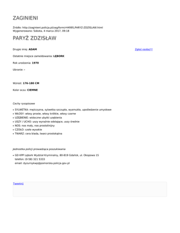 ZAGINIENI Źródło: http://zaginieni.policja.pl/zag/form/r44995,PARYZ-ZDZISLAW.html Wygenerowano: Sobota, 4 marca 2017, 09:18 PARYŻ ZDZISŁAW Drugie imię: ADAM Ostatnie miejsce zameldowania: LĘBORK Rok urodzenia: 1970 Ubranie: - Wzrost: 176-180 CM Kolor oczu: CIEMNE Cechy rysopisowe ● SYLWETKA: mężczyzna, sylwetka szczupła, wysmukła, upośledzenie umysłowe ● WŁOSY: włosy proste, włosy krótkie, włosy czarne ● UZĘBIENIE: widoczne ubytki uzębienia ● USZY / UCHO: uszy wyraźnie odstające, uszy średnie ● NOS: nos mały, nos prostolinijny ● CZOŁO: czoło wysokie ● TWARZ: cera blada, twarz prostokątna Jednostka policji prowadząca poszukiwania ● GD KPP Lębork Wydział Kryminalny, 80-819 Gdańsk, ul. Okopowa 15 telefon: (0-58) 321 5333 email: [email protected] Tweetnij Zgłoś osobę!!!