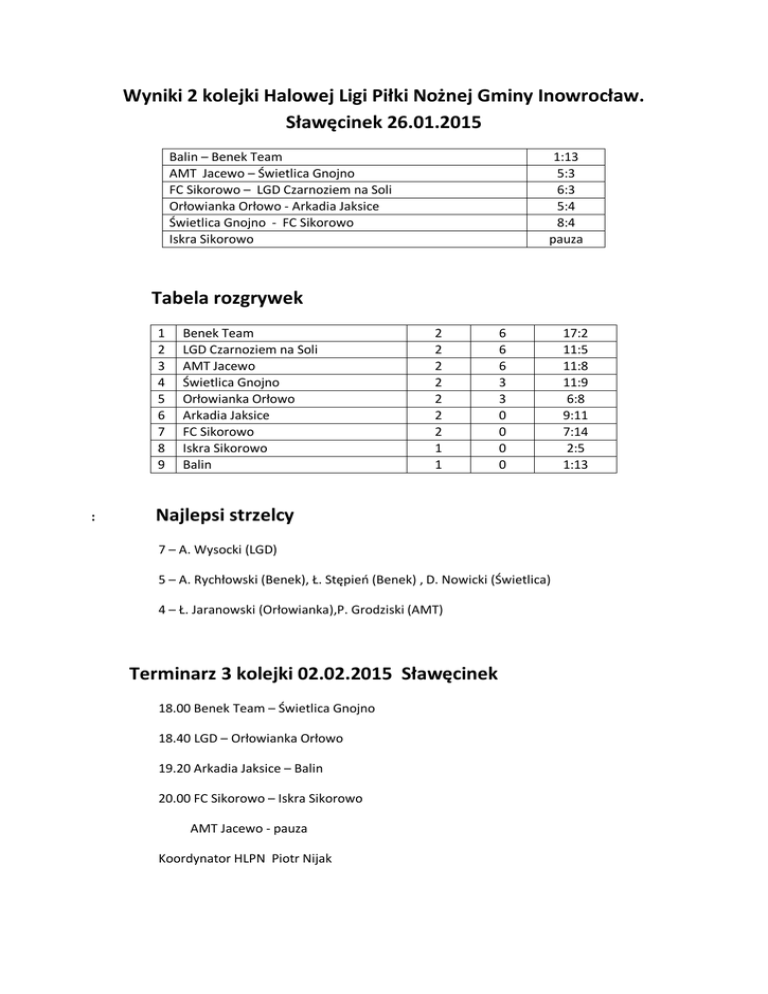 Wyniki 2 kolejki Halowej Ligi Piłki Nożnej Gminy Inowrocław. Sławęcinek 26.01.2015 Balin – Benek Team AMT Jacewo – Świetlica Gnojno FC Sikorowo – LGD Czarnoziem na Soli Orłowianka Orłowo - Arkadia Jaksice Świetlica Gnojno - FC Sikorowo Iskra Sikorowo 1:13 5:3 6:3 5:4 8:4 pauza Tabela rozgrywek 1 2 3 4 5 6 7 8 9 : Benek Team LGD Czarnoziem na Soli AMT Jacewo Świetlica Gnojno Orłowianka Orłowo Arkadia Jaksice FC Sikorowo Iskra Sikorowo Balin 2 2 2 2 2 2 2 1 1 6 6 6 3 3 0 0 0 0 Najlepsi strzelcy 7 – A. Wysocki (LGD) 5 – A. Rychłowski (Benek), Ł. Stępień (Benek) , D. Nowicki (Świetlica) 4 – Ł. Jaranowski (Orłowianka),P. Grodziski (AMT) Terminarz 3 kolejki 02.02.2015 Sławęcinek 18.00 Benek Team – Świetlica Gnojno 18.40 LGD – Orłowianka Orłowo 19.20 Arkadia Jaksice – Balin 20.00 FC Sikorowo – Iskra Sikorowo AMT Jacewo - pauza Koordynator HLPN Piotr Nijak 17:2 11:5 11:8 11:9 6:8 9:11 7:14 2:5 1:13