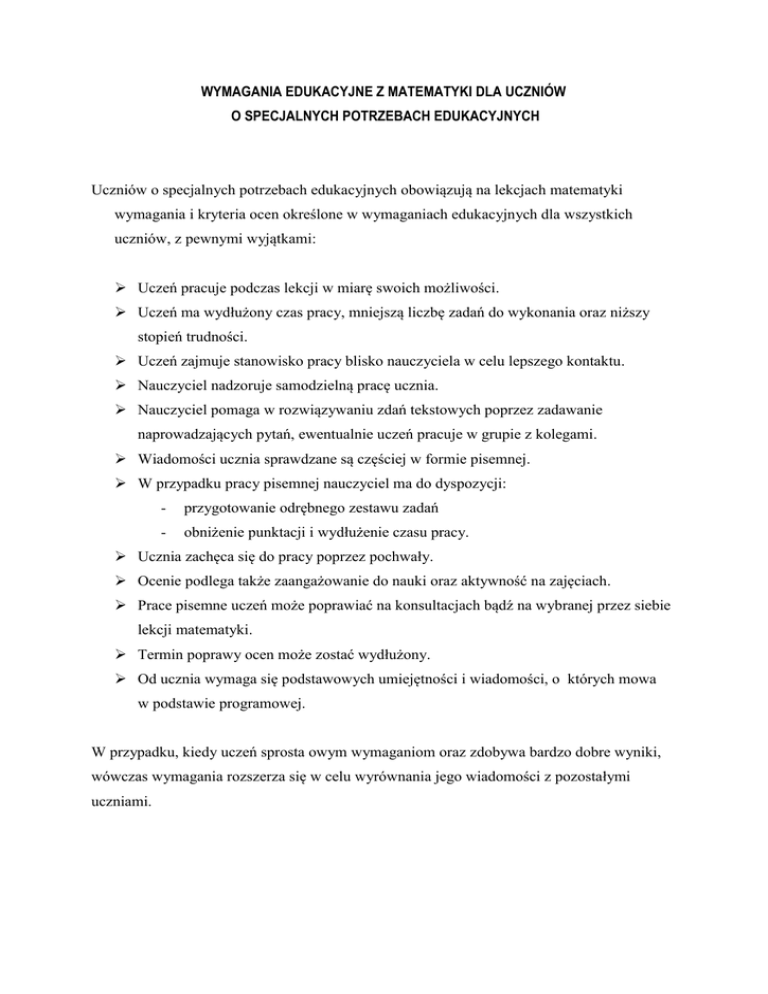WYMAGANIA EDUKACYJNE Z MATEMATYKI DLA UCZNIÓW O SPECJALNYCH POTRZEBACH EDUKACYJNYCH Uczniów o specjalnych potrzebach edukacyjnych obowiązują na lekcjach matematyki wymagania i kryteria ocen określone w wymaganiach edukacyjnych dla wszystkich uczniów, z pewnymi wyjątkami: Uczeń pracuje podczas lekcji w miarę swoich możliwości. Uczeń ma wydłużony czas pracy, mniejszą liczbę zadań do wykonania oraz niższy stopień trudności. Uczeń zajmuje stanowisko pracy blisko nauczyciela w celu lepszego kontaktu. Nauczyciel nadzoruje samodzielną pracę ucznia. Nauczyciel pomaga w rozwiązywaniu zdań tekstowych poprzez zadawanie naprowadzających pytań, ewentualnie uczeń pracuje w grupie z kolegami. Wiadomości ucznia sprawdzane są częściej w formie pisemnej. W przypadku pracy pisemnej nauczyciel ma do dyspozycji: - przygotowanie odrębnego zestawu zadań - obniżenie punktacji i wydłużenie czasu pracy. Ucznia zachęca się do pracy poprzez pochwały. Ocenie podlega także zaangażowanie do nauki oraz aktywność na zajęciach. Prace pisemne uczeń może poprawiać na konsultacjach bądź na wybranej przez siebie lekcji matematyki. Termin poprawy ocen może zostać wydłużony. Od ucznia wymaga się podstawowych umiejętności i wiadomości, o których mowa w podstawie programowej. W przypadku, kiedy uczeń sprosta owym wymaganiom oraz zdobywa bardzo dobre wyniki, wówczas wymagania rozszerza się w celu wyrównania jego wiadomości z pozostałymi uczniami. METODY PRACY Z UCZNIEM O SPECJALNYCH POTRZEBACH EDUKACYJNYCH ( są dostosowane do zaleceń zawartych w opinii i orzeczeniu) 1. Wsparcie dla ucznia z upośledzeniem w stopniu lekkim Pomoc dydaktyczna Dostosowanie metod pracy dydaktycznej do indywidualnych potrzeb dziecka, poprzez : Udzielenie częstych wskazówek, naprowadzanie, udzielanie pomocy w zrozumieniu zagadnienia podczas kształcenia umiejętności; Czuwanie nad ukończeniem zadania przez ucznia; Motywowanie do pracy, dostrzeganie sukcesów ucznia; Dzielenia materiału na mniejsze części; Dodatkowe objaśnianie zadań i poleceń; Dobór zadań na sprawdzianie uwzględniających wymagania koniecznei podstawowe; Wydłużanie czasu pracy na wykonanie zadania w trakcie lekcji i podczas sprawdzianów. Przewidywane osiągnięcia dla ucznia Wzrost uspołecznienia ucznia, poczucia własnej wartości i sprawczości. Poznawanie i stosowanie się do norm społecznych. Umiejętność przewidywania skutków swoich zachowań. Poprawa komunikacji i funkcjonowania ucznia w środowisku szkolnym i lokalnym. Odniesienie sukcesu dydaktycznego, opanowanie podstawy programowej. Ukończenie klasy na danym poziomie edukacyjnym. 2. Wsparcie dla ucznia z autyzmem i Zespołem Aspergera Pomoc dydaktyczna Dostosowanie metod pracy dydaktycznej do indywidualnych potrzeb dziecka , poprzez : Określanie celu, zakresu, kolejności i przewidywalnych skutków działań; Udzielanie krótkich konkretnych komunikatów; Stosowanie podpowiedzi w formie schematów graficznych, rysunków, tabel, diagramów itp. Podział zadań na mniejsze części; Czuwanie nad ukończeniem zadania przez ucznia; Motywowanie do pracy, dostrzeganie sukcesów ucznia; Dobór zadań na sprawdzianie uwzględniających wymagania konieczne i podstawowe; Wydłużanie czasu pracy na wykonanie zadania w trakcie lekcji i podczas sprawdzianów; Uczeń ma prawo oczekiwać pomocy nauczyciela przedmiotowego i nauczyciela wspierającego w prawidłowym odczytywaniu poleceń i pytań do zadań; Nauczyciel udziela uczniowi stosownych wskazówek do zadań zgodnie ze zgłoszonym zapotrzebowaniem ucznia; Uczeń ma prawo do indywidualizacji toku pracy, na co szczególną uwagę zwraca nauczyciel, pozwalając na wykonywanie zadań w czasie zindywidualizowanym, poza klasą, podczas konsultacji z nauczycielem lub uzupełnienie zadań w domu. Przewidywane osiągnięcia dla ucznia Wzrost uspołecznienia ucznia, poczucia własnej wartości i sprawczości. Poznawanie i stosowanie się do norm społecznych. Umiejętność przewidywania skutków swoich zachowań. Poprawa komunikacji i funkcjonowania ucznia w środowisku szkolnym i lokalnym. Odniesienie sukcesu dydaktycznego, opanowanie podstawy programowej. Ukończenie klasy na danym poziomie edukacyjnym. 3. Wsparcie dla ucznia słabosłyszącego Pomoc dydaktyczna Dostosowanie metod pracy dydaktycznej do indywidualnych potrzeb dziecka , poprzez : Uczeń podczas zajęć lekcyjnych zajmuje miejsce w pierwszej ławce, może sam zdecydować, który z rzędów ławek wybiera, pod warunkiem, że zapewni mu to komfort poprawnego słyszenia i rozumienia zadań lekcyjnych, co ocenia nauczyciel. Zapewnienie pracy w dobrych warunkach akustycznych. Utrzymanie uwagi ucznia podczas zajęć lekcyjnych. Uczeń ma prawo zwrócić się do nauczyciela z prośbą o powtórzenie, uściślenie lub pisemną wersję polecenia, treści zadania. Uczeń ma prawo korzystać podczas lekcji z pomocy specjalisty, tj. logopedy lub nauczyciela wspomagającego, pod warunkiem, że taki specjalista obecny jest w klasie. Nauczyciel udziela uczniowi stosownych wskazówek do zadań zgodnie ze zgłoszonym zapotrzebowaniem ucznia. Przeformułowanie zbyt trudnych pytań, poleceń i zadań z treścią. Udzielenie dodatkowych wskazówek, naprowadzanie, udzielanie pomocy w zrozumieniu zagadnienia podczas kształcenia umiejętności. Czuwanie nad ukończeniem zadania przez ucznia. Motywowanie do pracy, dostrzeganie sukcesów ucznia. Dzielenia materiału na mniejsze części. Dodatkowe objaśnianie zadań i poleceń. Dobór zadań na sprawdzianie uwzględniających wymagania konieczne i podstawowe. Wydłużanie czasu pracy na wykonanie zadania w trakcie lekcji i podczas sprawdzianów. Podawanie poleceń i pytań podczas sprawdzianów oraz informacji dotyczących prac domowych w formie pisemnej. Ma prawo do indywidualizacji toku pracy, na co szczególną uwagę zwraca nauczyciel Ocenianie ucznia przebiega w zgodzie z wytycznymi orzeczenia o potrzebie k