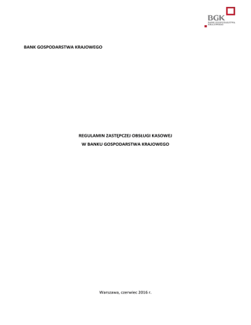 BANK GOSPODARSTWA KRAJOWEGO REGULAMIN ZASTĘPCZEJ OBSŁUGI KASOWEJ W BANKU GOSPODARSTWA KRAJOWEGO Warszawa, czerwiec 2016 r. SPIS TREŚCI Rozdział 1 Zakres obowiązywania Regulaminu .................................................................................... 3 Rozdział 2 Warunki udostępnienia i realizacji Usługi ZOK ................................................................... 5 Rozdział 3 Zmiana Regulaminu ............................................................................................................ 5 Rozdział 4 Dezaktywacja Usługi ZOK .................................................................................................... 5 Rozdział 5 Reklamacje .......................................................................................................................... 6 Rozdział 6 Postanowienia końcowe ..................................................................................................... 6 Wykaz załączników: Załącznik nr 1 - Zasady realizowania operacji gotówkowych w Banku Pekao S.A. Załącznik nr 2 - Zasady realizowania operacji gotówkowych w Banku Pocztowym S.A. Załącznik nr 3 - Zasady realizowania operacji gotówkowych zamkniętych za pośrednictwem Poczty Polskiej S.A. Załącznik nr 4 - Zasady realizowania operacji gotówkowych otwartych w Banku Zachodnim WBK S.A. 2/7 Rozdział 1 Zakres obowiązywania Regulaminu 1. 2. 3. 4. 5. 6. § 1. Regulamin zastępczej obsługi kasowej w Banku Gospodarstwa Krajowego, zwany dalej „Regulaminem” określa zasady udostępnienia i obsługi operacji gotówkowych, tj. wpłat i wypłat realizowanych za pośrednictwem Pośrednika kasowego, na dobro i w ciężar rachunku bankowego prowadzonego w Banku Gospodarstwa Krajowego na rzecz Posiadacza rachunku. Regulamin stanowi integralną część Umowy i jest udostępniany Komunikatem Banku. Warunki, na jakich Bank Gospodarstwa Krajowego świadczy usługi płatnicze Posiadaczom rachunków, określa Regulamin świadczenia usług płatniczych w Banku Gospodarstwa Krajowego, zwany dalej „Regulaminem UP”. W miejsce wyłączonych Regulaminem UP, na podstawie art. 16 i art. 33 ustawy z dnia 19 sierpnia 2011 r. o Usługach płatniczych (Dz. U. z 2014 r. poz. 873, z późn. zm.), zwanej dalej „Ustawą UP”, przepisów tej ustawy, zastosowanie mają postanowienia niniejszego Regulaminu, Regulaminu RB, Regulaminu UP oraz Umowy. Termin określony w art. 44 ust. 2 Ustawy UP zastępuje się terminem określonym w Regulaminie UP. Ilekroć w zawartych z BGK umowach, regulaminach lub stosowanych formularzach bankowych jest mowa o Regulaminie dokonywania operacji gotówkowych za pośrednictwem podmiotów współpracujących z Bankiem Gospodarstwa Krajowego lub Regulaminie realizowania wpłat i wypłat gotówkowych zamkniętych w siedzibie własnej w przypadkach takich stosuje się niniejszy Regulamin. § 2. Przez operacje gotówkowe, o których mowa w § 1 ust. 1 należy rozumieć: 1) wpłaty i wypłaty otwarte, realizowane w placówkach Pośrednika kasowego; 2) wpłaty i wypłaty zamknięte, realizowane w siedzibie własnej Posiadacza rachunku; 3) wpłaty zamknięte, realizowane w placówkach Pośrednika kasowego. § 3. 1. Przez użyte w niniejszym Regulaminie określenia należy rozumieć: 1) BGK – Bank Gospodarstwa Krajowego; 2) Dyspozycja ZOK – pisemną dyspozycję Posiadacza rachunku, dotyczącą aktywacji, modyfikacji lub dezaktywacji Usługi ZOK; 3) Informacja zwrotna BGK – pisemną informację BGK, dotyczącą udostępnienia funkcjonalności wpłat i wypłat realizowanych za pośrednictwem Pośrednika kasowego, przekazywaną Posiadaczowi rachunku w odpowiedzi na złożoną Dyspozycję ZOK. Informacja zwrotna BGK stanowi integralną część Umowy; 4) Posiadacz rachunku – przedsiębiorcę lub innego klienta instytucjonalnego, który zawarł z BGK umowę o prowadzenie rachunku bankowego lub umowę usługi Depozyty@24; 5) Pośrednik kasowy – podmiot, z którym BGK zawarł umowę w sprawie zastępczej obsługi operacji gotówkowych; 3/7 6) Regulamin RB – Regulamin otwierania i prowadzenia rachunków bankowych dla przedsiębiorców i innych klientów instytucjonalnych w Banku Gospodarstwa Krajowego albo Regulamin otwierania i prowadzenia rachunków bankowych w złotych podlegających konsolidacji finansów publicznych w Banku Gospodarstwa Krajowego, właściwy dla Posiadacza rachunku; 7) strona internetowa BGK – stronę internetową BGK, znajdującą się pod adresem www.bgk.pl; 8) Umowa – umowę rachunku bankowego lub umowę usługi Depozyty@24; 9) Usługa ZOK, zastępcza obsługa kasowa – dodatkowa funkcjonalność związana z prowadzeniem przez BGK rachunku bankowego na rzecz Posiadacza rachunku, obejmująca wpłaty i wypłaty otwarte w placówkach Pośrednika kasowego lub wpłaty i wypłaty zamknięte w siedzibie własnej Posiadacza rachunku lub wpłaty zamknięte w placówkach Pośrednika kasowego; 10) wpłata – zlecenie płatnicze dokonania wpłaty gotówki złożone w ramach Usługi ZOK; 11) wypłata – zlecenie płatnicze dokonania wypłaty gotówki złożone w ramach Usługi ZOK. 2. Dla określeń użytych w Regulaminie, nie zdefiniowanych w ust. 1, stosuje się znaczenie przyjęte w Regulaminie RB. § 4. 1. Zastępcza obsługa kasowa stanowi rozszerzenie standardowych usług realizowanych w ramach prowadzenia przez BGK rachunków bankowych na rzecz Posiadacza rachunku. 2. Zasady otwierania i prowadzenia rachunków bankowych w BGK określa Regulamin RB. § 5. 1. Pośrednikami kasowymi są: 1) Bank Polska Kasa Opieki S.A. z siedzibą w Warszawie, ul. Grzybowska 53/57, 00-950 Warszawa (zwany dalej Bankiem Pekao S.A.), który realizuje operacje gotówkowe otwarte na rzecz Posiadaczy rachunków za pośrednictwem własnych placówek bankowych; 2) Bank Pocztowy S.A. z siedzibą w Bydgoszczy, ul. Jagiellońska 17, 85-959 Bydgoszcz, który realizuje operacje gotówkowe otwarte na rzecz Posiadaczy rachunków za pośred