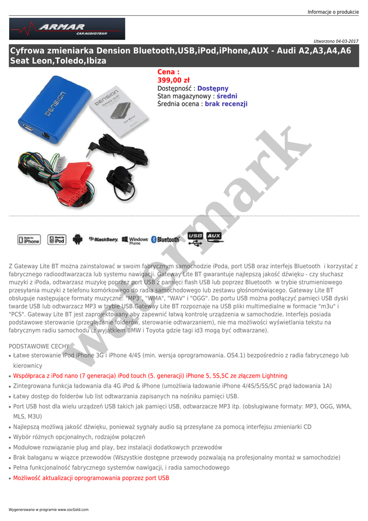 Informacje o produkcie Utworzono 04-03-2017 Cyfrowa zmieniarka Dension Bluetooth,USB,iPod,iPhone,AUX - Audi A2,A3,A4,A6 Seat Leon,Toledo,Ibiza Cena : 399,00 zł er m ar k Dostępność : Dostępny Stan magazynowy : średni Średnia ocena : brak recenzji w at Z Gateway Lite BT można zainstalować w swoim fabrycznym samochodzie iPoda, port USB oraz interfejs Bluetooth i korzystać z fabrycznego radioodtwarzacza lub systemu nawigacji. Gateway Lite BT gwarantuje najlepszą jakość dźwięku - czy słuchasz muzyki z iPoda, odtwarzasz muzykę poprzez port USB z pamięci flash USB lub poprzez Bluetooth w trybie strumieniowego przesyłania muzyki z telefonu komórkowego do radia samochodowego lub zestawu głośnomówiącego. Gateway Lite BT obsługuje następujące formaty muzyczne: "MP3", "WMA", "WAV" i "OGG". Do portu USB można podłączyć pamięci USB dyski twarde USB lub odtwarzacz MP3 w trybie USB.Gateway Lite BT rozpoznaje na USB pliki multimedialne w formacie "m3u" i "PCS". Gateway Lite BT jest zaprojektowany aby zapewnić łatwą kontrolę urządzenia w samochodzie. Interfejs posiada podstawowe sterowanie (przeglądanie folderów, sterowanie odtwarzaniem), nie ma możliwości wyświetlania tekstu na fabrycznym radiu samochodu (z wyjątkiem BMW i Toyota gdzie tagi id3 mogą być odtwarzane). PODSTAWOWE CECHY ● Łatwe sterowanie iPod iPhone 3G i iPhone 4/4S (min. wersja oprogramowania. OS4.1) bezpośrednio z radia fabrycznego lub kierownicy ● Współpraca z iPod nano (7 generacja) iPod touch (5. generacji) iPhone 5, 5S,5C ze złączem Lightning ● Zintegrowana funkcja ładowania dla 4G iPod & iPhone (umożliwia ładowanie iPhone 4/4S/5/5S/5C prąd ładowania 1A) ● Łatwy dostęp do folderów lub list odtwarzania zapisanych na nośniku pamięci USB. ● Port USB host dla wielu urządzeń USB takich jak pamięci USB, odtwarzacze MP3 itp. (obsługiwane formaty: MP3, OGG, WMA, MLS, M3U) ● Najlepszą możliwą jakość dźwięku, ponieważ sygnały audio są przesyłane za pomocą interfejsu zmieniarki CD ● Wybór różnych opcjonalnych, rodzajów połączeń ● Modułowe rozwiązanie plug and play, bez instalacji dodatkowych przewodów ● Brak bałaganu w wiązce przewodów (Wszystkie dostępne przewody pozwalają na profesjonalny montaż w samochodzie) ● Pełna funkcjonalność fabrycznego systemów nawigacji, i radia samochodowego ● Możliwość aktualizacji oprogramowania poprzez port USB Wygenerowano w programie www.oscGold.com Poza podłączeniem iPod oraz portu USB,Gateway Lite BT posiada także moduł Bluetooth , w wyniku czego posiada dodatkowe funkcje: ● Przesyłaj muzykę z telefonu komórkowego do samochodowego radia / fabrycznej nawigacji ● Strumień audio z telefonu poprzez Bluetooth odtwarzaj w systemie głośnikowym samochodu ● Odbieraj połączenia telefoniczne ● Automatyczne wyciszenie dźwięku podczas połączenia ● Wyjście audio przez głośniki samochodowe ● Zestaw głośnomówiący za pośrednictwem telefonu komórkowego w samochodowym radiu / fabrycznej nawigacji ● AVRCP kontrola strumienia audio za pomocą przycisków na radiu / fabrycznej nawigacji lub przyciskami sterowania z kierownicy ● Sterowanie utworami w telefonie FUNKCJE Wbudowany moduł Bluetooth ● Bluetooth audio streaming do radia samochodowego lub systemu nawigacji A2DP/AVRCP) ● Łatwe sterowanie iPod iPhone 3G i iPhone 4G (min. wersja oprogramowania. OS4.1) bezpośrednio z radia fabrycznego ● Współpraca z iPod nano (7 generacja) iPod touch (5. generacji) iPhone 5, 5S,5C ze złączem Lightning ● Zintegrowana funkcja ładowania dla 4G iPod & iPhone (umożliwia ładowanie iPhone 4/4S prąd ładowania 1A) ● Łatwy dostęp do folderów lub list odtwarzania zapisanych na nośniku pamięci USB. ● Port USB host do wielu urządzeń USB takich jak pamięci USB, odtwarzacze MP3 itp. (obsługiwane formaty: MP3, OGG, WMA, MLS, M3U) ● Najlepszą możliwą jakość dźwięku, ponieważ sygnały audio są przesyłane za pomocą interfejsu zmieniarki CD ● Wybór różnych opcjonalnych, rodzajów połączeń ● Modułowe rozwiązanie plug and play, bez instalacji dodatkowych przewodów ● Brak bałaganu w wiązce przewodów (Wszystkie dostępne przewody pozwalają profesjonalny montaż pojazdu) ● Pełna funkcjonalność fabrycznego systemów nawigacji, ruchu i zestawu głośnomówiącego ● Możliwość aktualizacji oprogramowania poprzez port USB DANE TECHNICZNE er m ar k ● ● ● ● ● ● ● ● ● ● ● iPhone, iPhone 4S, 4, 3GS and 3G (1A ładowanie) iPod (4thgeneration) iPod nano (1st, 2nd, 3rd, 4th, 5thand 6th generation) iPod mini iPod Photo 4G iPod Video 5G iPod Classic iPod Touch (1st, 2nd, 3rd and 4th generation) iPod nano (7 generacja) iPod touch (5. generacji) iPhone 5, 5S,5C w ● at USB: Flash Memory i twarde dyski (UBS1.1 i wyższe) System plików: FAT16 lub FAT32 Pojemność nośników: do 250GB Obsługiwane formaty muzyczne: MP3, WMA i WAV, OGG Kompatybilność: DANE Obsługiwane Bluetooth profile: A2DP (Advanced Audio Distribution Profile): Tak (pilot zdalnego sterowania audio / wideo) A2DP (Audio Video profil zdalnego sterowania): Tak (transmisja danych audio) HSP (Headset Profile): Tak (głos przez słuchawki) Interfejs: Wymiary (dł. x szer.): 100 x 75 mm Waga: 85g Właściwości USB: Typ połączenia: USB 1.1 i wyższe System plików: FAT16 lub FAT32 Informacje o produkcie Pojemność: Do 250 GB Odtwarzane formaty muzyczne: MP3, WMA, WAV i OGG Zestaw: er m ar k Cyfrowa zmieniarka Dension Przewody Plug & Play Mikrofon Instrukcja montażu i obsługi Gwarancja: 24 m-ce polskiego dystrybutora AKCERSORIA DODATKOWE DO MONTAŻU Stacja dokująca IP44CR9 iPhone, iPhone 4S, 4, 3GS and 3G (1A ładowanie) ● iPod (4thgeneration) ● iPod nano (1st, 2nd, 3rd, 4th, 5thand 6th generation) ● iPod mini ● iPod Photo 4G ● iPod Video 5G ● iPod Classic ● iPod Touch (1st, 2nd, 3rd and 4th generation) w at ● Przewód połączeniowy IPO5DC9 wr