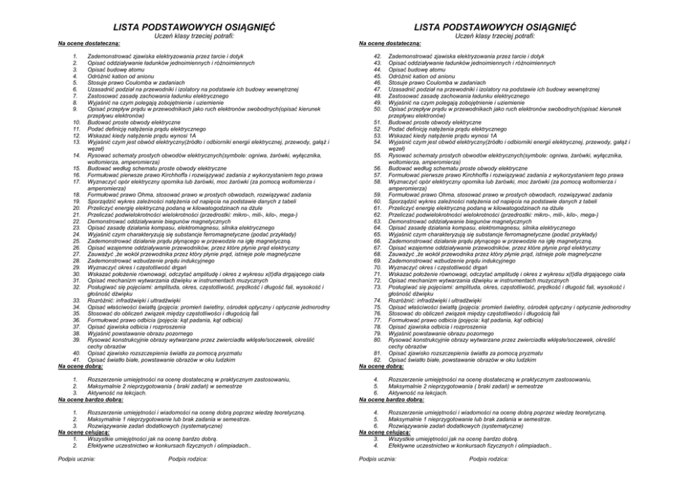 LISTA PODSTAWOWYCH OSIĄGNIĘĆ LISTA PODSTAWOWYCH OSIĄGNIĘĆ Uczeń klasy trzeciej potrafi: Uczeń klasy trzeciej potrafi: Na ocenę dostateczną: Na ocenę dostateczną: Zademonstrować zjawiska elektryzowania przez tarcie i dotyk Opisać oddziaływanie ładunków jednoimiennych i różnoimiennych Opisać budowę atomu Odróżnić kation od anionu Stosuje prawo Coulomba w zadaniach Uzasadnić podział na przewodniki i izolatory na podstawie ich budowy wewnętrznej Zastosować zasadę zachowania ładunku elektrycznego Wyjaśnić na czym polegają zobojętnienie i uziemienie Opisać przepływ prądu w przewodnikach jako ruch elektronów swobodnych(opisać kierunek przepływu elektronów) 10. Budować proste obwody elektryczne 11. Podać definicję natężenia prądu elektrycznego 12. Wskazać kiedy natężenie prądu wynosi 1A 13. Wyjaśnić czym jest obwód elektryczny(źródło i odbiorniki energii elektrycznej, przewody, gałąź i węzeł) 14. Rysować schematy prostych obwodów elektrycznych(symbole: ogniwa, żarówki, wyłącznika, woltomierza, amperomierza) 15. Budować według schematu proste obwody elektryczne 16. Formułować pierwsze prawo Kirchhoffa i rozwiązywać zadania z wykorzystaniem tego prawa 17. Wyznaczyć opór elektryczny opornika lub żarówki, moc żarówki (za pomocą woltomierza i amperomierza) 18. Formułować prawo Ohma, stosować prawo w prostych obwodach, rozwiązywać zadania 19. Sporządzić wykres zależności natężenia od napięcia na podstawie danych z tabeli 20. Przeliczyć energię elektryczną podaną w kilowatogodzinach na dżule 21. Przeliczać podwielokrotności wielokrotności (przedrostki: mikro-, mili-, kilo-, mega-) 22. Demonstrować oddziaływanie biegunów magnetycznych 23. Opisać zasadę działania kompasu, elektromagnesu, silnika elektrycznego 24. Wyjaśnić czym charakteryzują się substancje ferromagnetyczne (podać przykłady) 25. Zademonstrować działanie prądu płynącego w przewodzie na igłę magnetyczną. 26. Opisać wzajemne oddziaływanie przewodników, przez które płynie prąd elektryczny 27. Zauważyć ,że wokół przewodnika przez który płynie prąd, istnieje pole magnetyczne 28. Zademonstrować wzbudzenie prądu indukcyjnego 29. Wyznaczyć okres i częstotliwość drgań 30. Wskazać położenie równowagi, odczytać amplitudę i okres z wykresu x(t)dla drgającego ciała 31. Opisać mechanizm wytwarzania dźwięku w instrumentach muzycznych 32. Posługiwać się pojęciami: amplituda, okres, częstotliwość, prędkość i długość fali, wysokość i głośność dźwięku 33. Rozróżnić: infradźwięki i ultradźwięki 34. Opisać właściwości światłą (pojęcia: promień świetlny, ośrodek optyczny i optycznie jednorodny 35. Stosować do obliczeń związek między częstotliwości i długością fali 36. Formułować prawo odbicia (pojęcia: kąt padania, kąt odbicia) 37. Opisać zjawiska odbicia i rozproszenia 38. Wyjaśnić powstawanie obrazu pozornego 39. Rysować konstrukcyjnie obrazy wytwarzane przez zwierciadła wklęsłe/soczewek, określić cechy obrazów 40. Opisać zjawisko rozszczepienia światła za pomocą pryzmatu 41. Opisać światło białe, powstawanie obrazów w oku ludzkim Na ocenę dobrą: Zademonstrować zjawiska elektryzowania przez tarcie i dotyk Opisać oddziaływanie ładunków jednoimiennych i różnoimiennych Opisać budowę atomu Odróżnić kation od anionu Stosuje prawo Coulomba w zadaniach Uzasadnić podział na przewodniki i izolatory na podstawie ich budowy wewnętrznej Zastosować zasadę zachowania ładunku elektrycznego Wyjaśnić na czym polegają zobojętnienie i uziemienie Opisać przepływ prądu w przewodnikach jako ruch elektronów swobodnych(opisać kierunek przepływu elektronów) 51. Budować proste obwody elektryczne 52. Podać definicję natężenia prądu elektrycznego 53. Wskazać kiedy natężenie prądu wynosi 1A 54. Wyjaśnić czym jest obwód elektryczny(źródło i odbiorniki energii elektrycznej, przewody, gałąź i węzeł) 55. Rysować schematy prostych obwodów elektrycznych(symbole: ogniwa, żarówki, wyłącznika, woltomierza, amperomierza) 56. Budować według schematu proste obwody elektryczne 57. Formułować pierwsze prawo Kirchhoffa i rozwiązywać zadania z wykorzystaniem tego prawa 58. Wyznaczyć opór elektryczny opornika lub żarówki, moc żarówki (za pomocą woltomierza i amperomierza) 59. Formułować prawo Ohma, stosować prawo w prostych obwodach, rozwiązywać zadania 60. Sporządzić wykres zależności natężenia od napięcia na podstawie danych z tabeli 61. Przeliczyć energię elektryczną podaną w kilowatogodzinach na dżule 62. Przeliczać podwielokrotności wielokrotności (przedrostki: mikro-, mili-, kilo-, mega-) 63. Demonstrować oddziaływanie biegunów magnetycznych 64. Opisać zasadę działania kompasu, elektromagnesu, silnika elektrycznego 65. Wyjaśnić czym charakteryzują się substancje ferromagnetyczne (podać przykłady) 66. Zademonstrować działanie prądu płynącego w przewodzie na igłę magnetyczną. 67. Opisać wzajemne oddziaływanie przewodników, przez które płynie prąd elektryczny 68. Zauważyć ,że wokół przewodnika przez który płynie prąd, istnieje pole magnetyczne 69. Zademonstrować wzbudzenie prądu indukcyjnego 70. Wyznaczyć okres i częstotliwość drgań 71. Wskazać położenie równowagi, odczytać amplitudę i okres z wykresu x(t)dla drgającego ciała 72. Opisać mechanizm wytwarzania dźwięku w instrumentach muzycznych 73. Posługiwać się pojęciami: amplituda, okres, częstotliwość, prędkość i długość fali, wysokość i głośność dźwięku 74. Rozróżnić: infradźwięki i ultradźwięki 75. Opisać właściwości światłą (pojęcia: promień świetlny, ośrodek optyczny i optycznie jednorodny 76. Stosować do obliczeń związek między częstotliwości i długością fali 77. Formułować prawo odbicia (pojęcia: kąt padania, kąt odbicia) 78. Opis