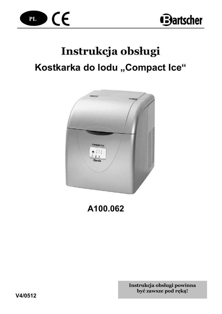 PL Instrukcja obsługi Kostkarka do lodu „Compact Ice“ A100.062 Instrukcja obsługi powinna być zawsze pod ręką! V4/0512 -1- 1. Informacje ogólne 1.1 Informacje dotyczące instrukcji obsługi 1.2 Wyjaśnienie symboli 1.3 Odpowiedzialność producenta i gwarancja 1.4 Ochrona praw autorskich 1.5 Deklaracja Zgodności 3 3 3 4 4 4 2. Bezpieczeństwo 2.1 Informacje ogólne 2.2 Wskazówki dotyczące bezpieczeństwa przy zastosowaniach urządzenia 2.3 Użytkowanie zgodnie z przeznaczeniem 5 5 5-6 6 3. Transport, opakowanie i magazynowanie 3.1 Kontrola dostawy 3.2 Opakowanie 3.3 Magazynowanie 7 7 7 7 4. Parametry techniczne 4.1 Dane techniczne 4.2 Zestawienie podzespołów urządzenia 8 8 8 5. Instalacja i obsługa urządzenia 5.1 Wskazówki dotyczące bezpieczeństwa 5.2 Ustawienie i podłączenie urządzenia 5.3 Obsługa 9 9 10 10-11 6. Czyszczenie i konserwacja 6.1 Wskazówki dotyczące bezpieczeństwa 6.2 Czyszczenie 6.3 Wskazówki dotyczące bezpieczeństwa podczas konserwacji 11 11 12 12 7. Możliwe usterki 13 8. Utylizacja 14 Bartscher GmbH Franz-Kleine-Straße 28 D-33154 Salzkotten Niemcy -2- Tel.: +49 (0) 5258 971-0 Faks: +49 (0) 5258 971-120 1. Informacje ogólne 1.1 Informacje dotyczące instrukcji obsługi Niniejsza instrukcja obsługi zawiera opis instalacji urządzenia, jego obsługi oraz konserwacji i służy jako ważne źródło informacji oraz poradnik. Znajomość i przestrzeganie wszystkich zawartych w niej wskazówek dotyczących bezpieczeństwa i obsługi stanowi warunek bezpiecznej i prawidłowej pracy z urządzeniem. Ponadto należy przestrzegać lokalnych przepisów dotyczących zapobiegania wypadkom oraz zasad BHP. Instrukcja obsługi stanowi integralny element urządzenia i należy ją przechowywać w pobliżu urządzenia, aby osoby instalujące urządzenie, prowadzące prace konserwacyjne i obsługujące lub czyszczące urządzenie miały do niej stały dostęp. 1.2 Wyjaśnienie symboli Ważne wskazówki dotyczące bezpieczeństwa oraz kwestii technicznych oznaczono w niniejszej instrukcji obsługi odpowiednimi symbolami. Wskazówek tych należy bezwzględnie przestrzegać, aby uniknąć ewentualnych wypadków, uszczerbku na życiu i zdrowiu osób oraz szkód rzeczowych. UWAGA! Symbol ten oznacza zagrożenia mogące prowadzić do powstania obrażeń ciała. Należy bezwzględnie i skrupulatnie przestrzegać niniejszych wskazówek BHP, a w odpowiednich sytuacjach zachować szczególną ostrożność. NIEBEZPIECZEŃSTWO! Zagrożenie prądem elektrycznym! Symbol ten zwraca uwagę na zagrożenia prądem elektrycznym. Ignorowanie wskazówek dotyczących bezpieczeństwa stwarza niebezpieczeństwo odniesienia obrażeń ciała lub utraty życia. OSTRZEŻENIE! Tym symbolem oznaczono wskazówki, których ignorowanie może, w konsekwencji, doprowadzić do uszkodzenia urządzenia, jego nieprawidłowego działania lub / i awarii. WSKAZÓWKA! Ten symbol wskazuje na porady oraz informacje istotne dla efektywnej i bezawaryjnej pracy urządzenia. -3- 1.3 Odpowiedzialność producenta i gwarancja Wszystkie informacje zawarte w niniejszej instrukcji obsługi zostały zestawione przy uwzględnieniu obowiązujących przepisów, aktualnej wiedzy konstruktorskiej i inżynierskiej oraz naszej wiedzy, a także naszych wieloletnich doświadczeń. Również tłumaczenia instrukcji obsługi zostały wykonane jak najbardziej rzetelnie. Nie możemy jednak przejąć odpowiedzialności za ewentualne błędy w tłumaczeniu. Wersją rozstrzygającą jest załączona instrukcja obsługi w języku niemieckim. W przypadku zamówienia modeli specjalnych lub opcji dodatkowych, oraz w sytuacji zastosowania najnowszych zdobyczy wiedzy technicznej, dostarczone urządzenie może różnić się od objaśnień oraz rysunków zawartych w niniejszej instrukcji obsługi. W razie wątpliwości prosimy o kontakt z producentem. WSKAZÓWKA! Przed rozpoczęciem jakichkolwiek prac, a w szczególności przed uruchomieniem urządzenia, należy dokładnie zapoznać się z treścią niniejszej instrukcji obsługi. Producent nie odpowiada za szkody i uszkodzenia powstałe wskutek nieprzestrzegania informacji zawartych w instrukcji obsługi. Instrukcję obsługi należy przechowywać bezpośrednio przy urządzeniu; ponadto musi być ona dostępna dla wszystkich osób pracujących z urządzeniem. Zastrzegamy sobie prawo do wprowadzania zmian technicznych w produkcie, służących poprawie właściwości użytkowych urządzenia oraz jego ulepszaniu. 1.4 Ochrona praw autorskich Niniejsza instrukcja obsługi oraz zawarte w niej teksty, rysunki, zdjęcia i inne elementy podlegają ochronie prawem autorskim. Bez uzyskania pisemnej zgody producenta, zabrania się powielania treści instrukcji obsługi w jakiejkolwiek formie i w jakikolwiek sposób (także fragmentów), oraz wykorzystywania lub / i przekazywania jej zawartości osobom trzecim. Naruszenia powyższego skutkują obowiązkiem wypłaty odszkodowania. Zastrzegamy sobie prawo do dochodzenia dalszych roszczeń. WSKAZÓWKA! Dane, teksty, rysunki, zdjęcia i inne opisy zawarte w niniejszej instrukcji, podlegają ochronie prawem autorskim oraz prawem ochrony własności przemysłowej. Każde nadużycie w jej wykorzystaniu jest karalne. 1.5 Deklaracja Zgodności Urządzenie spełnia aktualnie obowiązujące normy oraz wytyczne Unii Europejskiej. Powyższe potwierdzamy w Deklaracji Zgodności WE. W razie potrzeby chętnie prześlemy Państwu odpowiednią Deklarację Zgodności. -4- 2. Bezpieczeństwo Niniejszy rozdział zawiera zarys informacji, dotyczących wszystkich istotnych aspektów związanych z bezpieczeństwem. Ponadto poszczególne rozdziały zawierają konkretne wskazówki (oznaczone symbolami), dotyczące bezpieczeństwa i mające zapobiegać powstawaniu zagrożeń. Należy także przestrzegać informacji z piktogramów, tabliczek oraz napisów umieszczonych na urządzeniu i zadbać o to, aby były one czytelne. Przestrzeganie wszystkich wskazówek dotyczących