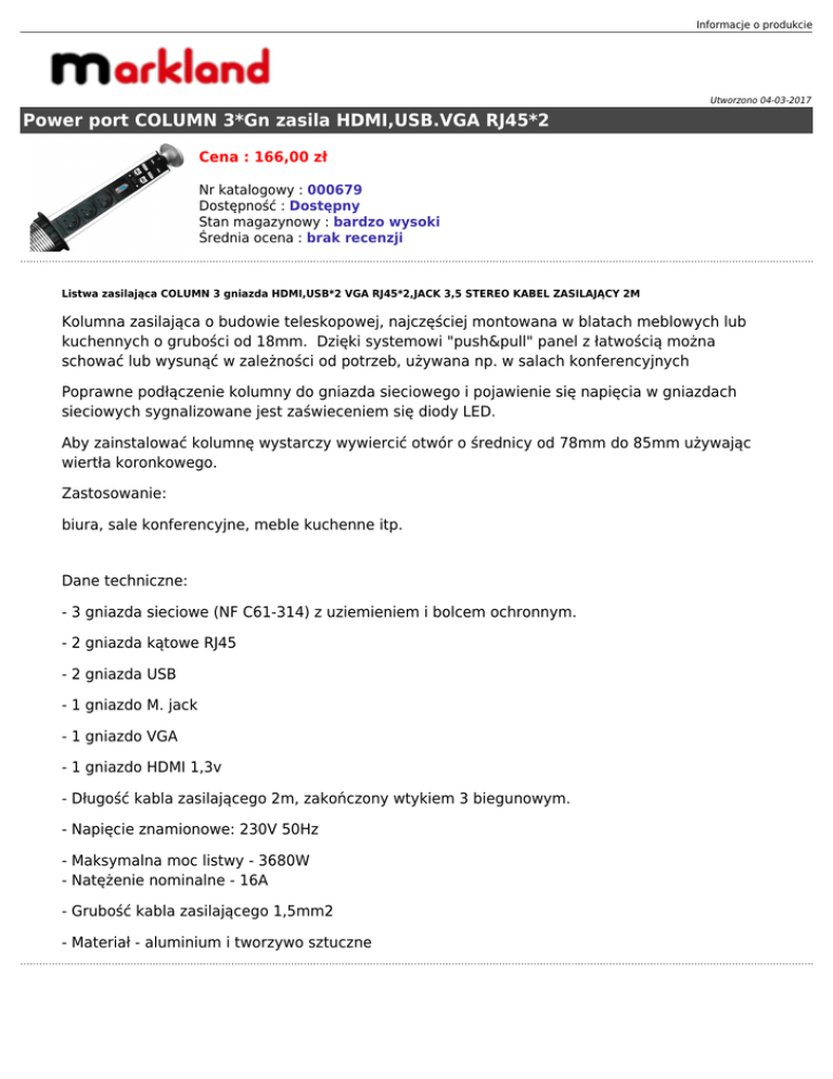 Informacje o produkcie Utworzono 04-03-2017 Power port COLUMN 3*Gn zasila HDMI,USB.VGA RJ45*2 Cena : 166,00 zł Nr katalogowy : 000679 Dostępność : Dostępny Stan magazynowy : bardzo wysoki Średnia ocena : brak recenzji Listwa zasilająca COLUMN 3 gniazda HDMI,USB*2 VGA RJ45*2,JACK 3,5 STEREO KABEL ZASILAJĄCY 2M Kolumna zasilająca o budowie teleskopowej, najczęściej montowana w blatach meblowych lub kuchennych o grubości od 18mm. Dzięki systemowi "push&pull" panel z łatwością można schować lub wysunąć w zależności od potrzeb, używana np. w salach konferencyjnych Poprawne podłączenie kolumny do gniazda sieciowego i pojawienie się napięcia w gniazdach sieciowych sygnalizowane jest zaświeceniem się diody LED. Aby zainstalować kolumnę wystarczy wywiercić otwór o średnicy od 78mm do 85mm używając wiertła koronkowego. Zastosowanie: biura, sale konferencyjne, meble kuchenne itp. Dane techniczne: - 3 gniazda sieciowe (NF C61-314) z uziemieniem i bolcem ochronnym. - 2 gniazda kątowe RJ45 - 2 gniazda USB - 1 gniazdo M. jack - 1 gniazdo VGA - 1 gniazdo HDMI 1,3v - Długość kabla zasilającego 2m, zakończony wtykiem 3 biegunowym. - Napięcie znamionowe: 230V 50Hz - Maksymalna moc listwy - 3680W - Natężenie nominalne - 16A - Grubość kabla zasilającego 1,5mm2 - Materiał - aluminium i tworzywo sztuczne