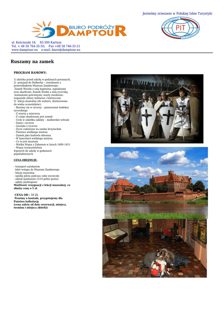 Jesteśmy zrzeszeni w Polskiej Izbie Turystyki ul. Kościuszki 18, 83-300 Kartuzy Tel. + 48 58 764-35-50; Fax +48 58 746-35-51 www.damptour.eu e-mail: [email protected] Ruszamy na zamek PROGRAM RAMOWY: 1) zbiórka przed szkołą w godzinach porannych, 2) przyjazd do Malborka – zwiedzanie z przewodnikiem Muzeum Zamkowego: Zamek Wysoki z salą kapitulna, sypialniami oraz skarbcem; Zamek Średni z salą rycerską, komnatami gościnnymi; mosty zwodzone; wspaniałe zbiory militarne i historyczne 3) lekcja muzealna (do wyboru, dostosowana do wieku uczestników): - Bawimy się w rycerzy – poznawanie kodeksu rycerskiego - Z wizytą u mincerza - Z czego zbudowany jest zamek - Urok w szkiełku zaklęty – malborskie witraże - Damy i rycerze - Gawęda o rycerzu - Życie codzienne na zamku krzyżackim - Państwo wielkiego mistrza - Zamek jako budowla obronna - W kancelarii wielkiego mistrza - Co to jest muzeum - Wielka Wojna z Zakonem w latach 1409–1411 - Wojna trzynastoletnia 4)powrót do szkoły w godzinach popołudniowych CENA OBEJMUJE: - transport autokarem - bilet wstępu do Muzeum Zamkowego - lekcję muzealną - opiekę pilota podczas całej wycieczki - udział opiekunów (1/10 pełne gratis) - opłaty parkingowe Możliwość rezygnacji z lekcji muzealnej, co obniży cenę o 5 zł. CENA OD : 59 ZŁ Prosimy o kontakt, przygotujemy dla Państwa kalkulację (cena zależy od daty rezerwacji, miejsca, terminu i miejsca zbiórki)