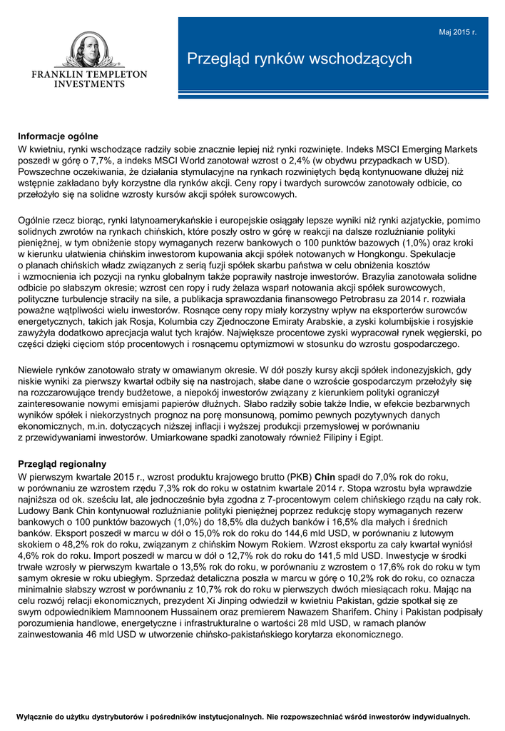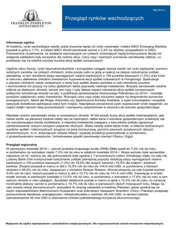 Maj 2015 r. Przegląd rynków wschodzących Informacje ogólne W kwietniu, rynki wschodzące radziły sobie znacznie lepiej niż rynki rozwinięte. Indeks MSCI Emerging Markets poszedł w górę o 7,7%, a indeks MSCI World zanotował wzrost o 2,4% (w obydwu przypadkach w USD). Powszechne oczekiwania, że działania stymulacyjne na rynkach rozwiniętych będą kontynuowane dłużej niż wstępnie zakładano były korzystne dla rynków akcji. Ceny ropy i twardych surowców zanotowały odbicie, co przełożyło się na solidne wzrosty kursów akcji spółek surowcowych. Ogólnie rzecz biorąc, rynki latynoamerykańskie i europejskie osiągały lepsze wyniki niż rynki azjatyckie, pomimo solidnych zwrotów na rynkach chińskich, które poszły ostro w górę w reakcji na dalsze rozluźnianie polityki pieniężnej, w tym obniżenie stopy wymaganych rezerw bankowych o 100 punktów bazowych (1,0%) oraz kroki w kierunku ułatwienia chińskim inwestorom kupowania akcji spółek notowanych w Hongkongu. Spekulacje o planach chińskich władz związanych z serią fuzji spółek skarbu państwa w celu obniżenia kosztów i wzmocnienia ich pozycji na rynku globalnym także poprawiły nastroje inwestorów. Brazylia zanotowała solidne odbicie po słabszym okresie; wzrost cen ropy i rudy żelaza wsparł notowania akcji spółek surowcowych, polityczne turbulencje straciły na sile, a publikacja sprawozdania finansowego Petrobrasu za 2014 r. rozwiała poważne wątpliwości wielu inwestorów. Rosnące ceny ropy miały korzystny wpływ na eksporterów surowców energetycznych, takich jak Rosja, Kolumbia czy Zjednoczone Emiraty Arabskie, a zyski kolumbijskie i rosyjskie zawyżyła dodatkowo aprecjacja walut tych krajów. Największe procentowe zyski wypracował rynek węgierski, po części dzięki cięciom stóp procentowych i rosnącemu optymizmowi w stosunku do wzrostu gospodarczego. Niewiele rynków zanotowało straty w omawianym okresie. W dół poszły kursy akcji spółek indonezyjskich, gdy niskie wyniki za pierwszy kwartał odbiły się na nastrojach, słabe dane o wzroście gospodarczym przełożyły się na rozczarowujące trendy budżetowe, a niepokój inwestorów związany z kierunkiem polityki ograniczył zainteresowanie nowymi emisjami papierów dłużnych. Słabo radziły sobie także Indie, w efekcie bezbarwnych wyników spółek i niekorzystnych prognoz na porę monsunową, pomimo pewnych pozytywnych danych ekonomicznych, m.in. dotyczących niższej inflacji i wyższej produkcji przemysłowej w porównaniu z przewidywaniami inwestorów. Umiarkowane spadki zanotowały również Filipiny i Egipt. Przegląd regionalny W pierwszym kwartale 2015 r., wzrost produktu krajowego brutto (PKB) Chin spadł do 7,0% rok do roku, w porównaniu ze wzrostem rzędu 7,3% rok do roku w ostatnim kwartale 2014 r. Stopa wzrostu była wprawdzie najniższa od ok. sześciu lat, ale jednocześnie była zgodna z 7-procentowym celem chińskiego rządu na cały rok. Ludowy Bank Chin kontynuował rozluźnianie polityki pieniężnej poprzez redukcję stopy wymaganych rezerw bankowych o 100 punktów bazowych (1,0%) do 18,5% dla dużych banków i 16,5% dla małych i średnich banków. Eksport poszedł w marcu w dół o 15,0% rok do roku do 144,6 mld USD, w porównaniu z lutowym skokiem o 48,2% rok do roku, związanym z chińskim Nowym Rokiem. Wzrost eksportu za cały kwartał wyniósł 4,6% rok do roku. Import poszedł w marcu w dół o 12,7% rok do roku do 141,5 mld USD. Inwestycje w środki trwałe wzrosły w pierwszym kwartale o 13,5% rok do roku, w porównaniu z wzrostem o 17,6% rok do roku w tym samym okresie w roku ubiegłym. Sprzedaż detaliczna poszła w marcu w górę o 10,2% rok do roku, co oznacza minimalnie słabszy wzrost w porównaniu z 10,7% rok do roku w pierwszych dwóch miesiącach roku. Mając na celu rozwój relacji ekonomicznych, prezydent Xi Jinping odwiedził w kwietniu Pakistan, gdzie spotkał się ze swym odpowiednikiem Mamnoonem Hussainem oraz premierem Nawazem Sharifem. Chiny i Pakistan podpisały porozumienia handlowe, energetyczne i infrastrukturalne o wartości 28 mld USD, w ramach planów zainwestowania 46 mld USD w utworzenie chińsko-pakistańskiego korytarza ekonomicznego. Wyłącznie do użytku dystrybutorów i pośredników instytucjonalnych. Nie rozpowszechniać wśród inwestorów indywidualnych. Przegląd rynków wschodzących Bank centralny Korei utrzymał w kwietniu referencyjną stopę procentową na rekordowo niskim poziomie 1,75%, po nieoczekiwanej marcowej redukcji o 25 punktów bazowych (0,25%). Jednymi z najważniejszych powodów tej decyzji były oznaki poprawy kondycji krajowej gospodarki oraz względnie niski poziom inflacji. Indeks wzrostu cen towarów i usług konsumenckich wyniósł w marcu 0,4% rok do roku, w porównaniu z 0,5% rok do roku w lutym; główną przyczyną minimalnego spadku były niskie ceny ropy. Bank Korei obniżył swe prognozy wzrostu PKB i inflacji na 2015 r. odpowiednio z 3,4% do 3,1% i z 1,9% do 0,9%. Eksport spadł w marcu o 4,2% rok do roku do 47,0 mld USD, ale i tak był wyższy w porównaniu z 41,5 mld USD w lutym. Import spadł w marcu o 15,3% rok do roku do 38,6 mld USD, przede wszystkim wskutek niskich cen ropy. W rezultacie, nadwyżka handlowa sięgnęła w marcu rekordowo wysokiego poziomu 8,4 mld USD, ponad dwukrotnie przewyższając nadwyżkę rzędu 3,6 mld USD z roku ubiegłego. Podczas swej kwietniowej wizyty w Kolumbii, prezydent Park Geun-hye ponagliła Trybunał Konstytucyjny w sprawie ratyfikowania porozumienia o wolnym handlu podpisanego przez przedstawicieli obydwu krajów w lutym 2013 r. w celu zwiększenia wzajemnej wymiany handlowej. Podpisano szereg dodatkowych porozumień o współpracy w takich obszarach, jak handel elektroniczny czy branża pojazdów elektrycznych. W kwietniu, Bank Rezerw Indii utrzymał swoją kluczową stopę procentową na dotychczasowym poziomie 7,5%. Wartość indeksu wzrostu cen towarów i usług ko