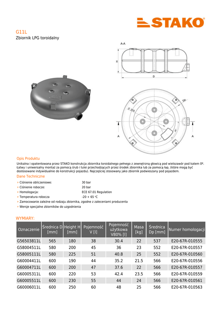 G11L Zbiornik LPG toroidalny Opis Produktu Unikalna i opatentowana przez STAKO konstrukcja zbiornika toroidalnego pełnego z zewnętrzną głowicą pod wielozawór pod katem 0º. Łatwy i uniwersalny montaż za pomocą śrub i tulei przechodzących przez środek zbiornika lub za pomocą łap, (które mogą być dostosowane indywidualnie do konstrukcji pojazdu). Najczęściej stosowany jako zbiornik podwieszany pod pojazdem. Dane Techniczne Ciśnienie obliczeniowe: 30 bar Ciśnienie robocze: 20 bar Homologacja: ECE 67.01 Regulation Temperatura robocza -20 + 65 oC Zamocowanie zależne od rodzaju zbiornika, zgodne z zaleceniami producenta Wersje specjalne zbiorników do uzgodnienia WYMIARY: Oznaczenie Średnica D Height H Pojemność [mm] [mm] V [l] Pojemność użytkowa V80% [l] Masa [kg] Średnica Numer homologacji Dp [mm] G56503811L 565 180 38 30.4 22 537 E20-67R-010555 G58004511L 580 200 45 36 23 552 E20-67R-010557 G58005111L 580 225 51 40.8 25 552 E20-67R-010560 G60004411L 600 190 44 35.2 21.5 566 E20-67R-010556 G60004711L 600 200 47 37.6 22 566 E20-67R-010557 G60005311L 600 220 53 42.4 23.5 566 E20-67R-010559 G60005511L 600 230 55 44 24 566 E20-67R-010561 G60006011L 600 250 60 48 25 566 E20-67R-010563 G60006611L 600 270 66 52.8 26 566 E20-67R-010564 G63004711L 630 190 47 37.6 24 586 E20-67R-010556 G63005111L 630 204 51 40.8 25 586 E20-67R-010558 G63005811L 630 225 58 46.4 26 586 E20-67R-010560 G63006611L 630 250 66 52.8 27 586 E20-67R-010563 G63007211L 630 270 72 57.6 30 586 E20-67R-010564 G65005411L 650 200 54 43.2 28 606 E20-67R-010557 G65006111L 650 220 61 48.8 30 606 E20-67R-010559 G65006711L 650 240 67 53.6 32 606 E20-67R-010562 G65007711L 650 270 77 61.6 34 606 E20-67R-010564 G68006611L 680 230 66 52.8 34 636 E20-67R-010714 G68006911L 680 240 69 55.2 35 636 E20-67R-010715 G68007211L 680 250 72 57.6 36 636 E20-67R-010716 G68008011L 680 270 80 64 37.5 636 E20-67R-010717 G72007911L 720 230 79 63.2 39 676 E20-67R-010714 G72008311L 720 240 83 66.4 40 676 E20-67R-010715 G72008611L 720 250 86 68.8 41 676 E20-67R-010716 G72009511L 720 270 95 76 42.5 676 E20-67R-010717 G72010211L 720 300 102 81.6 45 676 E20-67R-010900 STAKO Sp. z o.o. Poznańska 54 76-200 Słupsk Poland T: F E: I: +48 59 8424895 +48 59 8481999 [email protected] www.stako.pl VAT No.: KRS: PL8392766131 0000078261 Sąd Rejonowy Gdańsk-Północ w Gdańsku VIII wydz. gospodarczy KRS Kapitał zakładowy: 59.020.000,00 PLN