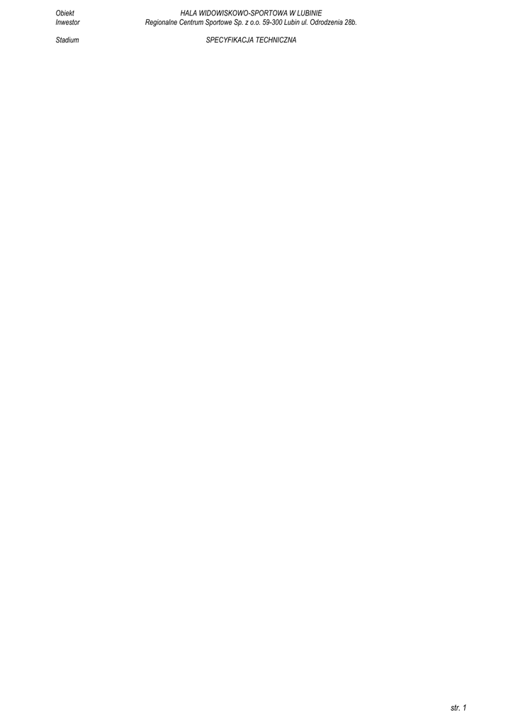 Obiekt Inwestor HALA WIDOWISKOWO-SPORTOWA W LUBINIE Regionalne Centrum Sportowe Sp. z o.o. 59-300 Lubin ul. Odrodzenia 28b. Stadium SPECYFIKACJA TECHNICZNA str. 1 Obiekt Inwestor HALA WIDOWISKOWO-SPORTOWA W LUBINIE Regionalne Centrum Sportowe Sp. z o.o. 59-300 Lubin ul. Odrodzenia 28b. Stadium SPECYFIKACJA TECHNICZNA I Przedmiot i zakres zadania .......................................................................................................................................... 3 1 Cel zadania ................................................................................................................................................................... 3 2 Warunki wynikające ze stanu istniejącego ................................................................................................................ 3 3 Ogólny zakres przedmiotu zamówienia ..................................................................................................................... 3 4 Lokalizacja przedmiotu zamówienia .......................................................................................................................... 4 II Wymagania szczegółowe realizacji robót .................................................................................................................. 4 1. Wymagania szczegółowe realizacji ........................................................................................................................... 4 2 Ruch próbny .............................................................................................................................................................. 10 3 Próby Końcowe - Pomiary Odbiorowe ..................................................................................................................... 10 4 Odbiory Robót ............................................................................................................................................................ 10 5 Wymagania dla personelu kluczowego ................................................................................................................... 11 6 Dokumentacja powykonawcza i końcowe dokumenty ........................................................................................... 11 7 Zarządzanie zadaniem ............................................................................................................................................... 11 III WYMAGANIA CZĘŚĆ – OGÓLNA ........................................................................................................................... 11 1 Wymagania ogólne dotyczące realizacji robót ........................................................................................................ 11 str. 2 Obiekt Inwestor HALA WIDOWISKOWO-SPORTOWA W LUBINIE Regionalne Centrum Sportowe Sp. z o.o. 59-300 Lubin ul. Odrodzenia 28b. Stadium SPECYFIKACJA TECHNICZNA Specyfikacja techniczna dla zadania zasilania i sterowania roletami elektrycznymi w Hali Widowiskowo-Sportowej w Lubinie I Przedmiot i zakres zadania 1. Cel zadania Przesłona powierzchni szklanych na obiekcie sportowym w trakcie prowadzenia imprez sportowych lub widowiskowych Cele pośrednie - podniesienie komfortu w odbiorze widowiska, -poprawienie estetyki, - ograniczenie kosztów eksploatacji ( mniejsze nagrzewanie mniejszy wydatek klimatyzacji). 2. Warunki wynikające ze stanu istniejącego Obiekt wzniesiony w 2014 r przez firmę SKANSKA S.A. na bazie projektu architektonicznego opracowanego przez pracownię Archimedia Poznań. Konstrukcja budynku żelbetowa, dachu kratownica stalowa. Obiekt uzyskał pozwolenie na użytkowanie w czerwcu 2014 r. W elewacji południowej , wschodniej i zachodniej zabudowana jest aluminiowa stolarka okienna, w której montowane będą rolety zaciemniające. Obiekt wyposażony jest w instalację BMS opartą na aparaturze Eaton Na poziomie 0 znajdują się rozdzielnica główna RG 0,4 kV w układzie TN-C-S o prądzie znamionowym In= 2500A oraz rozdzielnica dla potrzeb BMS- RZS-06 wyposażona w sterownik Siemensa PXC 100D. 3. Ogólny zakres przedmiotu zamówienia - opracowanie i zatwierdzenie projektu wykonawczego, - doposażenie rozdzielnicy RG w aparaturę zabezpieczającą, - ułożenie wlz do zasilania rozdzielnic zasilająco sterujących TSR1- i TSR 2, - montaż rozdzielnic zasilająco sterujących dla rolet TSR1 i TSR2, - montaż niezbędnych tras kablowych, - doposażenie sterownika BMS, - ułożenie instalacji zasilającej i sterującej, - montaż rolet, - pomiary parametrów elektrycznych, - rozbudowa oprogramowania BMS dla potrzeb sterowania roletami z wizualizacją, - uruchomienie systemu sterowania , - wykonanie przejść pożarowych, - odtworzenie uszkodzonych elementów. Zadanie obejmuje wykonanie wszystkich prac ujętych w ST oraz tych , które nie zostały wykazane, a są konieczne i niezbędne do prawidłowego funkcjonowania zadania ( zadanie wykonane pod klucz ). str. 3 Obiekt Inwestor HALA WIDOWISKOWO-SPORTOWA W LUBINIE Regionalne Centrum Sportowe Sp. z o.o. 59-300 Lubin ul. Odrodzenia 28b. Stadium SPECYFIKACJA TECHNICZNA 4. Lokalizacja przedmiotu zamówienia Montaż rolet odbywać się będzie w Hali Widowiskowo Sportowej w Lubinie ul. Odrodzenia, 59-300 Lubin . II Wymagania szczegółowe realizacji robót 1. Wymagania szczegółowe realizacji 1.1 Przedmiot zamówienia obejmuje : 1. Opracowanie projektu na montaż, zasilanie i sterowanie rolet, 2. Projekt musi uwzględniać wszystkie wymagania i wytyczne zapisane w niniejszej specyfikacji, 3. Projekt musi być wykonany na bazie aktualnych podkładów architektonicznych, 4. Aparatura, wyłączniki i kable muszą być dobrane do wielkości prądów nominalnych odpływów i mocy zwarciowej, 5. W celu zachowania unifikacji rozwiązań należy stosować aparaturę i urządzenia już stosowaną na obiekcie, 6. Zachować protokół komunikacji BMS 7 Wykonany projekt ma zawierać: - schematy zasadnicze oraz m