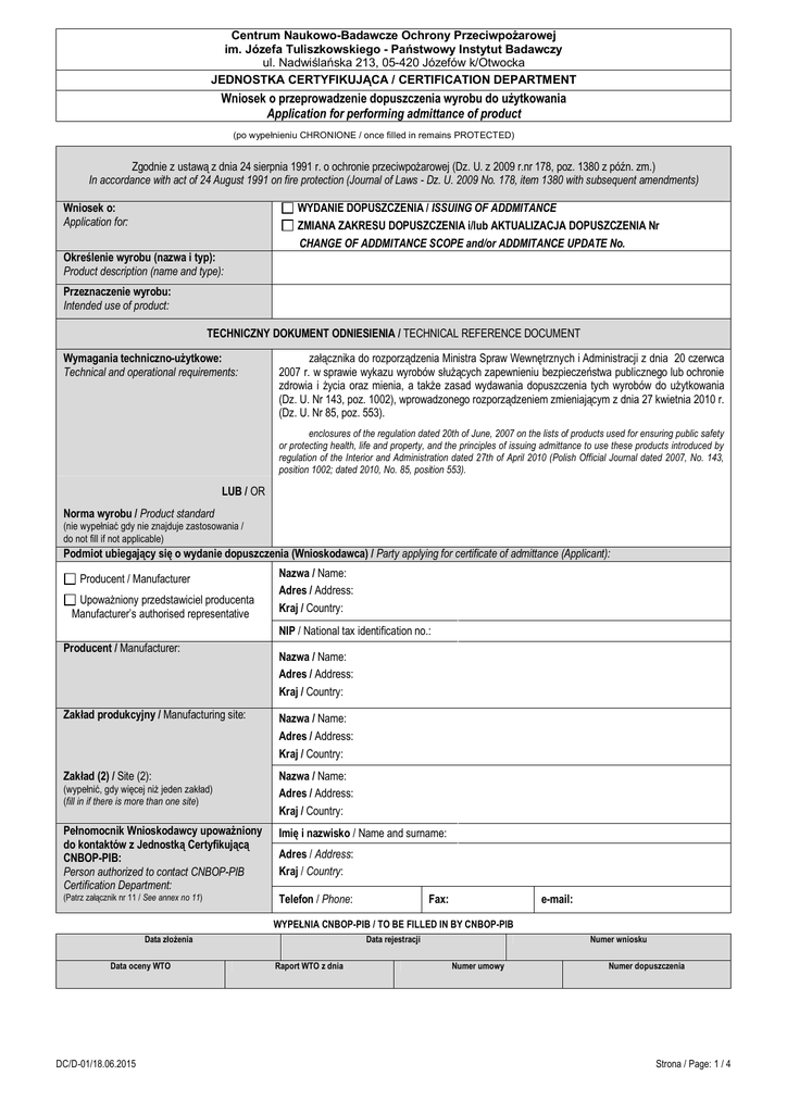 Centrum Naukowo-Badawcze Ochrony Przeciwpożarowej im. Józefa Tuliszkowskiego - Państwowy Instytut Badawczy ul. Nadwiślańska 213, 05-420 Józefów k/Otwocka JEDNOSTKA CERTYFIKUJĄCA / CERTIFICATION DEPARTMENT Wniosek o przeprowadzenie dopuszczenia wyrobu do użytkowania Application for performing admittance of product (po wypełnieniu CHRONIONE / once filled in remains PROTECTED) Zgodnie z ustawą z dnia 24 sierpnia 1991 r. o ochronie przeciwpożarowej (Dz. U. z 2009 r.nr 178, poz. 1380 z późn. zm.) In accordance with act of 24 August 1991 on fire protection (Journal of Laws - Dz. U. 2009 No. 178, item 1380 with subsequent amendments) Wniosek o: Application for: WYDANIE DOPUSZCZENIA / ISSUING OF ADDMITANCE ZMIANA ZAKRESU DOPUSZCZENIA i/lub AKTUALIZACJA DOPUSZCZENIA Nr CHANGE OF ADDMITANCE SCOPE and/or ADDMITANCE UPDATE No. Określenie wyrobu (nazwa i typ): Product description (name and type): Przeznaczenie wyrobu: Intended use of product: TECHNICZNY DOKUMENT ODNIESIENIA / TECHNICAL REFERENCE DOCUMENT Wymagania techniczno-użytkowe: Technical and operational requirements: załącznika do rozporządzenia Ministra Spraw Wewnętrznych i Administracji z dnia 20 czerwca 2007 r. w sprawie wykazu wyrobów służących zapewnieniu bezpieczeństwa publicznego lub ochronie zdrowia i życia oraz mienia, a także zasad wydawania dopuszczenia tych wyrobów do użytkowania (Dz. U. Nr 143, poz. 1002), wprowadzonego rozporządzeniem zmieniającym z dnia 27 kwietnia 2010 r. (Dz. U. Nr 85, poz. 553). enclosures of the regulation dated 20th of June, 2007 on the lists of products used for ensuring public safety or protecting health, life and property, and the principles of issuing admittance to use these products introduced by regulation of the Interior and Administration dated 27th of April 2010 (Polish Official Journal dated 2007, No. 143, position 1002; dated 2010, No. 85, position 553). LUB / OR Norma wyrobu / Product standard (nie wypełniać gdy nie znajduje zastosowania / do not fill if not applicable) Podmiot ubiegający się o wydanie dopuszczenia (Wnioskodawca) / Party applying for certificate of admittance (Applicant): Producent / Manufacturer Upoważniony przedstawiciel producenta Manufacturer’s authorised representative Nazwa / Name: Adres / Address: Kraj / Country: NIP / National tax identification no.: Producent / Manufacturer: Nazwa / Name: Adres / Address: Kraj / Country: Zakład produkcyjny / Manufacturing site: Nazwa / Name: Adres / Address: Kraj / Country: Zakład (2) / Site (2): Nazwa / Name: Adres / Address: Kraj / Country: (wypełnić, gdy więcej niż jeden zakład) (fill in if there is more than one site) Pełnomocnik Wnioskodawcy upoważniony do kontaktów z Jednostką Certyfikującą CNBOP-PIB: Person authorized to contact CNBOP-PIB Certification Department: Imię i nazwisko / Name and surname: (Patrz załącznik nr 11 / See annex no 11) Telefon / Phone: Adres / Address: Kraj / Country: Fax: e-mail: WYPEŁNIA CNBOP-PIB / TO BE FILLED IN BY CNBOP-PIB Data złożenia Data oceny WTO DC/D-01/18.06.2015 Data rejestracji Raport WTO z dnia Numer wniosku Numer umowy Numer dopuszczenia Strona / Page: 1 / 4 Centrum Naukowo-Badawcze Ochrony Przeciwpożarowej im. Józefa Tuliszkowskiego Państwowy Instytut Badawczy ul. Nadwiślańska 213, 05-420 Józefów k/Otwocka JEDNOSTKA CERTYFIKUJĄCA / CERTIFICATION DEPARTMENT ZAŁĄCZNIKI OBOWIĄZKOWE / OBLIGATORY ATTACHMENTS Lp Numer Number Dokumentacja dotycząca wyrobu / Documentation relevant to the product: 1 Dokumenty umożliwiające dokładną identyfikację wyrobu (rysunki techniczne wyrobu jak i jego elementów wraz z wymiarami, fotografie). Documents precisely identifying the product (technical drawings of the product and its parts with dimensions, photographs). 2 Opis techniczny oraz warunki techniczne zastosowania wyrobu (dotyczy wszystkich odmian lub grup wyrobu, jeśli występują). Technical description and technical conditions for use of the product (refers to all product varieties or groups, if applicable). 3 Instrukcja obsługi wyrobu (w tym również montażu, instalacji, oraz konserwacji). Product manual (as well as instructions of: installation, assembly and maintenance). 4 Dane dotyczące właściwości techniczno-użytkowych wyrobu (nie dotyczy jeśli informację zawarto w załączniku 1, 2 lub 3). Data on technical and operational properties of product (does not apply if information is contained in attachment 1, 2 or 3). 5 Informacje o warunkach gwarancji i serwisu wyrobu. Information on guarantee terms and service conditions of product. 6 Dane dotyczące wpływu wyrobu na środowisko. Data on the effect of the product on the environment. 7 Deklaracje zgodności z wymaganiami zasadniczymi dla wyrobów objętych dyrektywami Unii Europejskiej (inne deklaracje, jeśli dotyczy). Declaration of conformity with the essential requirements for products covered by EU directives (other, if applicable). Gdy Wnioskodawca nie jest producentem wyrobu / When the Applicant is not the manufacturer of the product 8 Pisemne pełnomocnictwo Producenta dla Wnioskodawcy do wykonywania w jego imieniu określonych zadań wraz z ich zakresem. Written power of attorney from the Manufacturer to act on his behalf in relation to specified tasks and their scope. Gdy wnioskowany zakres procesu dotyczy zmiany zakresu i/lub aktualizacji dopuszczenia / If the scope of the process regards admittance change and/or update: 9 Szczegółowy opis zmian materiałowych, konstrukcyjnych lub technologicznych mogących mieć wpływ na właściwości użytkowe wyrobu lub na rozszerzenie zakresu jego stosowania. Detailed description of material, design or technological changes which may have an effect on product performance or on the change of the scope of its use. Gdy wyrób jest zgodnie z prawem wyprodukowany lub dopuszczony do obrotu w innym państwie członkowskim Unii Europejskiej albo w Republice Turcji lub zgodnie z prawem wyprodukowany w innym państwie człon