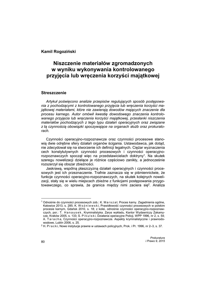 K. Rogoziński Kamil Rogoziński Niszczenie materiałów zgromadzonych w wyniku wykonywania kontrolowanego przyjęcia lub wręczenia korzyści majątkowej Streszczenie Artykuł poświęcono analizie przepisów regulujących sposób postępowania z pochodzącymi z kontrolowanego przyjęcia lub wręczenia korzyści majątkowej materiałami, które nie zawierają dowodów mających znaczenie dla procesu karnego. Autor omówił kwestię dowodowego znaczenia kontrolowanego przyjęcia lub wręczenia korzyści majątkowej, przesłanki niszczenia materiałów pochodzących z tego typu działań operacyjnych oraz związane z tą czynnością obowiązki spoczywające na organach służb oraz prokuratorach. Czynności operacyjno-rozpoznawcze oraz czynności procesowe stanowią dwie odrębne sfery działań organów ścigania. Ustawodawca, jak dotąd, nie zdecydował się na stworzenie ich definicji legalnych. Ciężar wyznaczenia cech konstytutywnych czynności procesowych i czynności operacyjnorozpoznawczych spoczął więc na przedstawicielach doktryny1. Na skutek szeregu nowelizacji dzielące je różnice częściowo zanikły, a jednocześnie rozszerzył się obszar zbieżności. Jaskrawą, wspólną płaszczyzną działań operacyjnych i czynności procesowych jest ich przeznaczenie. Trafnie zaznacza się w piśmiennictwie, że funkcje czynności operacyjno-rozpoznawczych, na skutek kolejnych nowelizacji, stały się w wielu miejscach zbieżne z funkcjami postępowania przygotowawczego, co sprawia, że granica między nimi zaciera się2. Analiza 1 Odnośnie do czynności procesowych zob.: K. M a r s z a ł, Proces karny. Zagadnienia ogólne, Katowice 2013, s. 285; K. W o ź n i e w s k i, Prawidłowość czynności procesowych w polskim procesie karnym, Gdańsk 2010, s. 18; z kolei, odnośnie czynności operacyjno-rozpoznawczych, por.: T. H a n a u s e k , Kryminalistyka. Zarys wykładu, Kantor Wydawniczy Zakamycze, Kraków 2005, s. 133; S. P i k u l s k i, Działania operacyjne Policji, WPP 1996, nr 2, s. 54; A. T a r a c h a, Czynności operacyjno-rozpoznawcze. Aspekty kryminalistyczne i prawnodowodowe, Lublin 2006, s. 25. 2 H. P r a c k i, Nowe instytucje prawne w ustawach policyjnych, Prok. i Pr. 1996, nr 2–3, s. 37. 80 Prokuratura i Prawo 9, 2015 Niszczenie materiałów zgromadzonych w wyniku wykonywania… art. 297 § 1 k.p.k. oraz przepisów uprawniających do stosowania czynności operacyjno-rozpoznawczych pozwala na podzielenie tego poglądu.. Współcześnie w piśmiennictwie naukowym dominuje stanowisko, że wyniki pewnych metod operacyjnych mogą być wprost wykorzystane w postępowaniu karnym3. Regulując niektóre z nich, ustawodawca zdecydował, że materiały uzyskane w ich ramach uzyskają walor dowodowy i dopuszczalne będzie ich bezpośrednie wykorzystanie w procesie karnym, bez konieczności ich uprzedniego przekształcenia. Dotyczy to takich metod, jak: kontrola operacyjna, kontrolowane nabycie, zbycie lub przejęcie przedmiotów pochodzących z przestępstwa, ulegających przepadkowi albo których wytwarzanie, posiadanie, przewożenie lub obrót są zabronione, przyjęcie lub wręczenie korzyści majątkowej i przesyłka niejawnie nadzorowana. Przy ich regulacji ustawodawca wskazuje, że mają one być dokonane dla „uzyskania dowodów”, „uzyskania i utrwalenia dowodów”, „udokumentowania przestępstw”. Jednocześnie ustala, że odnośnie do uzyskanych materiałów w toku postępowania sądowego stosuje się odpowiednio art. 393 § 1 zd. pierwsze k.p.k., który stanowi, że „Wolno odczytywać na rozprawie protokoły oględzin, przeszukania i zatrzymania rzeczy, opinie biegłych, instytutów, zakładów lub instytucji, dane o karalności, wyniki wywiadu środowiskowego oraz wszelkie dokumenty urzędowe złożone w postępowaniu przygotowawczym lub sądowym albo w innym postępowaniu przewidzianym przez ustawę”. Ustawodawca wskazał tym samym, że materiały z wybranych działań operacyjnych przeprowadza się w toku przewodu sądowego poprzez ich odczytanie (a w wypadku nośników zawierających zapis audio lub wideo przez ich odtworzenie). Wniosek o ściśle dowodowym charakterze tych materiałów ma również pełne oparcie w treści prac legislacyjnych4. Dzięki niektórym, wyraźnie wskazanym przez ustawodawcę metodom operacyjnym można uzyskać materiały mające charakter dowodów ścisłych, to jest takich, które mogą stanowić podstawę wszelkich orzeczeń wydanych w toku procesu, włącznie z wyrokiem. 3 R. N e t c z u k, Tajny współpracownik Policji na tle prawnoporównawczym, Katowice 2006, s. 121 i n.; K. M a r s z a ł (red.), Proces karny. Przebieg postępowania, Katowice 2012, s. 449; T. G r z e g o r c z y k., Wykorzystanie i przekształcenie materiałów operacyjnych w materiał dowodowy w postępowaniu karnym, (w:) E. W. P ł y w a c z e w s k i (red.), Przestępczość zorganizowana, Kantor Wydawniczy Zakamycze, Kraków 2005, s. 225; A. T a r a c h a, Czynności operacyjno-rozpoznawcze…, op. cit., s. 227 i n.; A. L a c h, Dowody elektroniczne w postępowaniu karnym, Toruń 2004, s. 187; A. S z u m s k i, Rola czynności operacyjnorozpoznawczych w uzyskiwaniu dowodów w procesie karnym, NKPK 2010, nr 26, s. 195 i n.; K. T. B o r a t y ń s k a, Kontrola operacyjna a rzetelność procesu – uwagi de lege lata i de lege ferenda, (w:) J. S k o r u p k a, W. J a s i ń s k i (red.), Rzetelny proces karny. Materiały konferencji naukowej, Trzebieszowice, 17–19 września 2009 r., Warszawa 2010, s. 197. 4 Uzasadnienie projektu ustawy o zmianie ustawy o Policji, ustawy o działalności ubezpieczeniowej oraz ustawy – Prawo bankowe z dnia 16 czerwca 2000 r., Druk 2012. Prokuratura i Prawo 9, 2015 81 K. Rogoziński Jak już wyżej zasygnalizowano, jedną z metod operacyjnych, która może dostarczyć dowodów ścisłych, jest kontrolowane przyjęcie lub wręczenie korzyści majątkowej. Tego typu działania operacyjne mogą wykonywać A