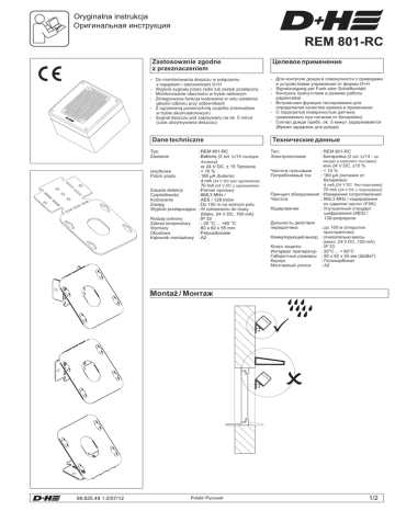 Oryginalna instrukcja Оригинальная инструкция REM 801-RC Zastosowanie zgodne z przeznaczeniem - Do monitorowania deszczu w połączeniu - z napędami i sterownikami D+H Wyjście sygnału przez radio lub zestyk przełączny Monitorowanie obecności w trybie radiowym Zintegrowana funkcja testowania w celu ustalenia jakości odbioru przy odbiornikach Z ogrzewaną powierzchnią czujnika (niemożliwe w trybie akumulatorowym) Sygnał deszczu jest zapisywany na ok. 5 minut (czas utrzymywania deszczu) Dane techniczne Tye: Zasilanie :REM 801-RC :Batterie (2 szt. Lr14 nieobjęte dostawą) or 24 V DC, ± 15 Tętnienie :< 10 % resztkowe :180 μA (baterie) Pobór prądu 4 mA (24 V DC bez ogrzewania) 70 mA (24 V DC z ogrzewaniem Zasada detekcji :Pomiar oporowy Częstotliwość :868,3 MHz / Kodowanie :AES / 128 bitów Zasięg : Do 100 m na wolnym polu Wyjście przełączające : W odniesieniu do masy (Maks. 24 V DC, 100 mA) : IP 33 Rodzaj ochrony :- 20 °C ... +60 °C Zakres temperatury :80 x 82 x 55 mm Wymiary :Polycarbonate Obudowa Kątownik montażowy :A2 Целевое применение - Для контроля дождя в совокупности с приводами и устройствами управления от фирмы D+H - Signalausgang per Funk oder Schaltkontakt - Контроль присутствия в режиме работы радиосвязи - Встроенная функция тестирования для определения качества приема в приемниках - С подогретой поверхностью датчика (невозможно при питании от батарейки) - Сигнал дождя прибл. ok. 5 минут задерживается (Время задержки для дождя) Технические данные Тип: Электропитание : REM 801-RC : Батарейка (2 шт. Lr14 - не входят в комплект поставки) или 24 V DC, ±15 % Частота пульсации : < 10 % Потребляемый ток : 180 μА (питание от батарейки) 4 mА (24 V DC без подогрева) 70 mА (24 V DC с подогревом) Принцип обнаружения : Измерение сопротивления Частота : 868,3 MHz / кодирование со сдвигом частот (FSK) Кодирование : Улучшенный стандарт шифрования (AES) / 128-разрядное Дальность действия передатчика : до 100 м (открытое пространство) Коммутирующий выход : относительно массы (макс. 24 V DC ,100 mА) Класс защиты : IP 33 Интервал температур : 20°C ... + 60°C Габаритные размеры : 80 x 82 x 55 мм (ШxВxГ) Корпус : Поликарбонат Монтажный уголок : A2 Montaż / Монтаж P O 99.825.49 1.0/07/12 Polski/ Русский 1/2 Przyłącze / Подсоединение Programowanie / Обучение Start / Hачало 24 V DC / 24 V DC 24 V DC / maks. 100 mA 24 V DC / макс.100 mА 1 2 3 > 5Sec. ON REM 801-RC SET 2 x LR 14 5 Sec. 5 Sec. 1 2 3 4 ~ 2 lata / года 1 2 3 ON 1 2 3 4 >2 Sec. 24 V DC макс.100 mА / 24 V DC / maks. 100 mA Koniec / Kонец Przełącznik DIP / DIP-переключатель 1=ON (Вкл) > 5Sec. „Deszcz” jest wyzwalany przy temperaturze otoczenia ok. < 4 °C / Запускается функция «Дождь», когда температура окружающего воздуха составляет прибл. < 4 °C 1x Musi zostać powtórzone przy każdym odbiorniku. Gdy przyporządkowanie zostanie usunięte przez BDT (Level 2) lub RCR 11 (Level 3), usuwane jest także przyporządkowanie REM 801-RC. Konieczne jest ponowne połączenie sygnalizatora deszczu. Должно быть повторено с каждым приемником. Если удаляется присвоение через BDT (уровень 2) или RCR 11 (уровень 3), то также оно удаляется из устройства REM 801-RC. Известитель дождя должен быть подсоединен заново 2=ON (Вкл) „Deszcz” jest wyzw, gdy czujnik jest wilgotny, bez deszczu (wysoka czułość) / Alanyускается функция «Дождь», когда датчик увлажнен без дождя(высокая чувствительность) / 2= OFF (Выкл) „Deszcz” jest wyzwalany, gdy czujnik jest wilgotny i pada deszcz (niska czułość) / Запускается функция «Дождь», когда датчик увлажнен и когда идет дождь(низкая чувствительность) Wskazówki / Указания 3=ON (Вкл) Tryb nadawczy do tesowania jakości połączenia pomiędzy sygnalizatorem deszczu a odbiornikami przez maks. 1 h (miga LED w odbiorniku) / Режим передачи для тестирования качества связи между известителем дождя и приемником для времени макс. 1 час (мигает светодиод в приемнике) Po zakończeniu komunikatu o deszczu REM 801-RC posiada czas wstrzymania 5 min. GN = YE = 4 = = Wolne / Не задействован RD = = W przypadku podłączenia REM 801-RC do zasilania 24 V DC, powierzchnia detekcyjna jest ogrzewana wówczas, gdy jest wilgotna lub temperatura otoczenia wynosi ok. < 18 °C. REM 801-RC wysyła do odbiornika co 15 minut sygnał obecności, jeśli nie zostanie on odebrany przy 3 próbach, po 3 próbie (po 45 minutach) wyzwalana jest funkcja "Deszcz". Może się to zdarzyć m.in. przy rozładowanej baterii lub przerwaniu połączenia radiowego. = = Если устройство REM 801-RC подключено к источнику питания 24 V 