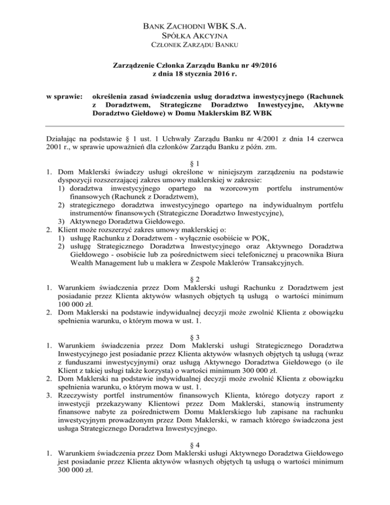 BANK ZACHODNI WBK S.A. SPÓŁKA AKCYJNA CZŁONEK ZARZĄDU BANKU Zarządzenie Członka Zarządu Banku nr 49/2016 z dnia 18 stycznia 2016 r. w sprawie: określenia zasad świadczenia usług doradztwa inwestycyjnego (Rachunek z Doradztwem, Strategiczne Doradztwo Inwestycyjne, Aktywne Doradztwo Giełdowe) w Domu Maklerskim BZ WBK Działając na podstawie § 1 ust. 1 Uchwały Zarządu Banku nr 4/2001 z dnia 14 czerwca 2001 r., w sprawie upoważnień dla członków Zarządu Banku z późn. zm. §1 1. Dom Maklerski świadczy usługi określone w niniejszym zarządzeniu na podstawie dyspozycji rozszerzającej zakres umowy maklerskiej w zakresie: 1) doradztwa inwestycyjnego opartego na wzorcowym portfelu instrumentów finansowych (Rachunek z Doradztwem), 2) strategicznego doradztwa inwestycyjnego opartego na indywidualnym portfelu instrumentów finansowych (Strategiczne Doradztwo Inwestycyjne), 3) Aktywnego Doradztwa Giełdowego. 2. Klient może rozszerzyć zakres umowy maklerskiej o: 1) usługę Rachunku z Doradztwem - wyłącznie osobiście w POK, 2) usługę Strategicznego Doradztwa Inwestycyjnego oraz Aktywnego Doradztwa Giełdowego - osobiście lub za pośrednictwem sieci telefonicznej u pracownika Biura Wealth Management lub u maklera w Zespole Maklerów Transakcyjnych. §2 1. Warunkiem świadczenia przez Dom Maklerski usługi Rachunku z Doradztwem jest posiadanie przez Klienta aktywów własnych objętych tą usługą o wartości minimum 100 000 zł. 2. Dom Maklerski na podstawie indywidualnej decyzji może zwolnić Klienta z obowiązku spełnienia warunku, o którym mowa w ust. 1. §3 1. Warunkiem świadczenia przez Dom Maklerski usługi Strategicznego Doradztwa Inwestycyjnego jest posiadanie przez Klienta aktywów własnych objętych tą usługą (wraz z funduszami inwestycyjnymi) oraz usługą Aktywnego Doradztwa Giełdowego (o ile Klient z takiej usługi także korzysta) o wartości minimum 300 000 zł. 2. Dom Maklerski na podstawie indywidualnej decyzji może zwolnić Klienta z obowiązku spełnienia warunku, o którym mowa w ust. 1. 3. Rzeczywisty portfel instrumentów finansowych Klienta, którego dotyczy raport z inwestycji przekazywany Klientowi przez Dom Maklerski, stanowią instrumenty finansowe nabyte za pośrednictwem Domu Maklerskiego lub zapisane na rachunku inwestycyjnym prowadzonym przez Dom Maklerski, w ramach którego świadczona jest usługa Strategicznego Doradztwa Inwestycyjnego. §4 1. Warunkiem świadczenia przez Dom Maklerski usługi Aktywnego Doradztwa Giełdowego jest posiadanie przez Klienta aktywów własnych objętych tą usługą o wartości minimum 300 000 zł. 2. Dom Maklerski na podstawie indywidualnej decyzji może zwolnić Klienta z obowiązku spełnienia warunku, o którym mowa w ust. 1. §5 Odrębne regulacje mogą inaczej, niż zostało to wskazane w § 3 i 4 powyżej, określać sposób obliczania przez Dom Maklerski wartości aktywów posiadanych przez Klienta w odniesieniu do poszczególnych grup Klientów. §6 1. Dom Maklerski zawiesza świadczenie na rzecz Klienta usługi doradztwa inwestycyjnego: 1) w przypadku Rachunku z Doradztwem, jeżeli łączna wartość aktywów zapisanych na rachunkach objętych tą usługą jest mniejsza niż 50 000 zł. 2) w przypadku Strategicznego Doradztwa Inwestycyjnego, jeżeli łączna wartość aktywów zapisanych na rachunkach objętych tą usługą oraz funduszy inwestycyjnych objętych usługą Strategicznego Doradztwa Inwestycyjnego jest mniejsza niż 150 000 zł. 3) w przypadku Aktywnego Doradztwa Giełdowego, jeżeli Klient nie posiada na rachunkach objętych tą usługą aktywów o wartości co najmniej 150 000 zł albo w poprzednim roku kalendarzowym nie wykonał na tych rachunkach łącznego obrotu na rynku kasowym polskim lub zagranicznym w wysokości co najmniej 400 000 zł lub indeksowymi kontraktami terminowymi w wysokości co najmniej 300 sztuk. 4) jeżeli Klient nie przedstawił informacji potrzebnych do dokonania przeglądu polityki inwestycyjnej, tj. nie zaktualizował oceny odpowiedniości dotyczącej usługi doradztwa inwestycyjnego. 5) jeżeli w wyniku aktualizacji oceny odpowiedniości dotyczącej usługi doradztwa inwestycyjnego usługa stała się nieodpowiednia. 2. W czasie, w którym zawieszone jest świadczenie usług doradztwa inwestycyjnego, o których mowa w ust.1: 1) Dom Maklerski nie świadczy usług doradztwa inwestycyjnego na rzecz Klienta, 2) nie nalicza i nie pobiera się opłat o których mowa w Taryfie opłat i prowizji z tytułu usług doradztwa inwestycyjnego świadczonych przez Dom Maklerski BZ WBK, dedykowanej dla danego rodzaju usługi doradztwa inwestycyjnego świadczonej dla Klienta, natomiast opłaty i prowizje należne Domowi Maklerskiemu pobierane są w wysokości i na zasadach określonych w Taryfie opłat i prowizji Domu Maklerskiego BZ WBK. 3. Zawieszenie świadczenia usług doradztwa inwestycyjnego, o których mowa w ust. 1 pkt 1-3, jest dokonywane z początkiem kwartału kalendarzowego następującego po kwartale, w którym zaistniały warunki zawieszenia usługi – w przypadku usług Rachunku z Doradztwem i Strategicznego Doradztwa Inwestycyjnego, albo z początkiem następnego roku kalendarzowego – w przypadku usługi Aktywnego Doradztwa Giełdowego. 4. Zawieszenie świadczenia usług doradztwa inwestycyjnego w przypadku, o którym mowa w ust. 1 pkt 4, jest dokonywane nie później niż do końca pierwszego kwartału roku kalendarzowego następującego po roku, w którym zaistniały warunki zawieszenia usługi. 5. Zawieszenie świadczenia usług doradztwa inwestycyjnego, w przypadku o którym mowa w ust. 1 pkt 5, jest dokonywane niezwłocznie po stwierdzeniu na podstawie aktualnego wyniku oceny odpowiedniości, że usługa stała się nieodpowiednia . 6. Dom Maklerski na podstawie indywidualnej decyzji może odstąpić od zawieszenia świadczenia usług doradztwa inwestycyjnego (Rachunku z Doradztwem, Strategicznego Doradztwa Inwestycyjnego lub Aktywnego D