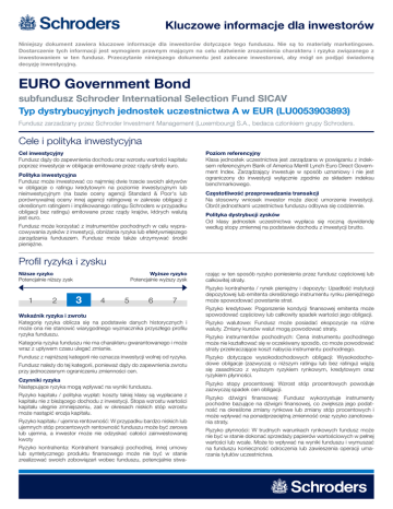 Kluczowe informacje dla inwestorów Niniejszy dokument zawiera kluczowe informacje dla inwestorów dotyczące tego funduszu. Nie są to materiały marketingowe. Dostarczenie tych informacji jest wymogiem prawnym mającym na celu ułatwienie zrozumienia charakteru i ryzyka związanego z inwestowaniem w ten fundusz. Przeczytanie niniejszego dokumentu jest zalecane inwestorowi, aby mógł on podjąć świadomą decyzję inwestycyjną. EURO Government Bond subfundusz Schroder International Selection Fund SICAV Typ dystrybucyjnych jednostek uczestnictwa A w EUR (LU0053903893) Fundusz zarzadzany przez Schroder Investment Management (Luxembourg) S.A., bedaca czlonkiem grupy Schroders. Cele i polityka inwestycyjna Cel inwestycyjny Fundusz dąży do zapewnienia dochodu oraz wzrostu wartości kapitału poprzez inwestycje w obligacje emitowane przez rządy strefy euro. Polityka inwestycyjna Fundusz może inwestować co najmniej dwie trzecie swoich aktywów w obligacje o ratingu kredytowym na poziomie inwestycyjnym lub nieinwestycyjnym (na bazie oceny agencji Standard & Poor's lub porównywalnej oceny innej agencji ratingowej w zakresie obligacji z określonym ratingiem i implikowanego ratingu Schroders w przypadku obligacji bez ratingu) emitowane przez rządy krajów, których walutą jest euro. Fundusz może korzystać z instrumentów pochodnych w celu wypracowywania zysków z inwestycji, obniżania ryzyka lub efektywniejszego zarządzania funduszem. Fundusz może także utrzymywać środki pieniężne. Poziom referencyjny Klasa jednostek uczestnictwa jest zarządzana w powiązaniu z indeksem referencyjnym Bank of America Merrill Lynch Euro Direct Government Index. Zarządzający inwestuje w sposób uznaniowy i nie jest ograniczony do inwestycji wyłącznie zgodnie ze składem indeksu benchmarkowego. Częstotliwość przeprowadzania transakcji Na stosowny wniosek inwestor może zlecić umorzenie inwestycji. Obrót jednostkami uczestnictwa funduszu odbywa się codziennie. Polityka dystrybucji zysków Od klasy jednostek uczestnictwa wypłaca się roczną dywidendę według stopy zmiennej na podstawie dochodu z inwestycji brutto. Profil ryzyka i zysku Niższe ryzyko Potencjalnie niższy zysk 1 2 Wyższe ryzyko Potencjalnie wyższy zysk 3 4 5 6 7 Wskaźnik ryzyka i zwrotu Kategorię ryzyka oblicza się na podstawie danych historycznych i może ona nie stanowić wiarygodnego wyznacznika przyszłego profilu ryzyka funduszu. Kategoria ryzyka funduszu nie ma charakteru gwarantowanego i może wraz z upływem czasu ulegać zmianie. Fundusz z najniższej kategorii nie oznacza inwestycji wolnej od ryzyka. Fundusz należy do tej kategorii, ponieważ dąży do zapewnienia zwrotu przy jednoczesnym ograniczeniu zmienności cen. Czynniki ryzyka Następujące ryzyka mogą wpływać na wyniki funduszu. Ryzyko kapitału / polityka wypłat: koszty takiej klasy są wypłacane z kapitału nie z bieżącego dochodu z inwestycji. Stopa wzrostu wartości kapitału ulegnie zmniejszeniu, zaś w okresach niskich stóp wzrostu może nastąpić erozja kapitału. Ryzyko kapitału / ujemna rentowność: W przypadku bardzo niskich lub ujemnych stóp procentowych rentowność funduszu może być zerowa lub ujemna, a inwestor może nie odzyskać całości zainwestowanej kwoty Ryzyko kontrahenta: Kontrahent transakcji pochodnej, innej umowy lub syntetycznego produktu finansowego może nie być w stanie zrealizować swoich zobowiązań wobec funduszu, potencjalnie stwa- rzając w ten sposób ryzyko poniesienia przez fundusz częściowej lub całkowitej straty. Ryzyko kontrahenta / rynek pieniężny i depozyty: Upadłość instytucji depozytowej lub emitenta określonego instrumentu rynku pieniężnego może spowodować powstanie strat. Ryzyko kredytowe: Pogorszenie kondycji finansowej emitenta może spowodować częściowy lub całkowity spadek wartości jego obligacji. Ryzyko walutowe: Fundusz może posiadać ekspozycje na różne waluty. Zmiany kursów walut mogą powodować straty. Ryzyko instrumentów pochodnych: Cena instrumentu pochodnego może nie kształtować się w oczekiwany sposób, co może powodować straty przekraczające koszt nabycia instrumentu pochodnego. Ryzyko dotyczące wysokodochodowych obligacji: Wysokodochodowe obligacje (zazwyczaj o niższym ratingu lub bez ratingu) wiążą się zasadniczo z wyższym ryzykiem rynkowym, kredytowym oraz ryzykiem płynności. Ryzyko stopy procentowej: Wzrost stóp procentowych powoduje zazwyczaj spadek cen obligacji. Ryzyko dźwigni finansowej: Fundusz wykorzystuje instrumenty pochodne bazujące na dźwigni finansowej, co zwiększa jego podatność na określone zmiany rynkowe lub zmiany stóp procentowych i może wpływać na ponadprzeciętną zmienność oraz ryzyko zanotowania straty. Ryzyko płynności: W trudnych warunkach rynkowych fundusz może nie być w stanie dokonać sprzedaży papierów wartościowych w pełnej wartości lub wcale. Może to wpływać na wyniki funduszu i wymuszać na funduszu konieczność odroczenia lub zawieszenia operacji umarzania tytułów uczestnictwa. Schroder International Selection Fund SICAV EURO Government Bond Ryzyko operacyjne: Awarie u dostawców usług mogą prowadzić do strat lub zakłóceń w działalności funduszu. Opłaty Opłaty jednorazowe pobierane przed lub po dokonaniu inwestycji Opłata za subskrypcję 3,00% Opłata za umorzenie brak Wyszczególnione opłaty za nabycie i umorzenie są wartościami maksymalnymi, w pewnych przypadkach inwestor może zostać obciążony niższymi kwotami. Inwestor może zapoznać się z aktualnie obowiązującymi opłatami za nabycie i umorzenie u swego doradcy finansowego. Jest to maksymalna kwota, jaka może zostać pobrana z Państwa środków przed ich zainwestowaniem. Opłaty pobierane z funduszu w ciągu roku Opłaty bieżące Wysokość opłat bieżących określa się na podstawie kosztów poniesionych za rok zakończony w grudnia 2016 r i mogą one z roku na rok ulegać zmianie. 0,60