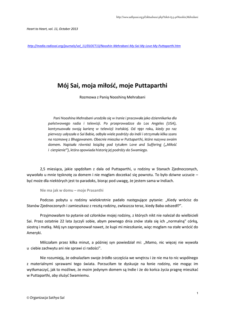 http://www.sathyasai.org.pl/aktualnosci.php?tekst=t5.5.4#Nooshin_Mehrabani Heart to Heart, vol. 11, October 2013 http://media.radiosai.org/journals/vol_11/01OCT13/Nooshin-Mehrabani-My-Sai-My-Love-My-Puttaparthi.htm Mój Sai, moja miłość, moje Puttaparthi Rozmowa z Panią Nooshiną Mehrabani Pani Nooshina Mehrabani urodziła się w Iranie i pracowała jako dziennikarka dla państwowego radia i telewizji. Po przeprowadzce do Los Angeles (USA), kontynuowała swoją karierę w telewizji irańskiej. Od 1991 roku, kiedy po raz pierwszy usłyszała o Sai Babie, odbyła wiele podróży do Indii i otrzymała kilka szans na rozmowę z Bhagawanem. Obecnie mieszka w Puttaparthi, które nazywa swoim domem. Napisała również książkę pod tytułem Love and Suffering („Miłość i cierpienie”), która opowiada historię jej podróży do Swamiego. 2,5 miesiąca, jakie spędziłam z dala od Puttaparthi, u rodziny w Stanach Zjednoczonych, wywołało u mnie tęsknotę za domem i nie mogłam doczekać się powrotu. To było dziwne uczucie – być może dla niektórych jest to paradoks, biorąc pod uwagę, że jestem sama w Indiach. Nie ma jak w domu – moje Prasanthi Podczas pobytu u rodziny wielokrotnie padało następujące pytanie: „Kiedy wrócisz do Stanów Zjednoczonych i zamieszkasz z resztą rodziny, zwłaszcza teraz, kiedy Baba odszedł?”. Przyjmowałam to pytanie od członków mojej rodziny, z których nikt nie należał do wielbicieli Sai. Przez ostatnie 22 lata życzyli sobie, abym pewnego dnia znów stała się ich „normalną” córką, siostrą i matką. Mój syn zaproponował nawet, że kupi mi mieszkanie, więc mogłam na stałe wrócić do Ameryki. Milczałam przez kilka minut, a później syn powiedział mi: „Mamo, nic więcej nie wywoła u ciebie zachwytu ani nie sprawi ci radości”. Nie rozumieją, że odnalazłam swoje źródło szczęścia we wnętrzu i że nie ma to nic wspólnego z materialnymi sprawami tego świata. Porzuciłam te dyskusje na łonie rodziny, nie mogąc im wytłumaczyć, jak to możliwe, że moim jedynym domem są Indie i że do końca życia pragnę mieszkać w Puttaparthi, aby służyć Swamiemu. 1 © Organizacja Sathya Sai http://www.sathyasai.org.pl/aktualnosci.php?tekst=t5.5.4#Nooshin_Mehrabani Mój satsang z sufi w Stanach Zjednoczonych W połowie mojej podróży po Stanach Zjednoczonych, na jednym ze spotkań społeczności irańskiej, poznałam kobietę, która wyznawała sufizm. Gdy dowiedziała się, że mieszkam w małej wiosce w Indiach niedaleko aszramu mojego guru, nalegała, abym podzieliła się swoimi doświadczeniami z grupą sufi na cotygodniowym spotkaniu organizowanym w domu jednej z nich. Członkinie tej grupy prowadziły kółko studyjne, na którym dyskutowały nie tylko o Koranie, świętej księdze muzułmanów, ale także ogólnie o duchowości. Uważały, że religia bez duchowości jest jak ciało bez duszy. Widząc prawdziwe zainteresowanie tych pań, które chciały dowiedzieć się czegoś o moim guru z Indii, wzięłam udział w jednym ze spotkań, by podzielić się z nimi swoimi doświadczeniami związanymi z naszym ukochanym Sathya Sai Babą. Po wysłuchaniu tego, co mam im do powiedzenia, nabrały jeszcze większej ochoty do poznania nauk Swamiego, a ja byłam szczęśliwa, że mogę przekazać im to, czego nauczyłam się od największego mistrza, jaki kiedykolwiek stąpał po ziemi. Modliłam się o to, aby Swami zawsze dawał mi okazję do opowiadania, słuchania i odzwierciedlania jego miłości, dokądkolwiek pójdę. W rozmowie z sufi nie podkreślałam znaczenia cudów Baby, skupiając się w zamian na tym, jak prowadził nas wszystkich do codziennego życia w prawdzie, w miłości i w jedności. Niemniej ponieważ częścią mojego doświadczenia była materializacja wibhuti, wspomniałam o nim . Po usłyszeniu o tym świętym popiele i o tym, jak wiele osób uzdrowił, niektóre panie zapytały mnie, czy mam go odrobinę do rozdania. Ponieważ Swami wszystko planuje z wyprzedzeniem, przywiozłam ze sobą do Stanów Zjednoczonych paczuszkę wibhuti, którą ofiarował mi na zakończenie rozmowy. Obiecałam tym kobietom, że przyniosę ją na kolejne spotkanie. W następnym tygodniu dyskutowały o czystości umysłu i serca oraz o sposobie przejawiania tej czystości w naszym codziennym życiu. Po każdej rozmowie panie chciały wiedzieć więcej o naukach Swamiego na dany temat. Sufi były zdumione odkryciem, że między naukami Sathya Sai Baby, a tym, co przekazuje nam Koran, nie ma żadnej różnicy. Byłam szczęśliwa widząc, jak z otwartymi umysłami interpretują Koran. Do rozwoju umysłu i serca często dochodzi u człowieka, który dzieli się swoją wiedzą i zrozumieniem świętych tekstów. Na końcu dyskusji rozdałam wibhuti 20 paniom. Chętnie odbierały ten święty popiół, który został pobłogosławiony przez tak świętą istotę jak Swami. Kilka kobiet zatrzymało go dla swoich rodzin. Byłam zdziwiona, w jaki sposób nasz Swami objawił się tym oddanym kobietom bez większego wysiłku z mojej strony. Przed wyjazdem ze Stanów Zjednoczonych udałam się na ostatnie spotkanie, by się pożegnać. Cieszyłam się słysząc ich rozmowę o jedności myśli, słów i czynów, która jest także ważnym aspektem nauk Swamiego. Na zakończenie kilka pań powiedziało mi, że wibhuti pomogło niektórym chorym w ich rodzinach. Tego wieczoru w drodze do domu myślałam o moich rozmowach z tymi sufi. Aranżując to małe przedstawienie, Swami otworzył im drugie drzwi, a ja zrozumiałam, że jeśli istnieje silna wiara 2 © Organizacja Sathya Sai http://www.sathyasai.org.pl/aktualnosci.php?tekst=t5.5.4#Nooshin_Mehrabani i oddanie dla Boga, wszelkie przeszkody znikają, a wszystkie pozorne różnice stają się wyłącznie jednością. Bezwarunkowa miłość do Boga zawsze odgrywa ogromną rolę w jednoczeniu ludzi. Te sufi, przedstawicielki jednego z nurtów w islamie, miały możliwoś