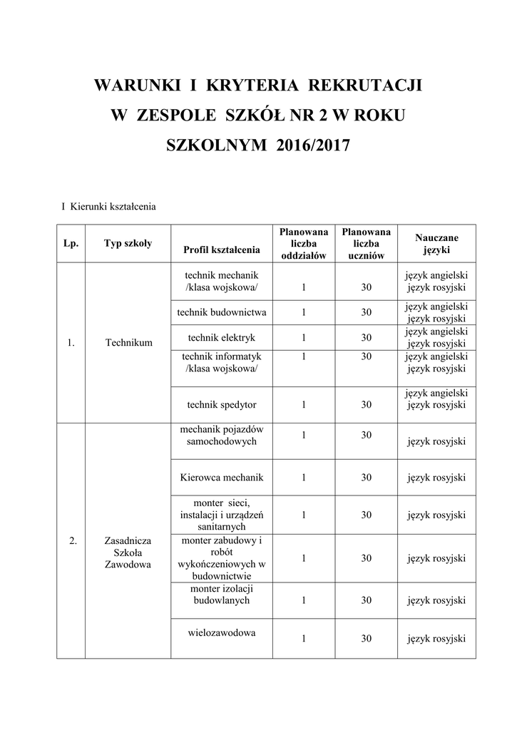 WARUNKI I KRYTERIA REKRUTACJI W ZESPOLE SZKÓŁ NR 2 W ROKU SZKOLNYM 2016/2017 I Kierunki kształcenia Lp. 1. 2. Typ szkoły Technikum Zasadnicza Szkoła Zawodowa Planowana liczba oddziałów Planowana liczba uczniów technik mechanik /klasa wojskowa/ 1 30 technik budownictwa 1 30 technik elektryk 1 30 technik informatyk /klasa wojskowa/ 1 30 technik spedytor 1 30 mechanik pojazdów samochodowych 1 30 Kierowca mechanik 1 30 język rosyjski 1 30 język rosyjski 1 30 język rosyjski 1 30 język rosyjski 1 30 język rosyjski Profil kształcenia monter sieci, instalacji i urządzeń sanitarnych monter zabudowy i robót wykończeniowych w budownictwie monter izolacji budowlanych wielozawodowa Nauczane języki język angielski język rosyjski język angielski język rosyjski język angielski język rosyjski język angielski język rosyjski język angielski język rosyjski język rosyjski II Zasady rekrutacji W Zespole Szkół Nr 2 w Łosicach obowiązują zasady rekrutacji i naboru uczniów zgodne z Zarządzeniem Nr 6 Mazowieckiego Kuratora Oświaty z dnia 27 stycznia 2016 r. obowiązującym wszystkie szkoły ponadgimnazjalne. Zasady punktacji przyznawanej kandydatom do klasy pierwszej na podbudowie gimnazjum. Maksymalna liczba punktów możliwych do uzyskania w postępowaniu rekrutacyjno kwalifikacyjnym wynosi -200 punktów. 100 punktów można uzyskać za oceny na świadectwie gimnazjum z czterech przedmiotów- języka polskiego i trzech zajęć edukacyjnych wskazanych w statucie szkoły oraz za inne osiągnięcia ucznia wymienione w świadectwie ukończenia gimnazjum. 100 punktów również można uzyskać za egzamin przeprowadzony w ostatnim roku nauki w gimnazjum. a) przeliczanie na punkty ocen z języka polskiego i trzech wybranych zajęć edukacyjnych ocena celujący bardzo dobry dobry dostateczny dopuszczający punkty 20 16 12 8 2 b) Przeliczanie na punkty osiągnięć ucznia wymienionych w świadectwie ukończenia gimnazjum. Osiągnięcia wymienione na świadectwie Liczba punktów za udział w konkursach organizowanych przez kuratora oświaty, co najmniej na szczeblu wojewódzkim lub za udział w II etapie konkursu organizowanego na zasadach określonych w rozporządzeniu MENiS Dz. U. Nr 13 p. 125 punkty do 13 pkt Finalista lub laureat więcej niż jednego konkursu. 13 pkt. Za tytuł finalisty w co najmniej jednym konkursie organizowanym przez kuratora oświaty na zasadach określonych w rozporządzeniu Ministra Edukacji Narodowej i Sportu z dnia 29 stycznia 2002 r. (Dz. U. Nr 13, poz. 125). 7 pkt. Finalista więcej niż jednego konkursu, z zastrzeżeniem iż w przypadku przyznania 13 pkt. Nie przyznaje się 7 pkt. 7 pkt. Za świadectwo ukończenia gimnazjum z wyróżnieniem Za osiągnięcia sportowe lub artystyczne na szczeblu wojewódzkim lub ogólnopolskim 5 pkt 5 pkt Za osiągnięcia sportowe lub artystyczne na szczeblu powiatowym Za osiągnięcia w aktywności na rzecz innych ludzi, zwłaszcza w formie wolontariatu lub środowiska lokalnego. Za średnia arytmetyczną z obowiązkowych zajęć edukacyjnych i dodatkowych zajęć edukacyjnych, wymienionych na świadectwie ukończenia gimnazjum 2 pkt 2 pkt do 6 pkt Przy obliczaniu średniej arytmetycznej przyjmuje się następujące wartości punktowe ocen: 6 pkt. – ocena: celująca 5 pkt. – ocena: bardzo dobry 4 pkt. – ocena: dobry 3 pkt. – ocena: dostateczny 2 pkt. – ocena: dopuszczający c) 100 punktów – liczba punktów możliwych do uzyskania za egzamin przeprowadzony w ostatnim roku nauki w gimnazjum. Szczegółowe wyniki egzaminu wyrażone w skali procentowej dla zadań z zakresu: - języka polskiego, - historii i wiedzy o społeczeństwie, - matematyki, - przedmiotów przyrodniczych: geografii, biologii, chemii, fizyki, - języka obcego nowożytnego na poziomie podstawowym, - należy wynik procentowy z zakresu przeliczyć na punkty przyjmując współczynnik 0,2 (np. uczeń uzyskał z matematyki wynik – 70% co daje w rekrutacji 14 punktów, gdyż 70 x 0,2 =14) d) Wykaz przedmiotów, których oceny będą przeliczane na punkty w zależności od typu szkoły Typ szkoły Technikum Zasadnicza Szkoła Zawodowa Przedmioty, których oceny są przeliczane na punkty język polski matematyka fizyka chemia/informatyka język polski matematyka fizyka chemia g) Na podstawie rozporządzenia MENiS z dnia 20 lutego 2004r. Dz. U. nr 26 poz. 232 § 17 pkt. 2 dyrektor szkoły może odstąpić od powołania komisji rekrutacyjnokwalifikacyjnej w przypadku, jeżeli liczba kandydatów będzie mniejsza lub równa liczbie miejsc, którymi dysponuje szkoła – wszyscy kandydaci będą wówczas przyjęci do szkoły bez przeprowadzenia postępowania rekrutacyjnego.