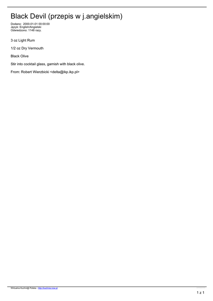 Black Devil (przepis w j.angielskim) Dodano: 2000-01-01 00:00:00 Język: English/Angielski Odwiedzono: 1148 razy. 3 oz Light Rum 1/2 oz Dry Vermouth Black Olive Stir into cocktail glass, garnish with black olive. From: Robert Wierzbicki <[email protected]> Wirtualna Kuchni@ Polska - http://kuchnia.now.pl przepis nr 3735, plik wygenerowano 2017.03.04 09:27 1z1