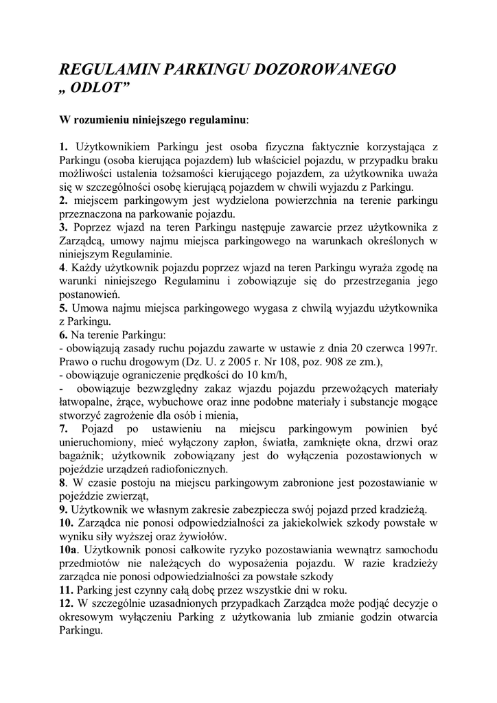 REGULAMIN PARKINGU DOZOROWANEGO „ ODLOT” W rozumieniu niniejszego regulaminu: 1. Użytkownikiem Parkingu jest osoba fizyczna faktycznie korzystająca z Parkingu (osoba kierująca pojazdem) lub właściciel pojazdu, w przypadku braku możliwości ustalenia tożsamości kierującego pojazdem, za użytkownika uważa się w szczególności osobę kierującą pojazdem w chwili wyjazdu z Parkingu. 2. miejscem parkingowym jest wydzielona powierzchnia na terenie parkingu przeznaczona na parkowanie pojazdu. 3. Poprzez wjazd na teren Parkingu następuje zawarcie przez użytkownika z Zarządcą, umowy najmu miejsca parkingowego na warunkach określonych w niniejszym Regulaminie. 4. Każdy użytkownik pojazdu poprzez wjazd na teren Parkingu wyraża zgodę na warunki niniejszego Regulaminu i zobowiązuje się do przestrzegania jego postanowień. 5. Umowa najmu miejsca parkingowego wygasa z chwilą wyjazdu użytkownika z Parkingu. 6. Na terenie Parkingu: - obowiązują zasady ruchu pojazdu zawarte w ustawie z dnia 20 czerwca 1997r. Prawo o ruchu drogowym (Dz. U. z 2005 r. Nr 108, poz. 908 ze zm.), - obowiązuje ograniczenie prędkości do 10 km/h, - obowiązuje bezwzględny zakaz wjazdu pojazdu przewożących materiały łatwopalne, żrące, wybuchowe oraz inne podobne materiały i substancje mogące stworzyć zagrożenie dla osób i mienia, 7. Pojazd po ustawieniu na miejscu parkingowym powinien być unieruchomiony, mieć wyłączony zapłon, światła, zamknięte okna, drzwi oraz bagażnik; użytkownik zobowiązany jest do wyłączenia pozostawionych w pojeździe urządzeń radiofonicznych. 8. W czasie postoju na miejscu parkingowym zabronione jest pozostawianie w pojeździe zwierząt, 9. Użytkownik we własnym zakresie zabezpiecza swój pojazd przed kradzieżą. 10. Zarządca nie ponosi odpowiedzialności za jakiekolwiek szkody powstałe w wyniku siły wyższej oraz żywiołów. 10a. Użytkownik ponosi całkowite ryzyko pozostawiania wewnątrz samochodu przedmiotów nie należących do wyposażenia pojazdu. W razie kradzieży zarządca nie ponosi odpowiedzialności za powstałe szkody 11. Parking jest czynny całą dobę przez wszystkie dni w roku. 12. W szczególnie uzasadnionych przypadkach Zarządca może podjąć decyzje o okresowym wyłączeniu Parking z użytkowania lub zmianie godzin otwarcia Parkingu. 13. W przypadku naruszenia przez użytkownika postanowień niniejszego Regulaminu Zarządca może rozwiązać umowę najmu miejsca parkingowego bez wypowiedzenia w trybie natychmiastowym oraz zastosować środki niezbędne dla przywrócenia stanu zgodnego z Regulaminem, w tym również poprzez usunięcie pojazdu z Parkingu. 14. W przypadkach określonych w punkcie 13 użytkownik zobowiązany jest do pokrycia kosztów związanych z usunięciem pojazdu z Parkingu oraz jego zabezpieczeniem i przechowaniem do czasu odbioru pojazdu przez użytkownika. 15. Użytkownik ponosi odpowiedzialność za wszelkie szkody spowodowane przez pojazd lub powstałe w związku z korzystaniem z miejsca parkingowego, w szczególności z tytułu zanieczyszczenia powierzchni parkingu na skutek wycieku płynów z pojazdu (wyciek oleju, płynu hamulcowego, płynu chłodniczego itp.). 16. Cena za pozostawienie pojazdu na parkingu podana jest w cenniku opłat za parkowanie. 17. Kontrola spełnienia warunków umowy najmu miejsca parkingowego przeprowadzana jest przy wjeździe i wyjeździe z Parkingu w strefie kontroli przez osoby upoważnione przez Zarządcę. 18. Użytkownik wjeżdżający i wyjeżdżający z Parkingu zobowiązany jest do zatrzymania pojazdu w strefie kontroli. 19. Na żądanie obsługi parkingu użytkownik zobowiązany jest okazać dowód rejestracyjny pojazdu. 20. Osobami upoważnionymi do pobierania opłaty parkingowej oraz kontroli dokumentów są osoby uprawnione przez Zarządcę. 21. Użytkownicy mają obowiązek stosowania się do poleceń wydawanych przez zarządcę. 22. Obsłudze parkingu należy zgłosić uwagi dotyczące stanu technicznego pojazdu, mogące budzić wątpliwości przy odbiorze. Na terenie Parkingu zabronione jest: 1. palenie tytoniu, 2. spożywanie alkoholu, 3. przebywanie osób, o ile nie jest to związane z wyjściem z Parkingu po zaparkowaniu pojazdu lub dojściem do zaparkowanego pojazdu celem opuszczenia Parkingu, 4. zaśmiecanie, 5. niszczenie urządzeń, 6. naprawianie, mycie i odkurzanie pojazdów, 7. tankowanie pojazdów, 8. używanie otwartego ognia, 9. parkowanie pojazdów z nieszczelnymi układami powodującymi wycieki, 10. wymiana lub uzupełnianie płynów w pojazdach - cieczy chłodzącej, oleju itp., 11. magazynowanie paliw, substancji łatwopalnych i pustych pojemników po paliwie, 12. działanie niezgodne z przepisami BHP i PPOś, 13. zachowanie sprzeczne z zasadami współżycia społecznego lub zakłócające korzystanie z Parkingu. Wszelkie skargi i wnioski związane z korzystaniem z parkingu należy zgłaszać do zarządcy Parkingu „ODLOT” mieszczącego się przy ulicy Wolności 16a, 42625 Pyrzowice.