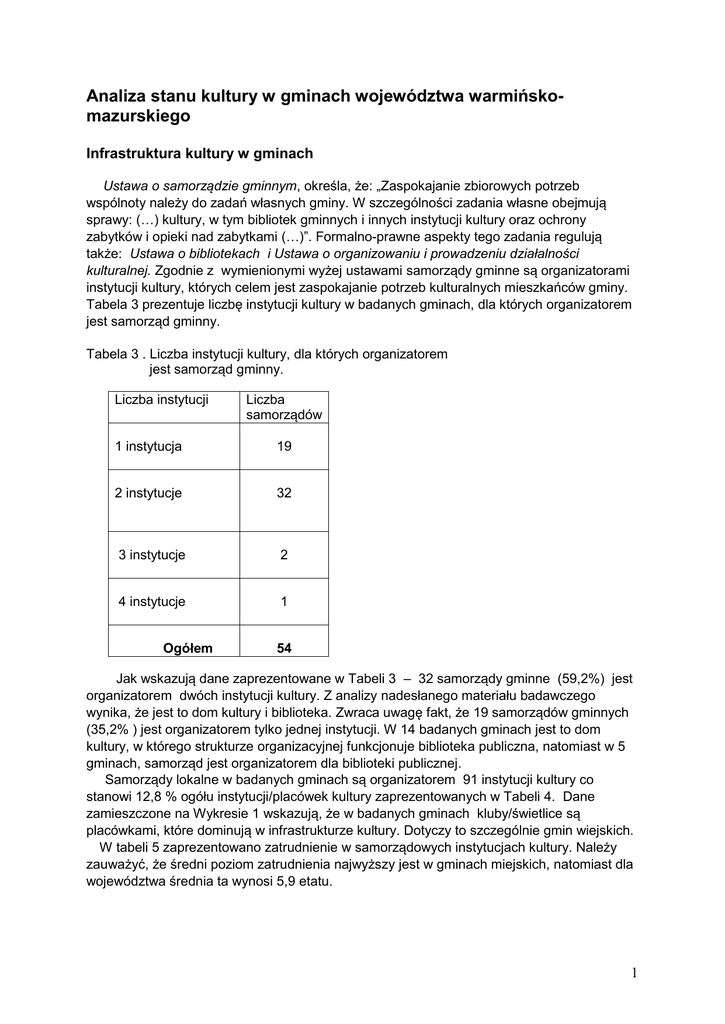 Analiza stanu kultury w gminach województwa warmińskomazurskiego Infrastruktura kultury w gminach Ustawa o samorządzie gminnym, określa, że: „Zaspokajanie zbiorowych potrzeb wspólnoty należy do zadań własnych gminy. W szczególności zadania własne obejmują sprawy: (…) kultury, w tym bibliotek gminnych i innych instytucji kultury oraz ochrony zabytków i opieki nad zabytkami (…)”. Formalno-prawne aspekty tego zadania regulują także: Ustawa o bibliotekach i Ustawa o organizowaniu i prowadzeniu działalności kulturalnej. Zgodnie z wymienionymi wyżej ustawami samorządy gminne są organizatorami instytucji kultury, których celem jest zaspokajanie potrzeb kulturalnych mieszkańców gminy. Tabela 3 prezentuje liczbę instytucji kultury w badanych gminach, dla których organizatorem jest samorząd gminny. Tabela 3 . Liczba instytucji kultury, dla których organizatorem jest samorząd gminny. Liczba instytucji Liczba samorządów 1 instytucja 19 2 instytucje 32 3 instytucje 2 4 instytucje 1 Ogółem 54 Jak wskazują dane zaprezentowane w Tabeli 3 – 32 samorządy gminne (59,2%) jest organizatorem dwóch instytucji kultury. Z analizy nadesłanego materiału badawczego wynika, że jest to dom kultury i biblioteka. Zwraca uwagę fakt, że 19 samorządów gminnych (35,2% ) jest organizatorem tylko jednej instytucji. W 14 badanych gminach jest to dom kultury, w którego strukturze organizacyjnej funkcjonuje biblioteka publiczna, natomiast w 5 gminach, samorząd jest organizatorem dla biblioteki publicznej. Samorządy lokalne w badanych gminach są organizatorem 91 instytucji kultury co stanowi 12,8 % ogółu instytucji/placówek kultury zaprezentowanych w Tabeli 4. Dane zamieszczone na Wykresie 1 wskazują, że w badanych gminach kluby/świetlice są placówkami, które dominują w infrastrukturze kultury. Dotyczy to szczególnie gmin wiejskich. W tabeli 5 zaprezentowano zatrudnienie w samorządowych instytucjach kultury. Należy zauważyć, że średni poziom zatrudnienia najwyższy jest w gminach miejskich, natomiast dla województwa średnia ta wynosi 5,9 etatu. 1 Tabela 4 . Instytucje/placówki kultury w badanych gminach. Liczba instytucji i obiektów kultury Ogółem Gmina Gmina Gmina miejska miejskowiejska wiejska Typ gminy Rodzaj instytucji Centrum, dom, ośrodek kultury 57 13 13 31 Biblioteka 110 25 26 59 Kino 13 5 6 2 Teatr 1 1 0 0 Klub/świetlica 411 13 144 254 Księgarnia 50 26 23 1 Muzeum/izba regionalna 33 5 8 20 11 10 6 6 3 2 1 708 102 232 374 27 Galeria /salon sztuki Ognisko artystyczne Ogółem Tabela 5. Zatrudnienie w samorządowych instytucji kultury Liczba Pracownicy działalności podstawowej zatrudnieni w samorządowych instytucjach kultury – w przeliczeniu na pełne etaty Liczba Gmina miejska 191 180,26 11,26 Gmina miejsko-wiejska 161 139,09 5,56 Gmina wiejska 284 217,78 4,35 Pracownicy działalności podstawowej zatrudnieni w samorządowych instytucjach kultury Typ gminy Średnia liczba etatów w samorządowych instytucjach kultury Liczba 2 Ogółem 636 537,13 5,9 3 WYKRES 1: Liczba instytucji/placówek kultury w gminach biorących udział w badaniu. 1 Teatr 6 Ognisko artystyczne 13 Kino 27 Galeria /salon sztuki 33 Muzeum/izba regionalna Księgarnia 50 Centrum, dom, ośrodek kultury 57 110 Biblioteka Klub/świetlica 411 0 100 200 300 400 Rodzaj instytucji / placówki 4 Infrastruktura społeczna W Tabeli 5. prezentujemy liczbę instytucji/placówek, obiektów, które tworzą infrastrukturę społeczną w badanych gminach. Infrastruktura ta obejmuje instytucje świadczące usługi w zakresie oświaty i wychowania, komunikacji społecznej, upowszechniania kultury fizycznej. Stanowi ona wraz z instytucjami/placówkami kultury organizacjami pozarządowymi istotny element zaspokajania potrzeb mieszkańców gmin Warmii i Mazur. Jak wynika z danych (Tab.5) w tej infrastrukturze dominują obiekty sportowe. Tabela 5. Instytucje / placówki, obiekty użyteczności publicznej. Typ gminy Instytucje, obiekty Liczba instytucji/placówek, obiektów Ogółem Gmina Gmina Gmina miejska miejsko- wiejska wiejska Przedszkole 144 59 36 49 Szkoła podstawowa 253 38 86 129 Gimnazjum 118 31 37 50 Szkoła średnia 72 35 31 6 Szkoła artystyczna 8 5 3 – Szkoła wyższa 12 7 5 – Obiekty sportowe (np. boiska/hale sportowe/ pływalnie itp.) 387 91 112 184 Sala/hala widowiskowa 45 13 7 25 Amfiteatr 17 5 5 7 Gazeta lokalna 43 18 14 11 Radio lokalne 11 6 2 3 Telewizja lokalna 14 8 4 2 WYKRES 2: Liczba instytucji/placówek, obiektów użyteczności publicznej w badanych gminach. Szkoła artystyczna 8 Radio lokalne 11 Szkoła wyższa 12 14 Telewizja lokalna 17 Amfiteatr 43 Gazeta lokalna Sala/hala widowiskowa 45 Szkoła średnia 72 118 Gimnazjum 144 Przedszkole Szkoła podstawowa 253 387 Obiekty sportowe 0 100 200 300 400 Rodzaj instytucji/placówki, obiektu użytecznośći publicznej Organizacje pozarządowe (NGO) Organizacje pozarządowe funkcjonujące w obszarze kultury stanowią ważny element, infrastruktury społecznej i kulturalnej gmin. W niniejszym opracowaniu poświęcamy im osobne miejsce. Jak wynika z danych prezentowanych w Tabeli 8 na terenie badanych gmin funkcjonuje 300 (22,6%) organizacji, których obszarem zainteresowania jest kultura, sztuka, ochrona dziedzictwa kulturowego. Należy zauważyć, że największa ich liczba funkcjonuje w gminach miejskich, a najmniej tych organizacji jest w gminach wiejskich, w których z kolei najwięcej jest Ochotniczych Straży Pożarnych (OSP) zaliczanych także do sektora organizacji pozarządowych. Samorządy gminne zgodnie z Ustawą o działalności pożytku publicznego i wolontariacie zobowiązane są do współpracy z organizacjami pozarządowymi. Ta współpraca może występować w formie pozafinansowej oraz w formie zlecania zadań. Z otrzymanych danych wynika, że 24 samorządy gminne (48%) nie przewidziało w swoich wydatkach budżetowych ( dział 921 - Kultura i ochrona dziedzictwa narodowego) żadnych środków finan